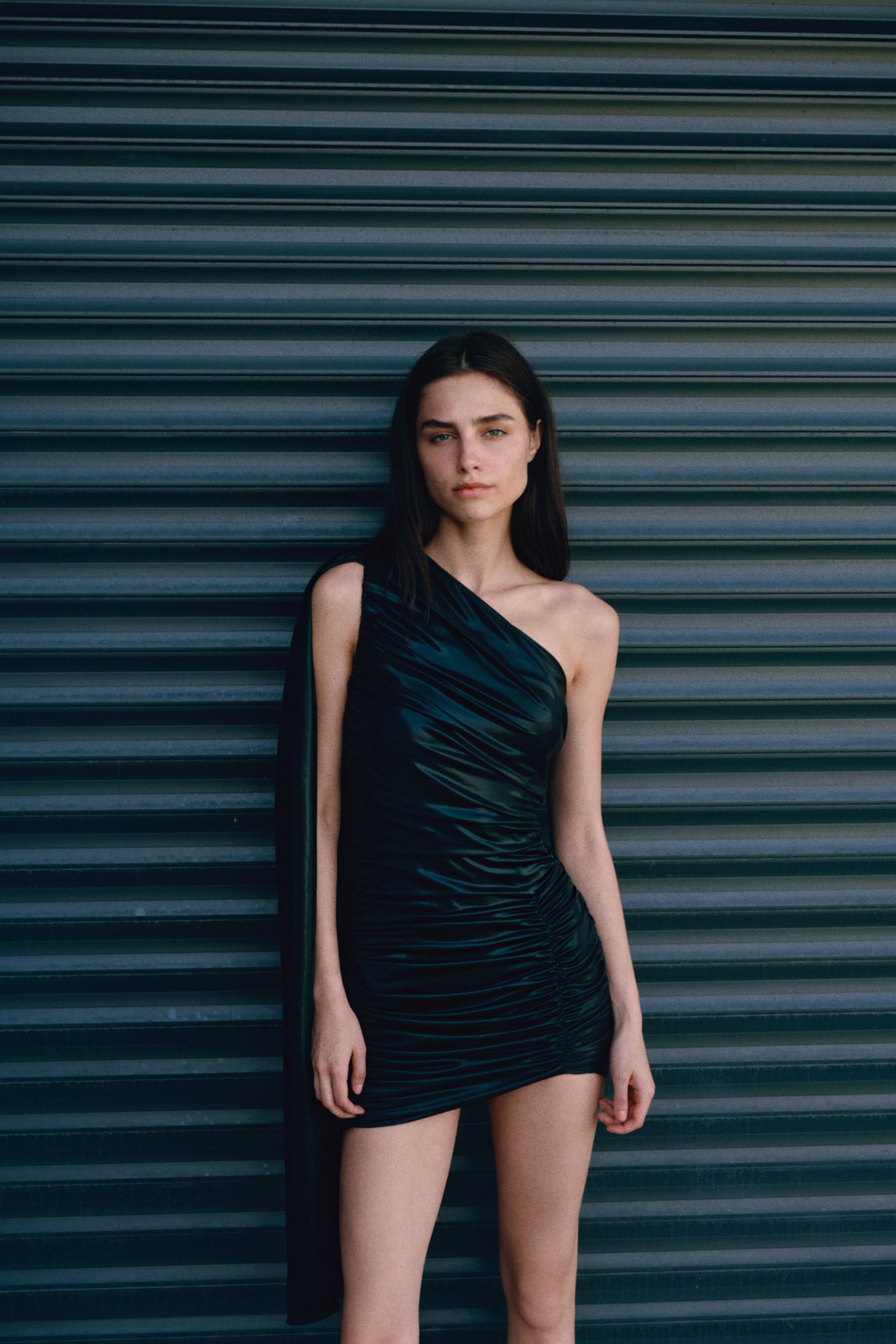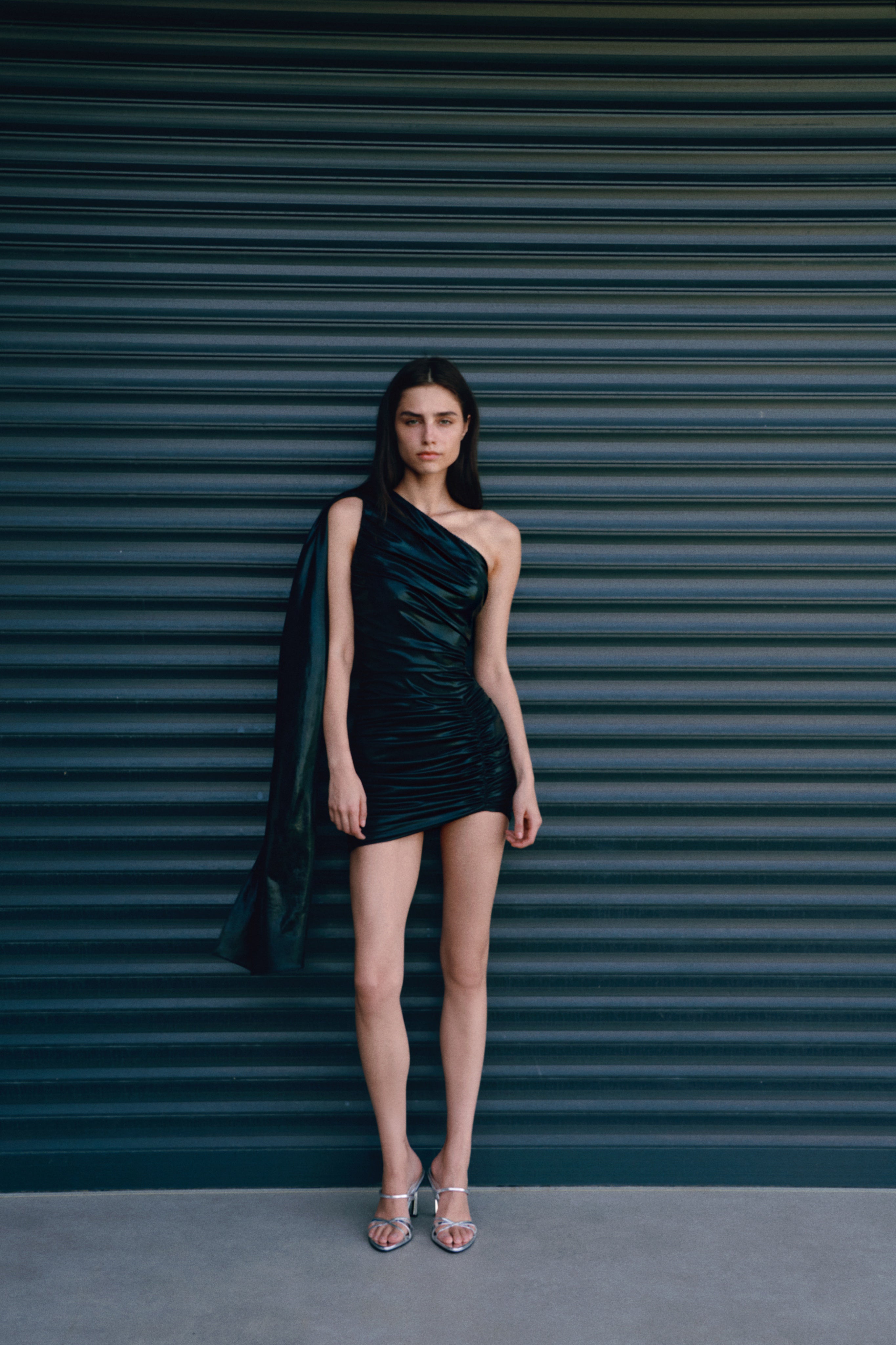 Tüm bedeni büzgü detaylı, omzu bağcıklı mini elbise.