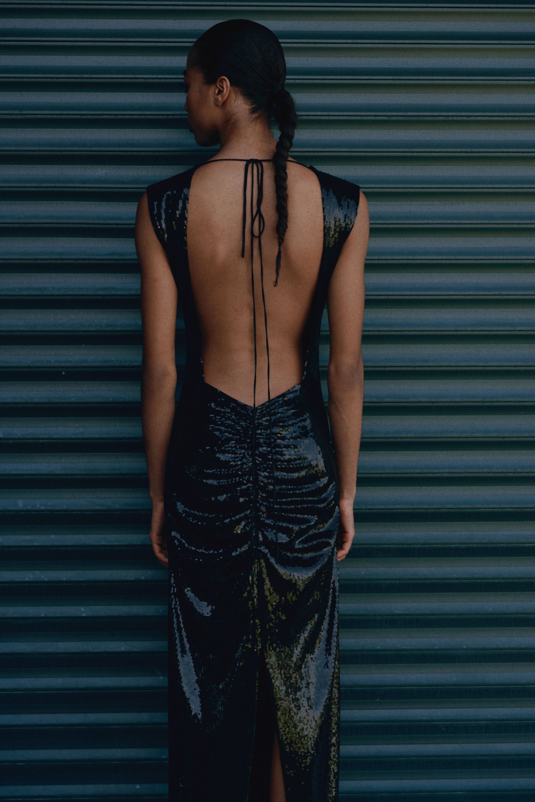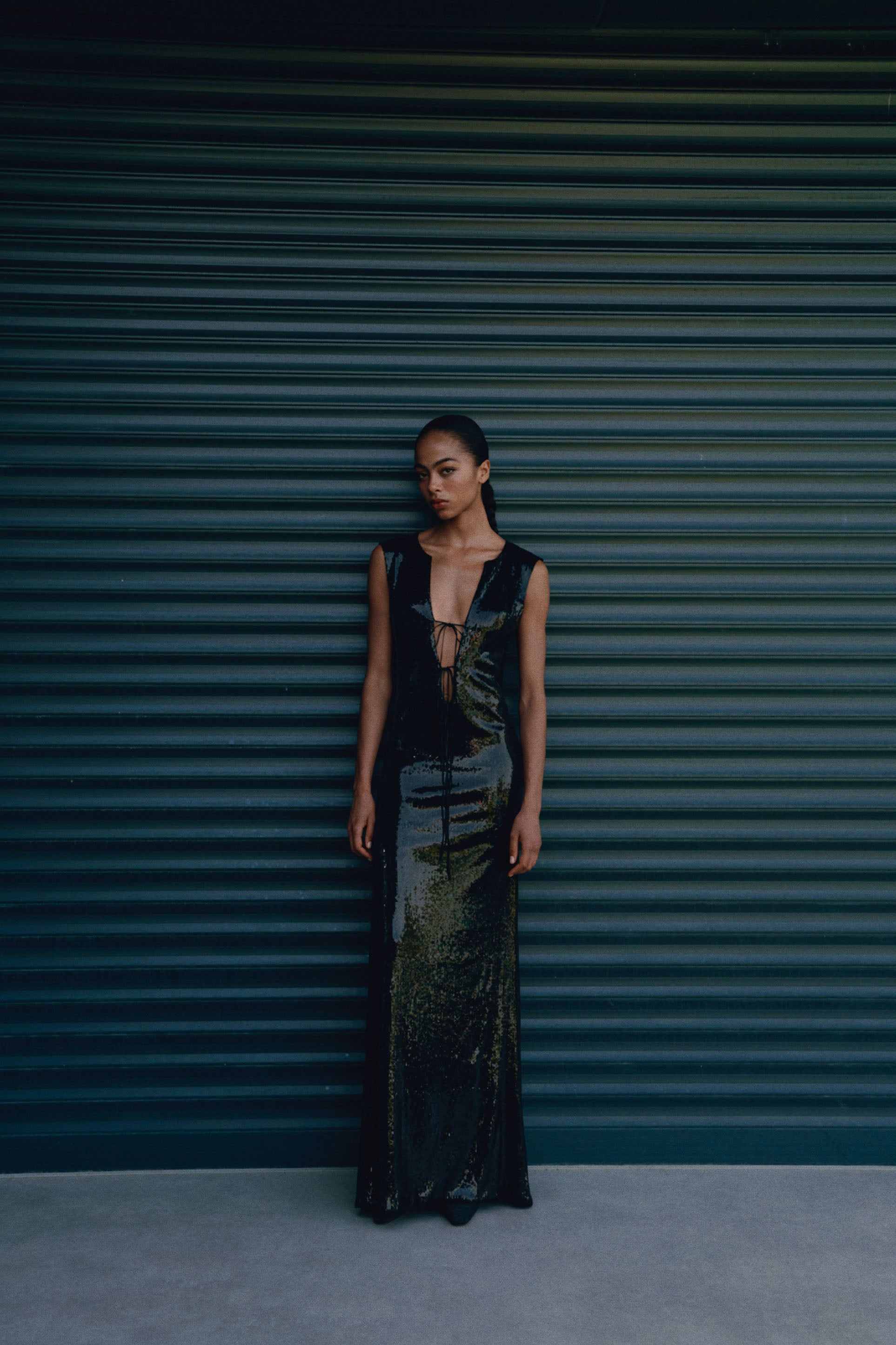 Yakası derin V kesim ve bağcık detaylı, sırt dekolteli uzun elbise.