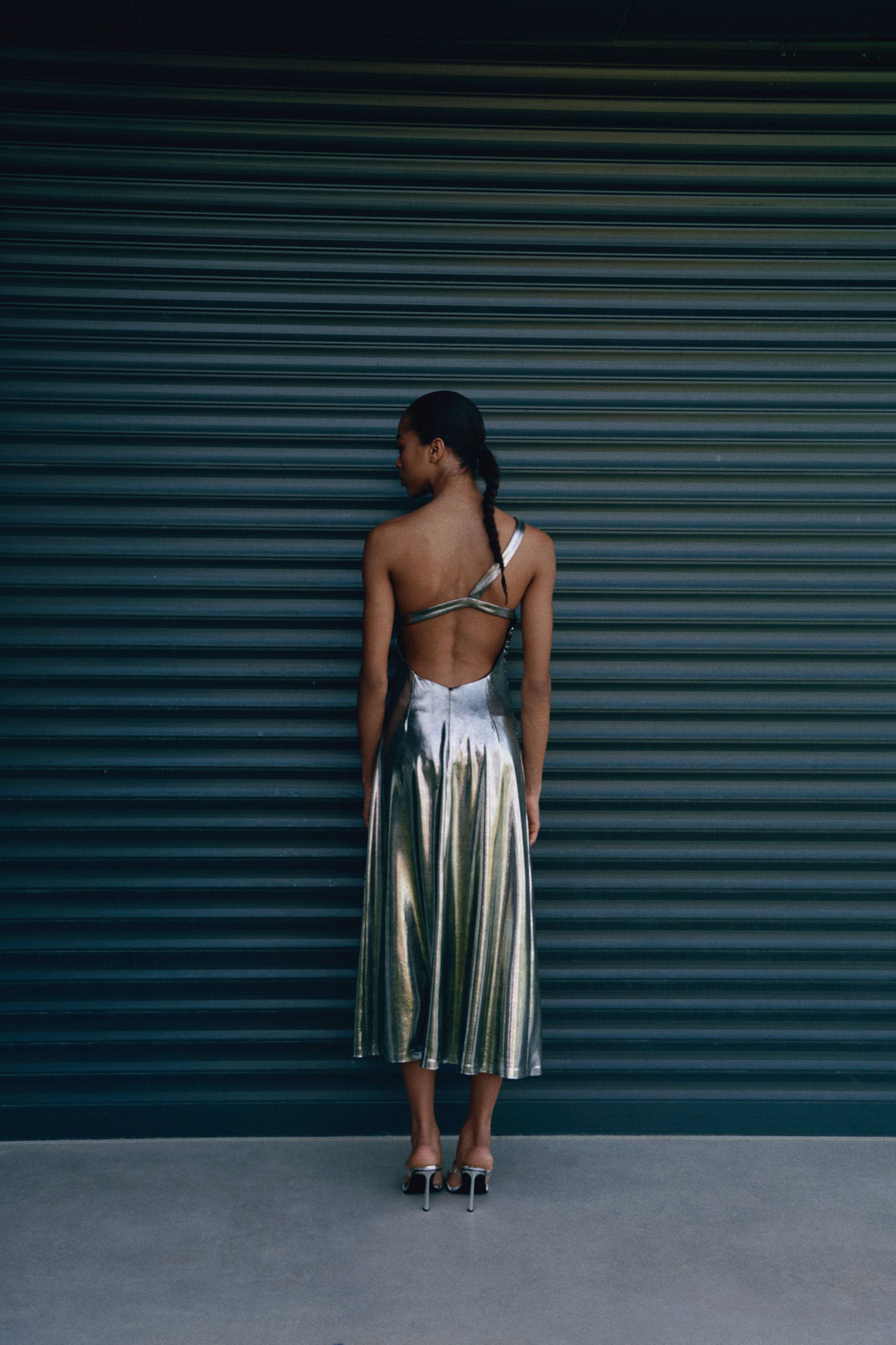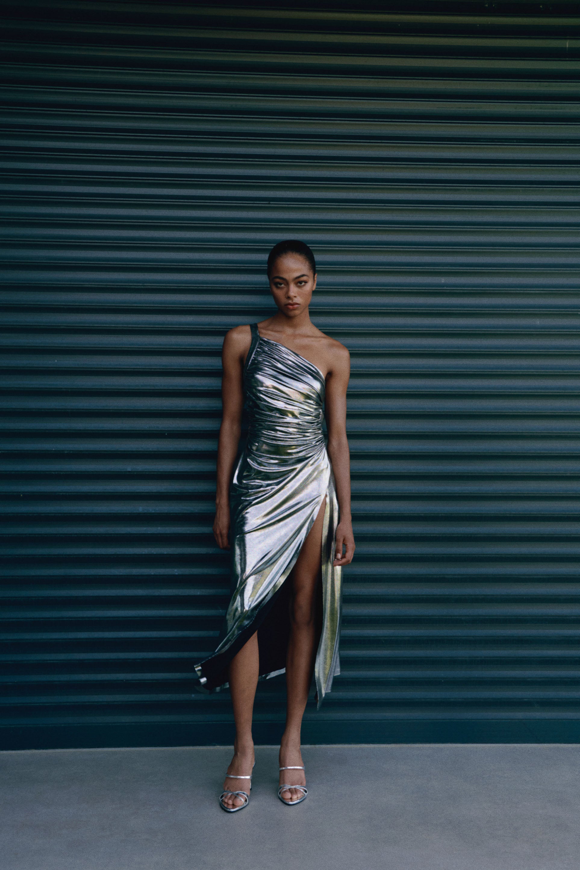 Tek omuzlu, drape ve yırtmaçlı, sırt dekolteli midi elbise.