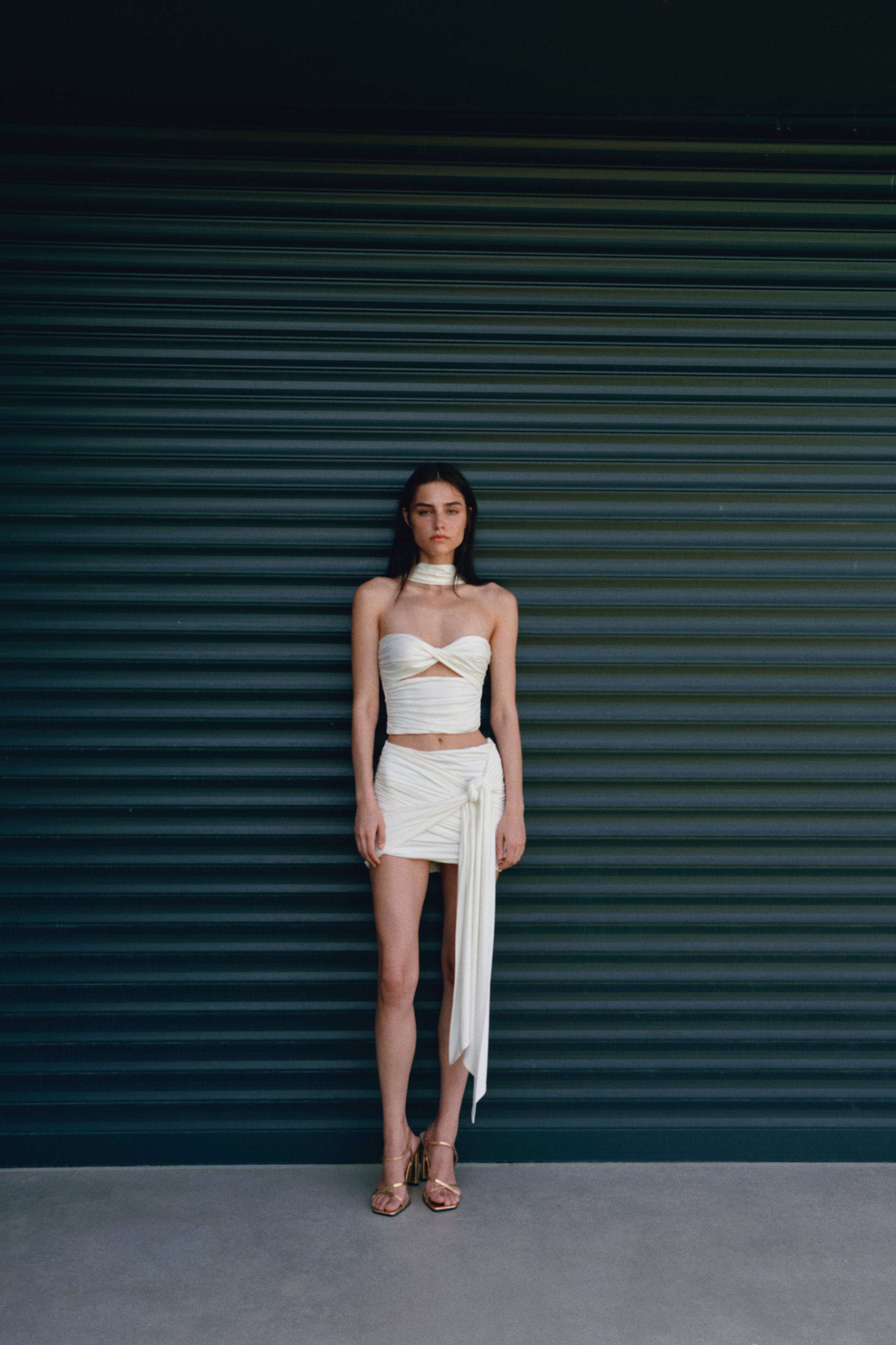 Büzgülü ve boyun bağı detaylı top, düğüm detaylı büzgülü mini etek.