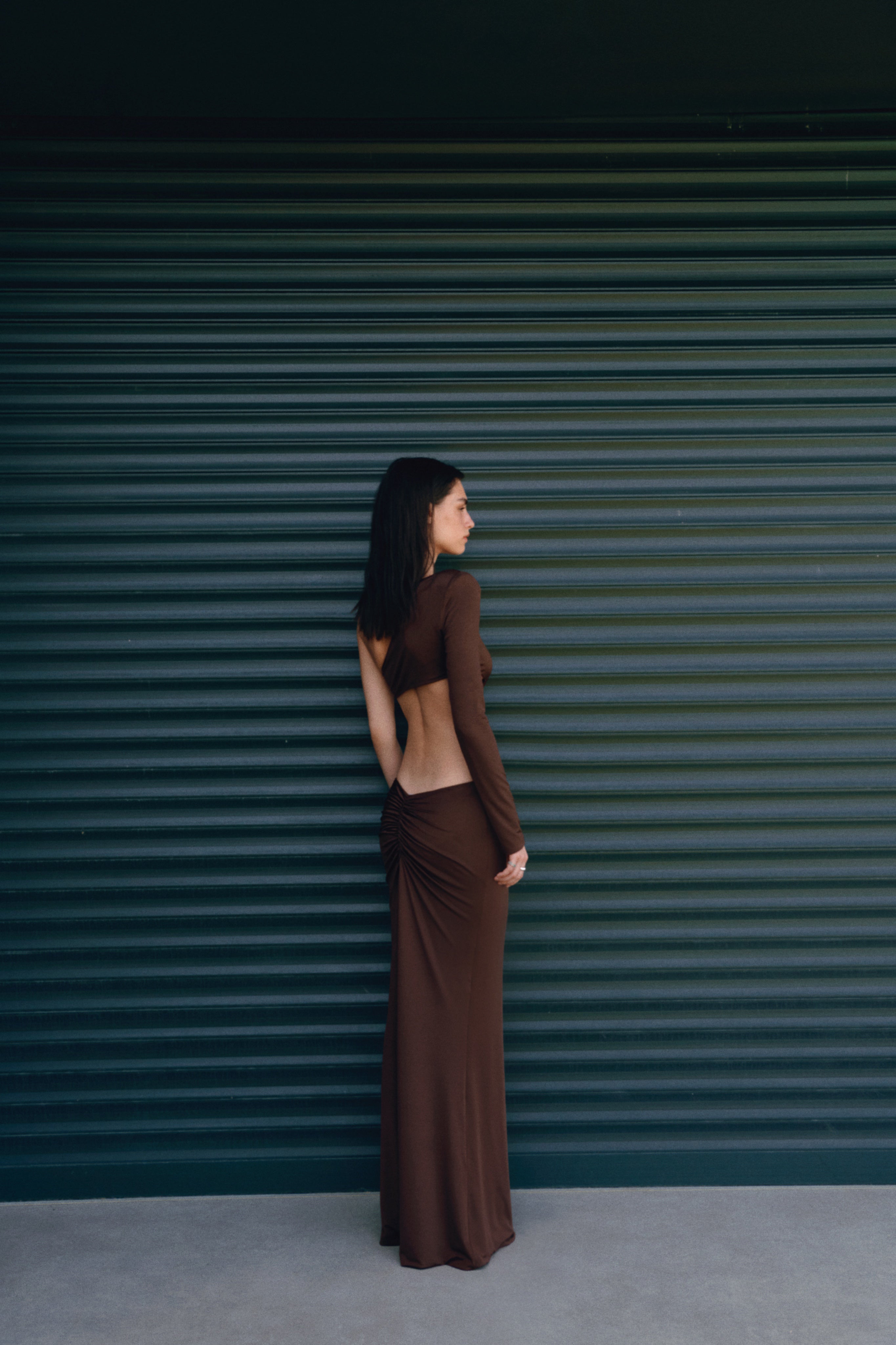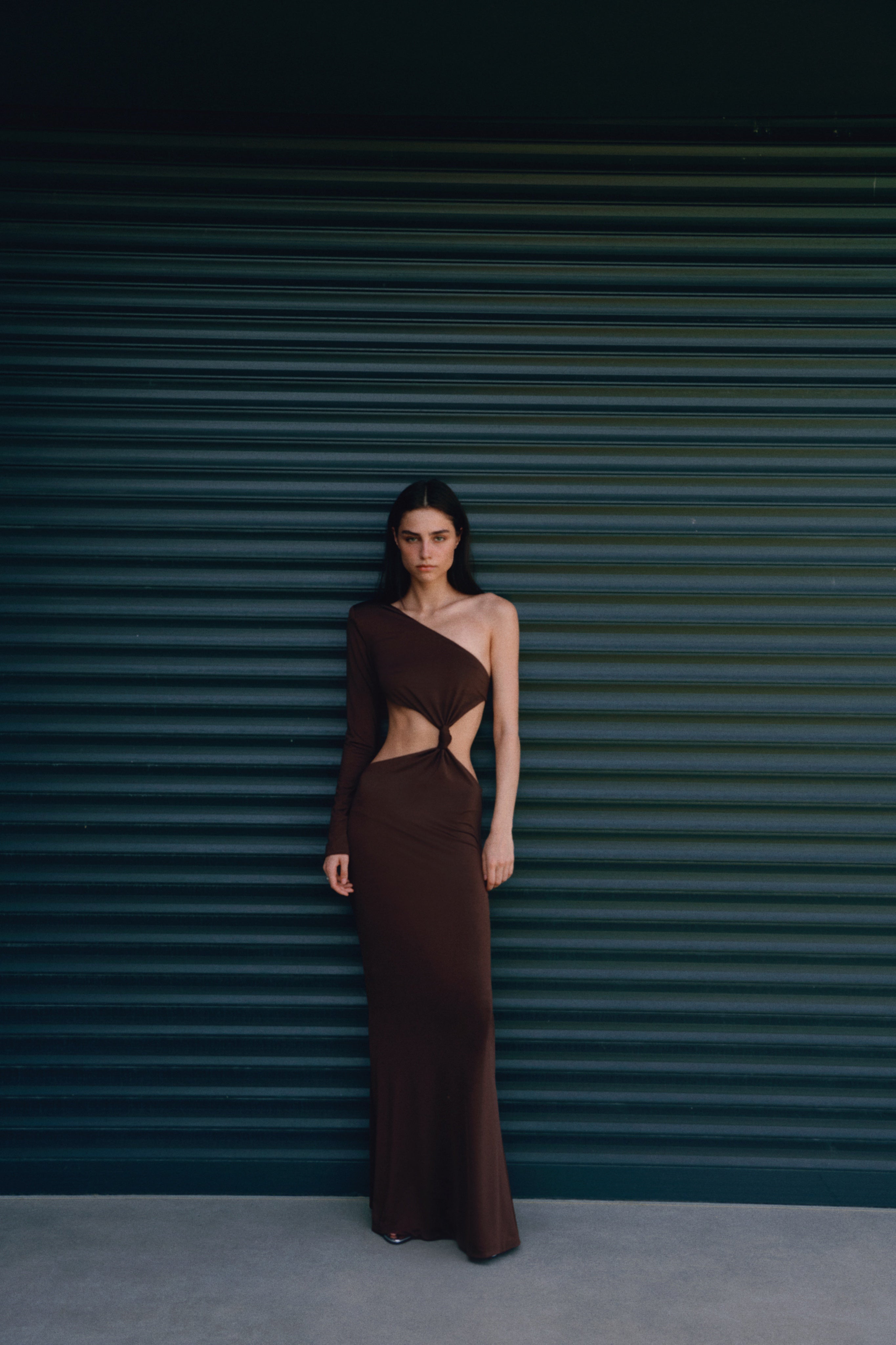 Tek kollu, önü düğüm detaylı, sırt dekolteli maxi elbise.