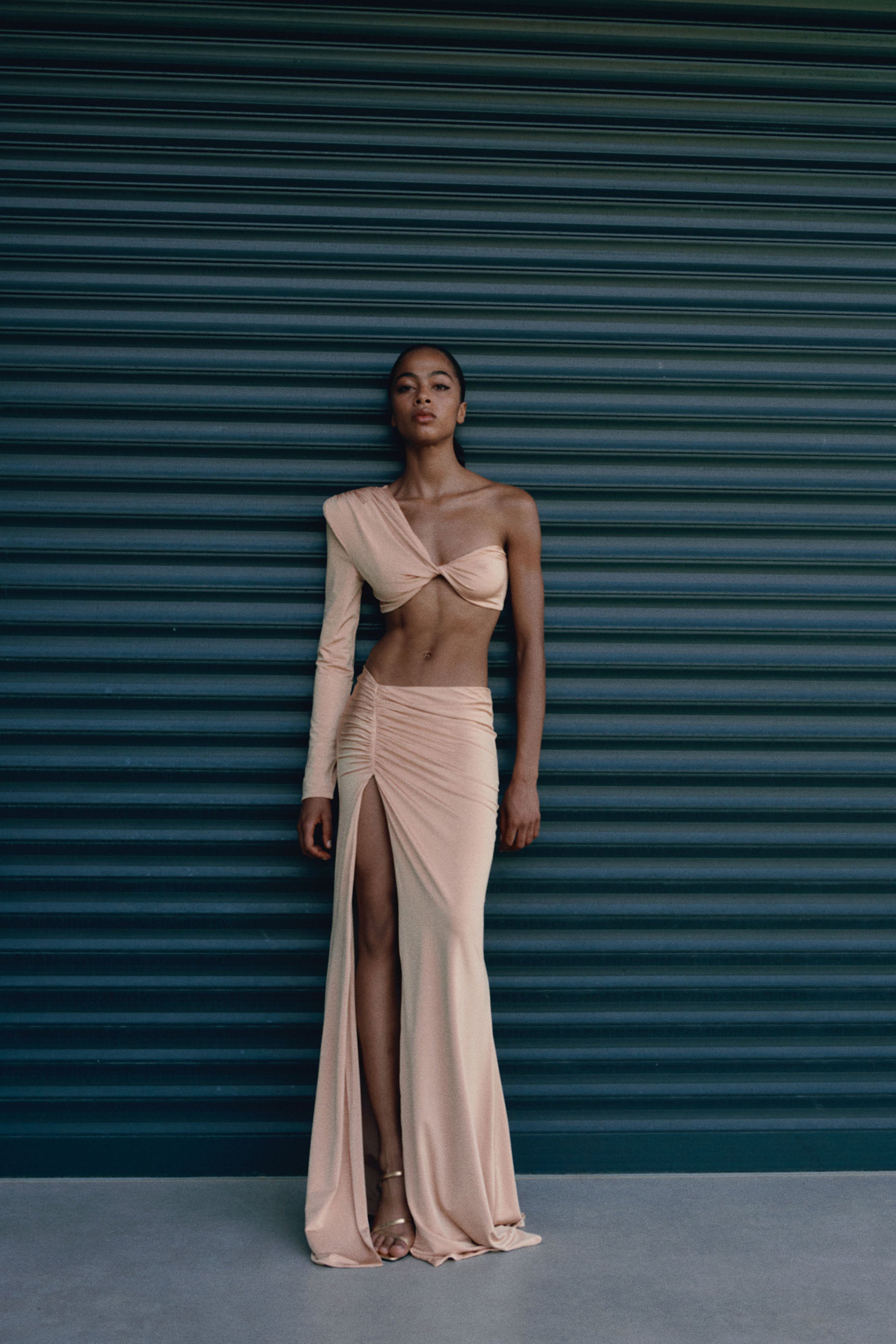 Tek kollu ve vatkalı, önü düğüm detaylı crop top. Büzgü ve yırtmaç detaylı uzun etek.