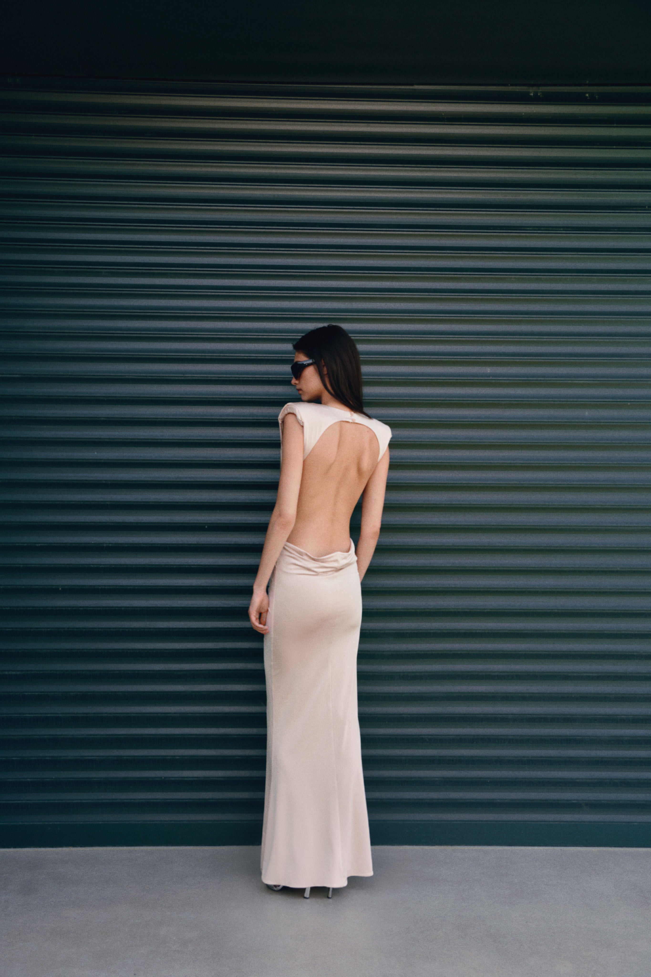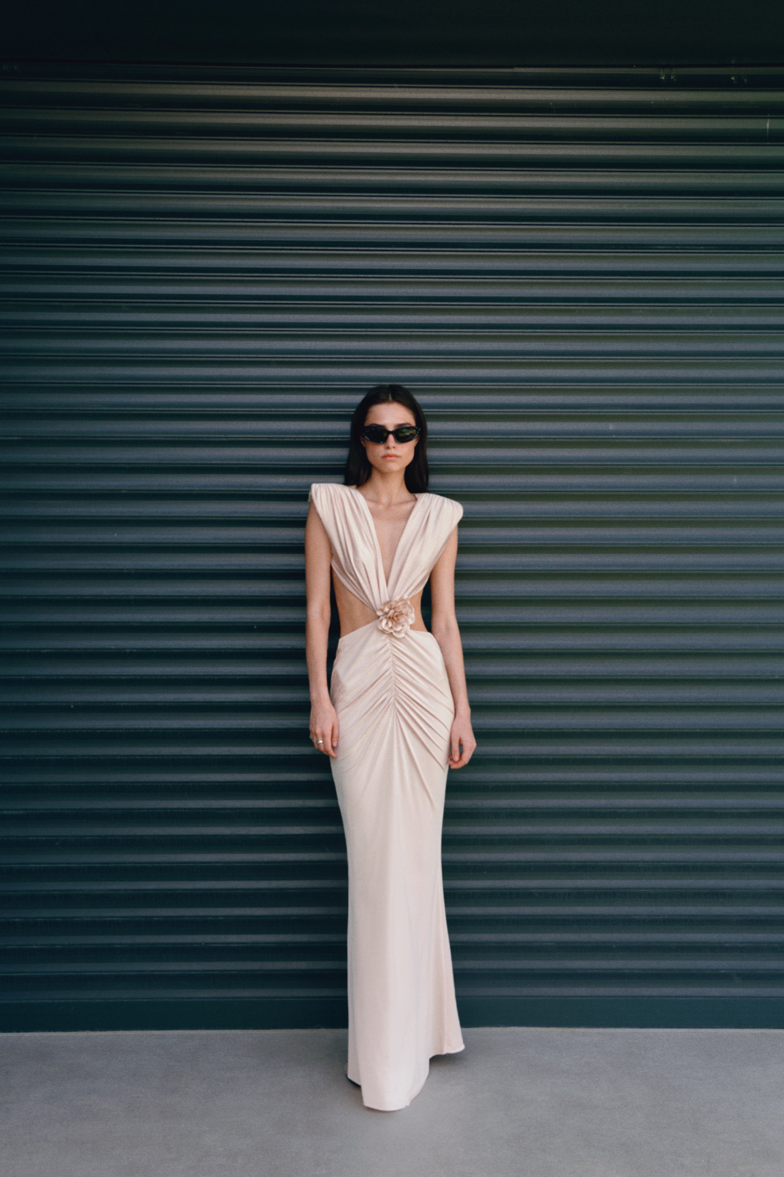 Omuzları vatkalı, sırt dekolteli ve drape detaylı, çıkarılabilir gül aksesuarlı maxi elbise.