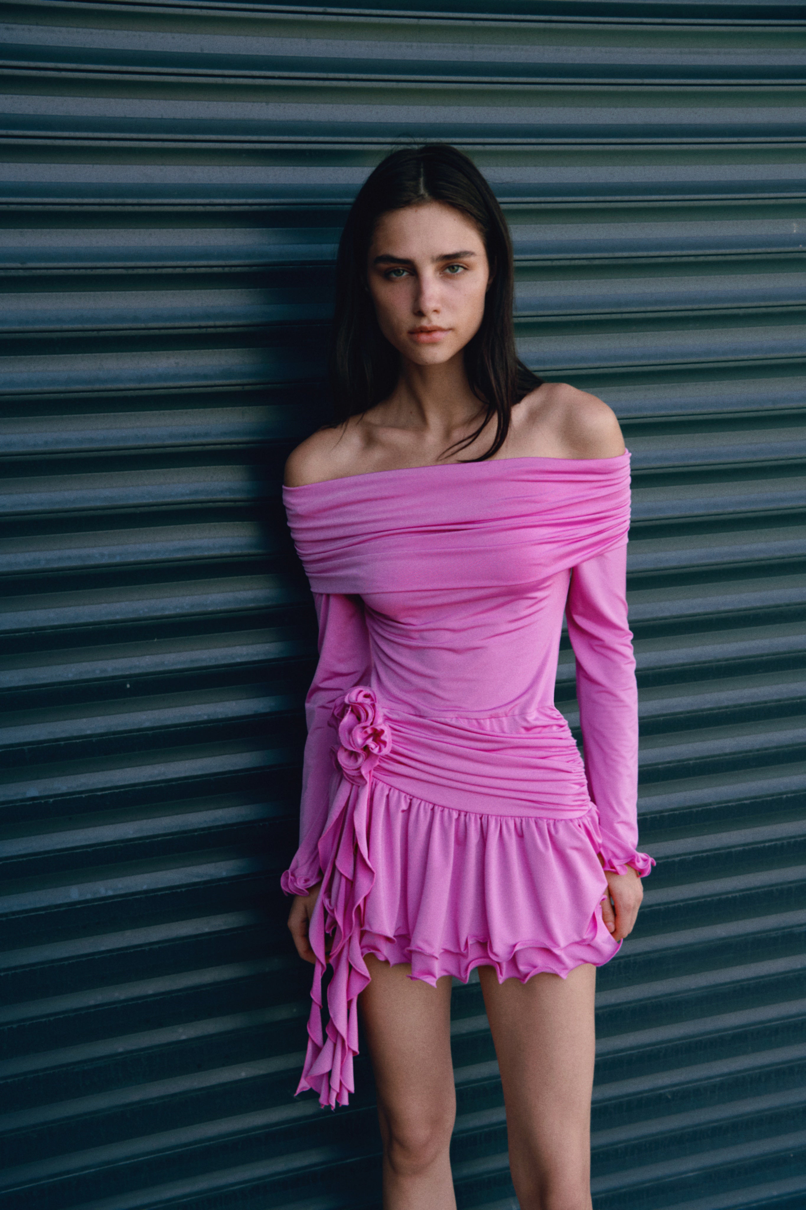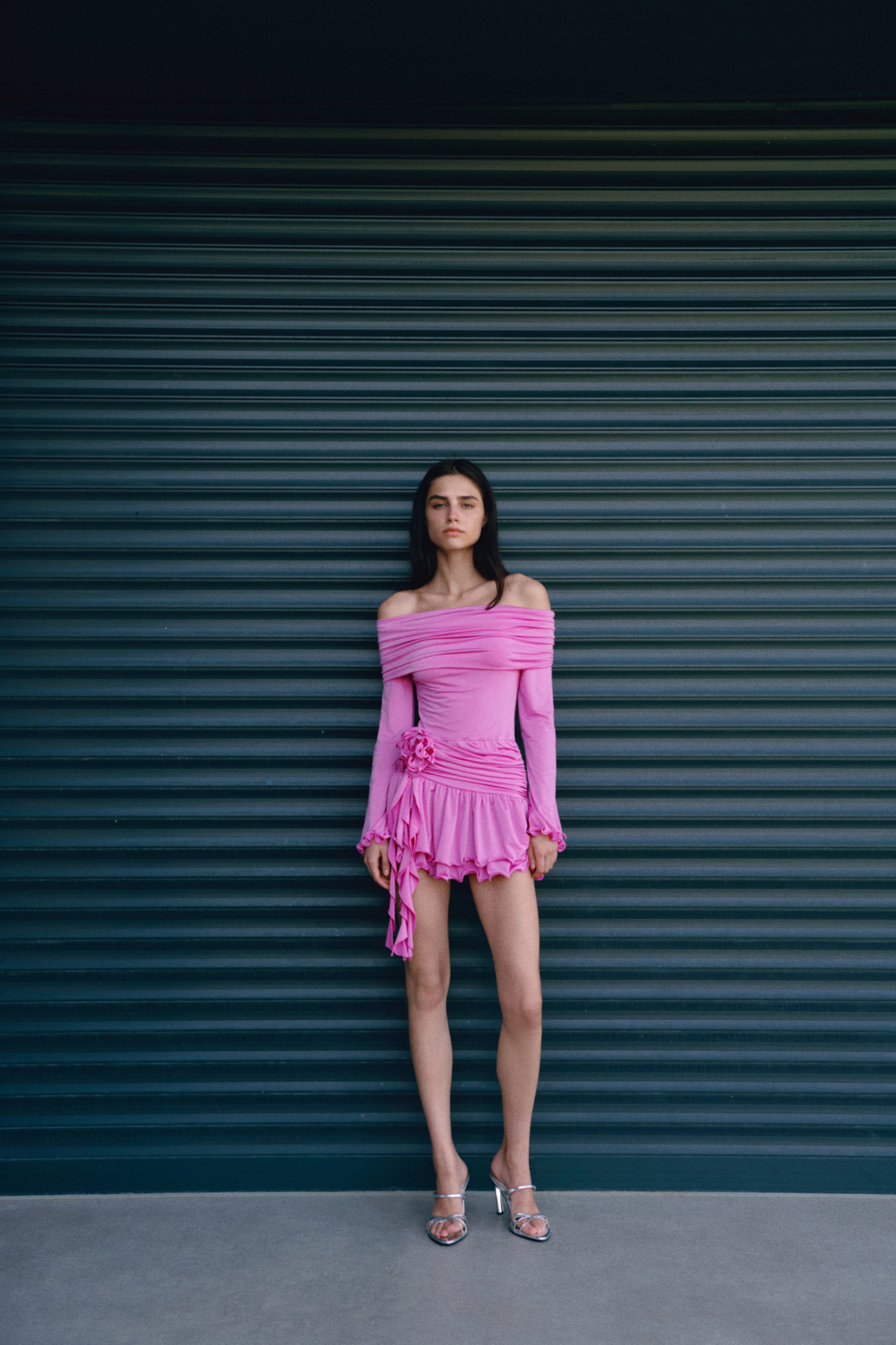 Omuzları açık, volanlı, etek ucu fırfır detaylı mini elbise.