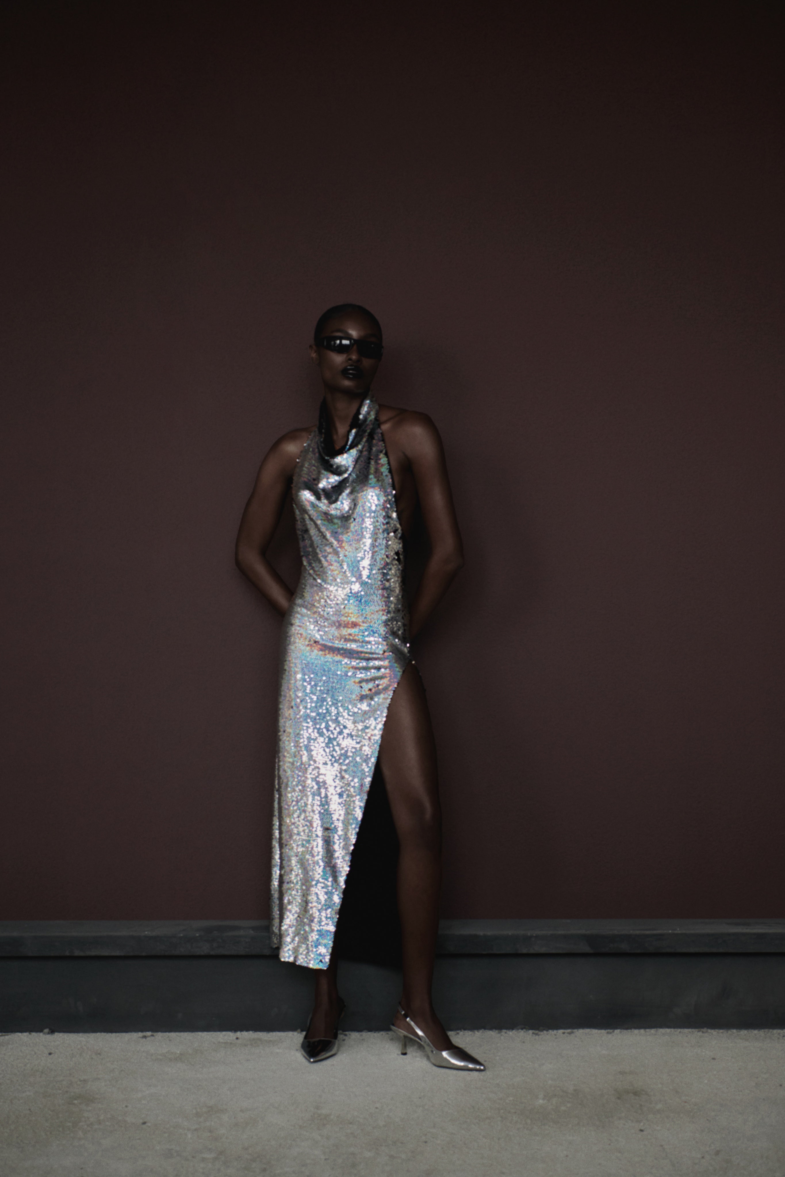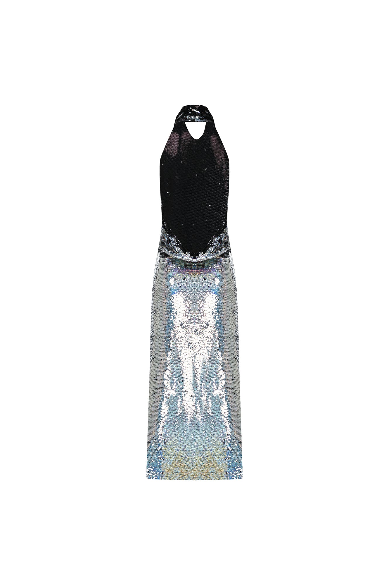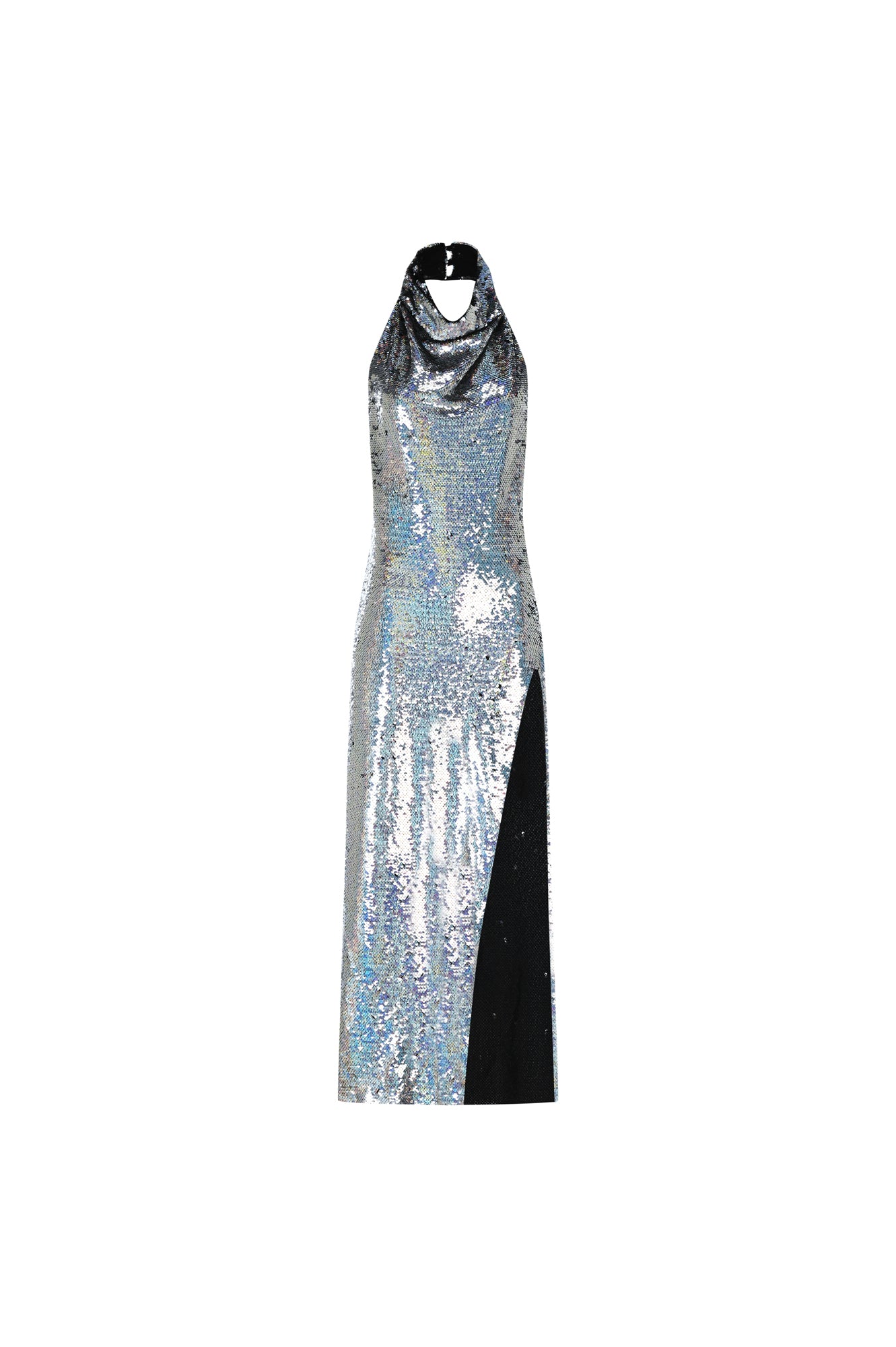 Degaje halter yakalı, sırt dekolteli, yırtmaçlı midi elbise.