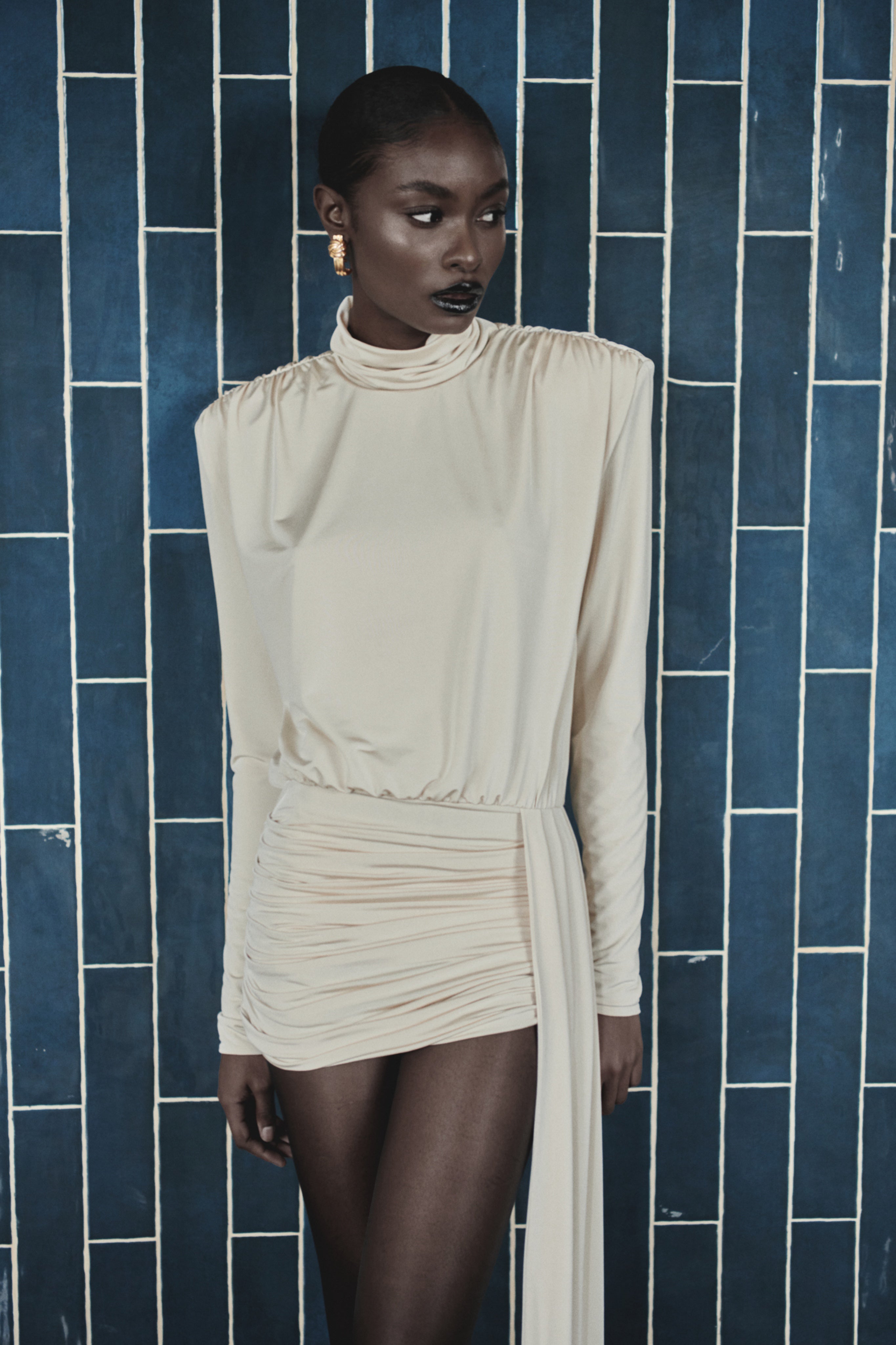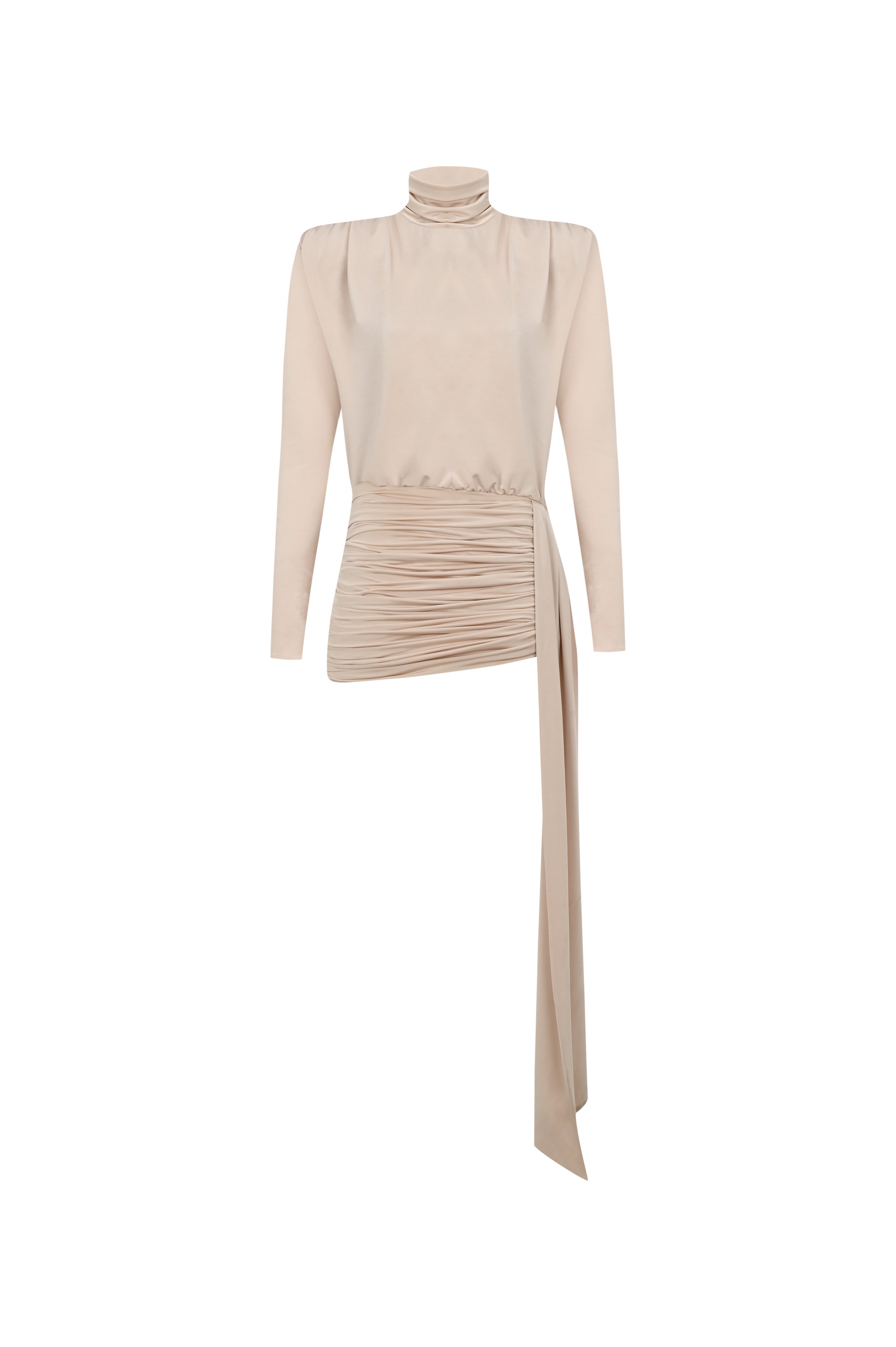 Vatkalı, boğazlı, kuşak detaylı asimetrik, drape mini elbise.