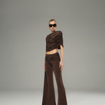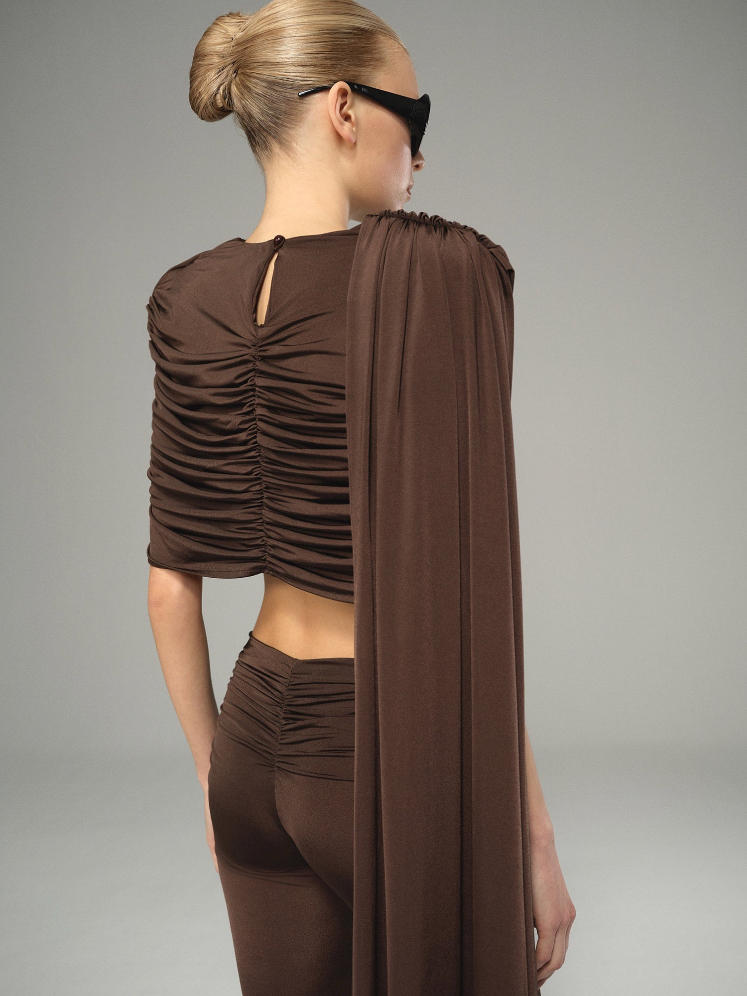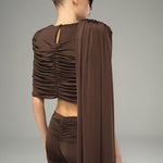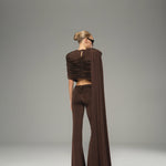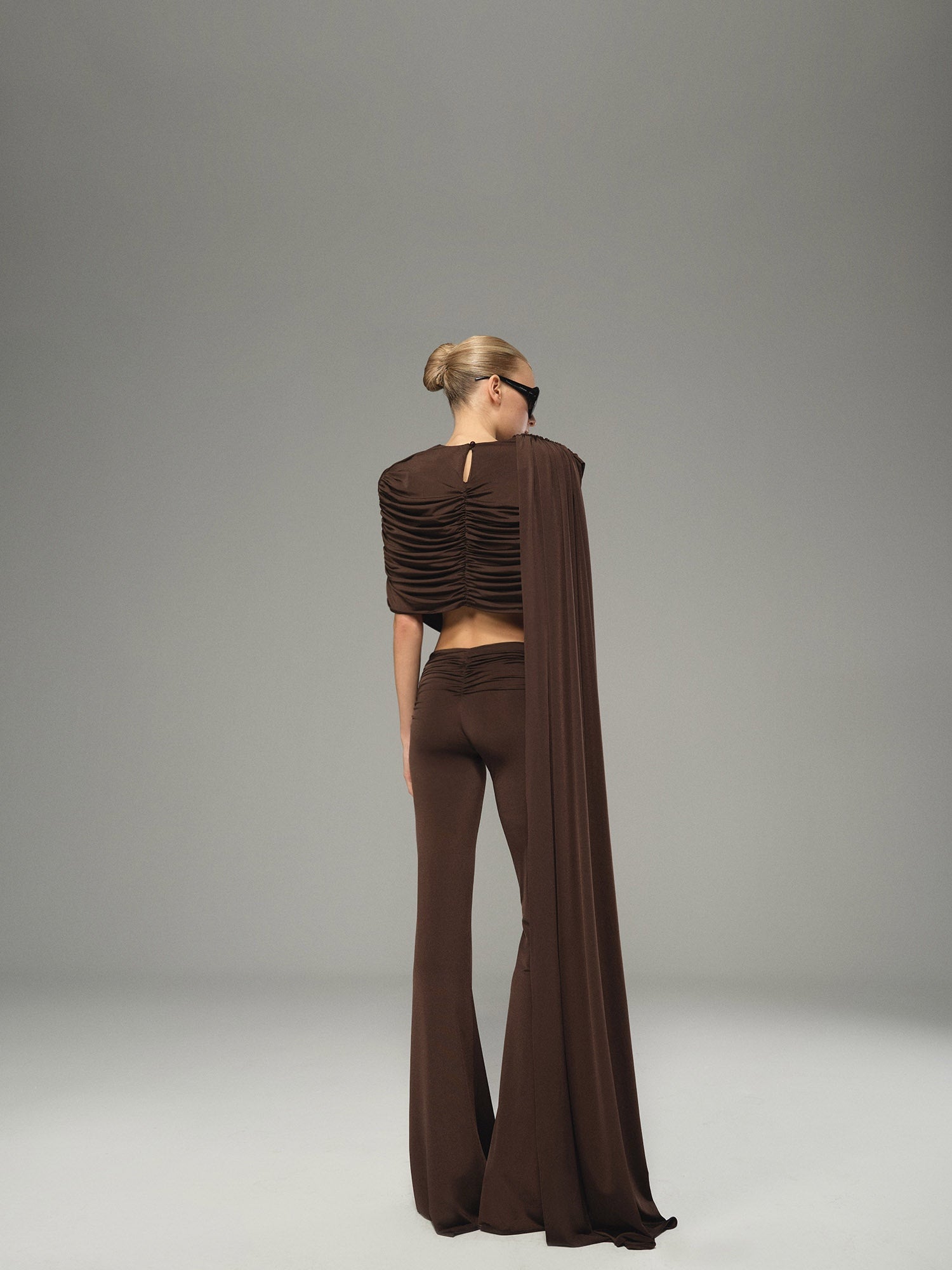 Drapeli, vatkalı, pelerin detaylı üst ve orta bel, geniş paça pantolon
