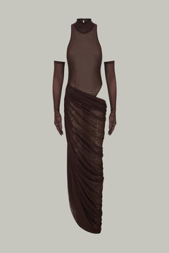 Tül bodysuit ile birlikte belden dökümlü etek ve tül eldiven