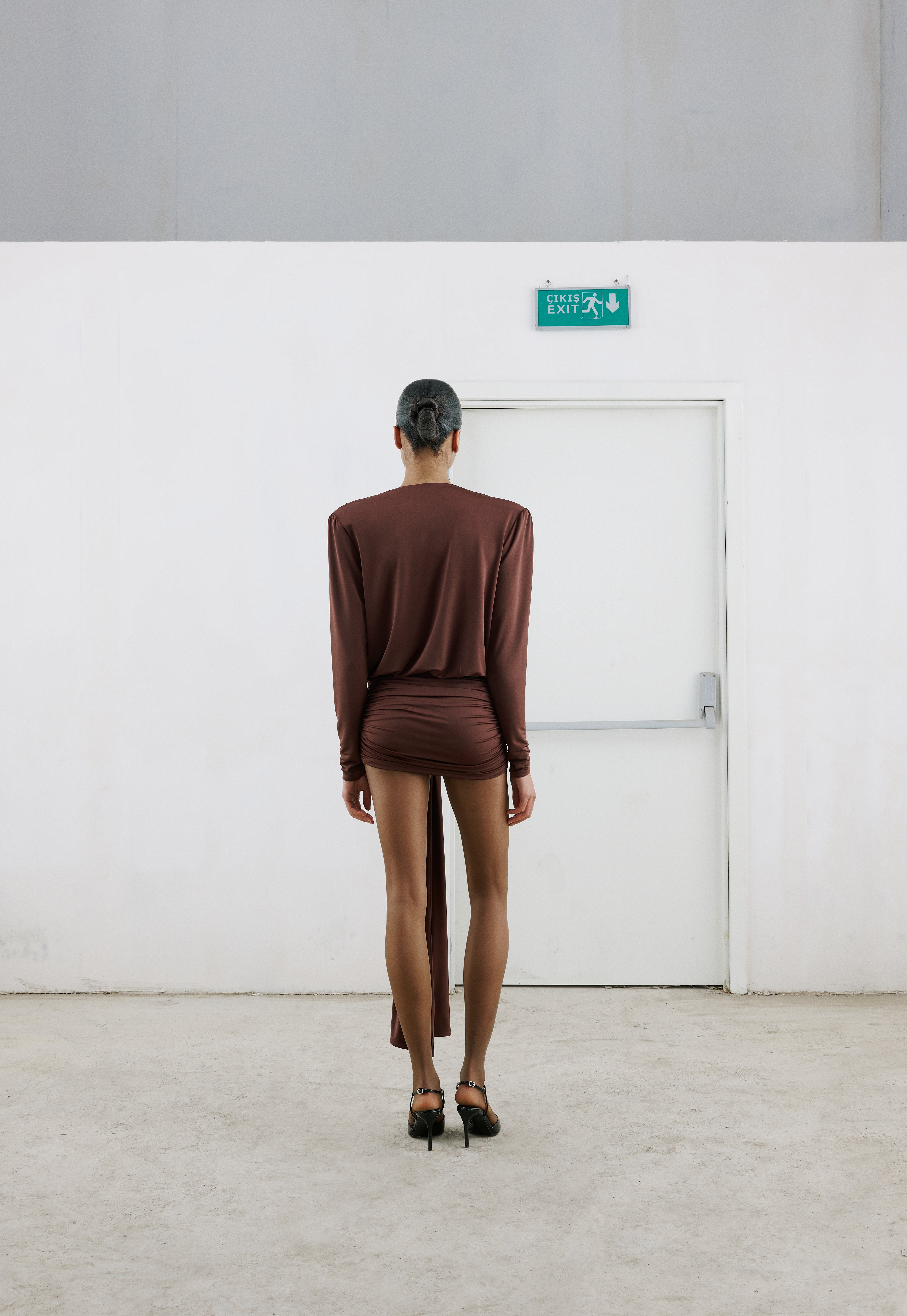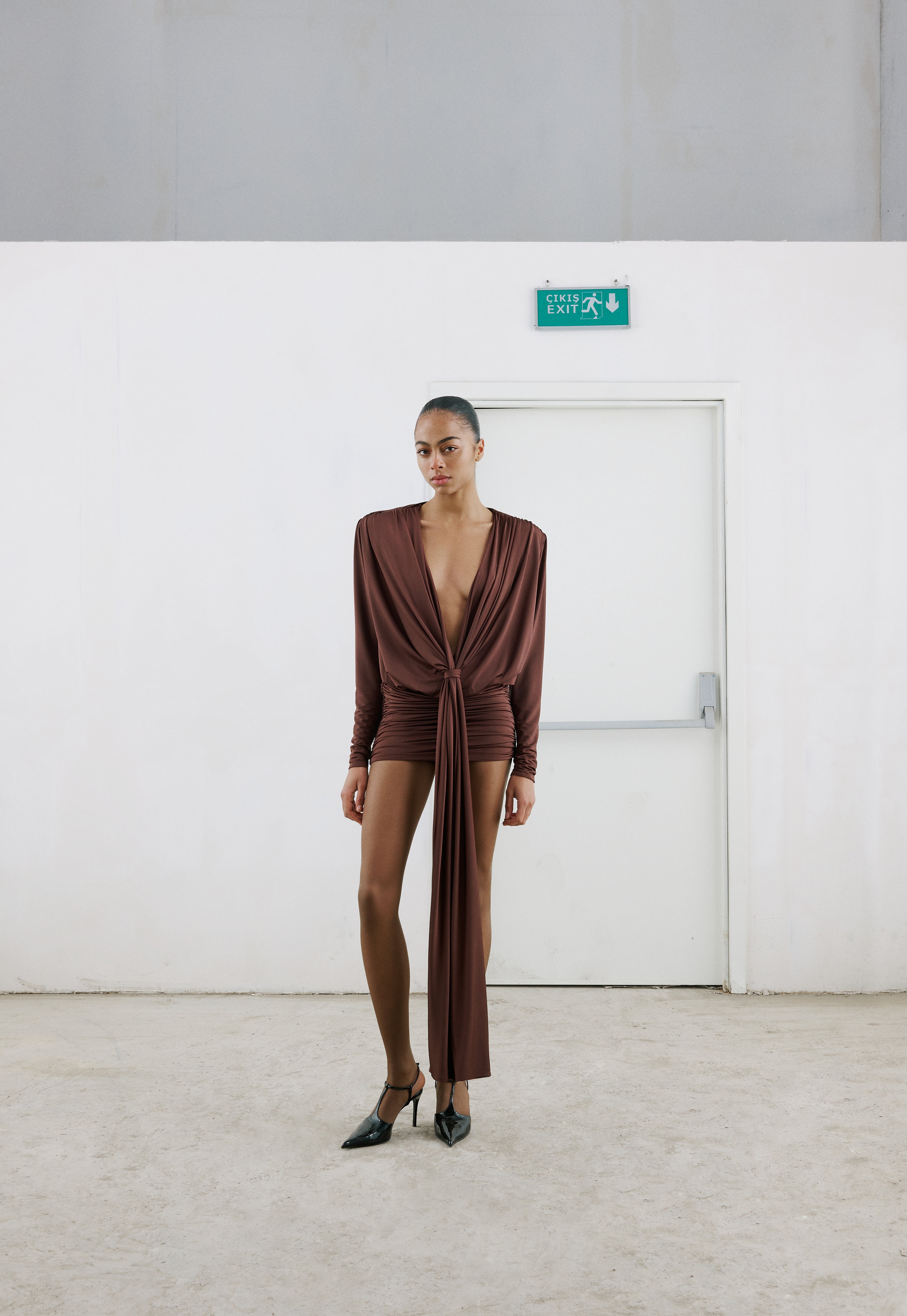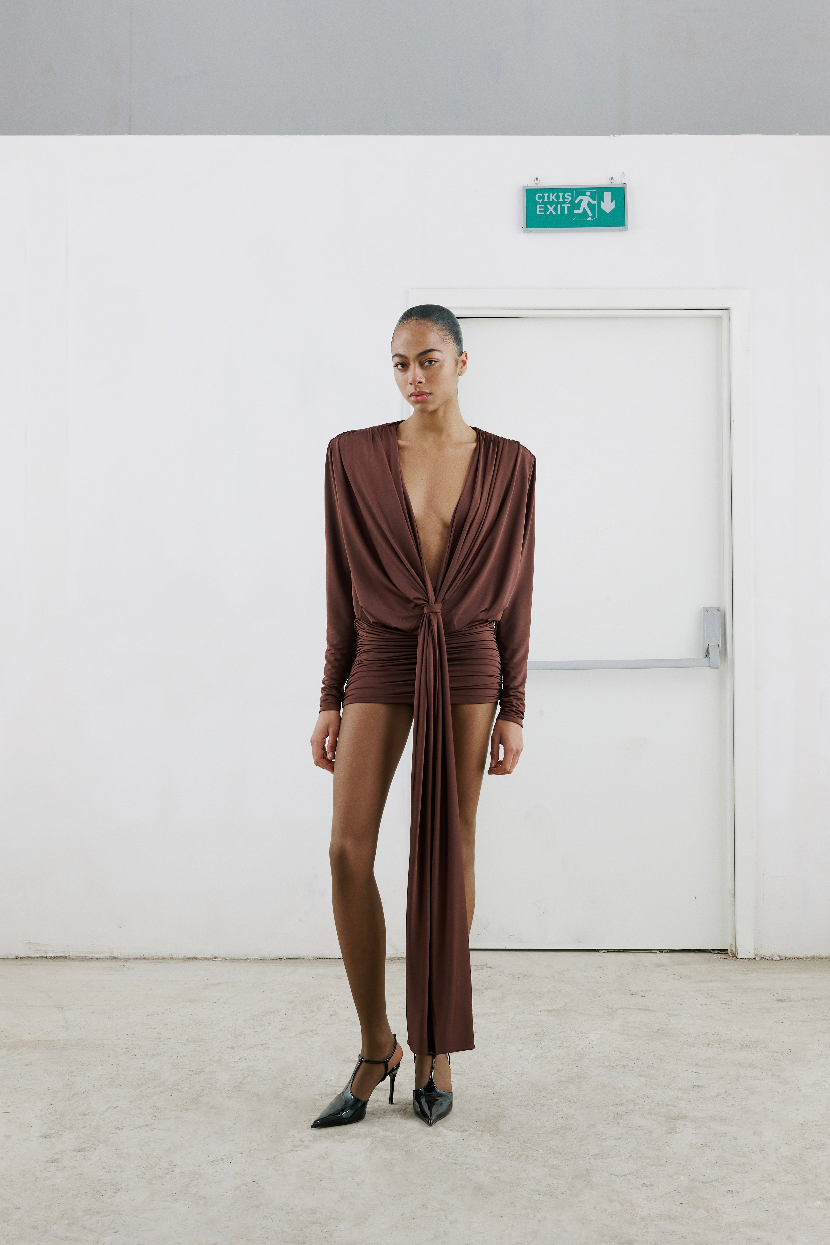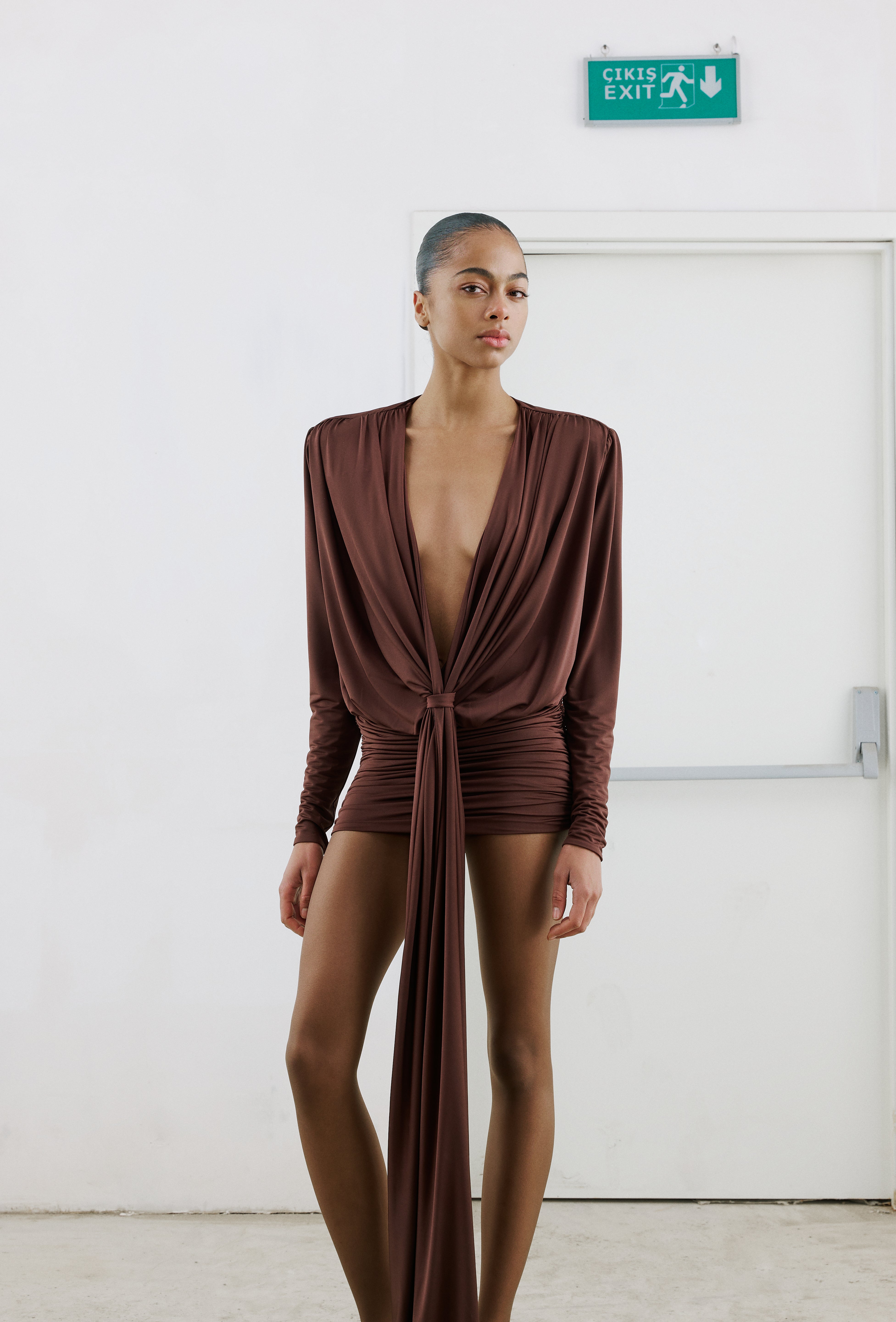 Önü kuşaklı, derin V yakalı, drapeli mini elbise