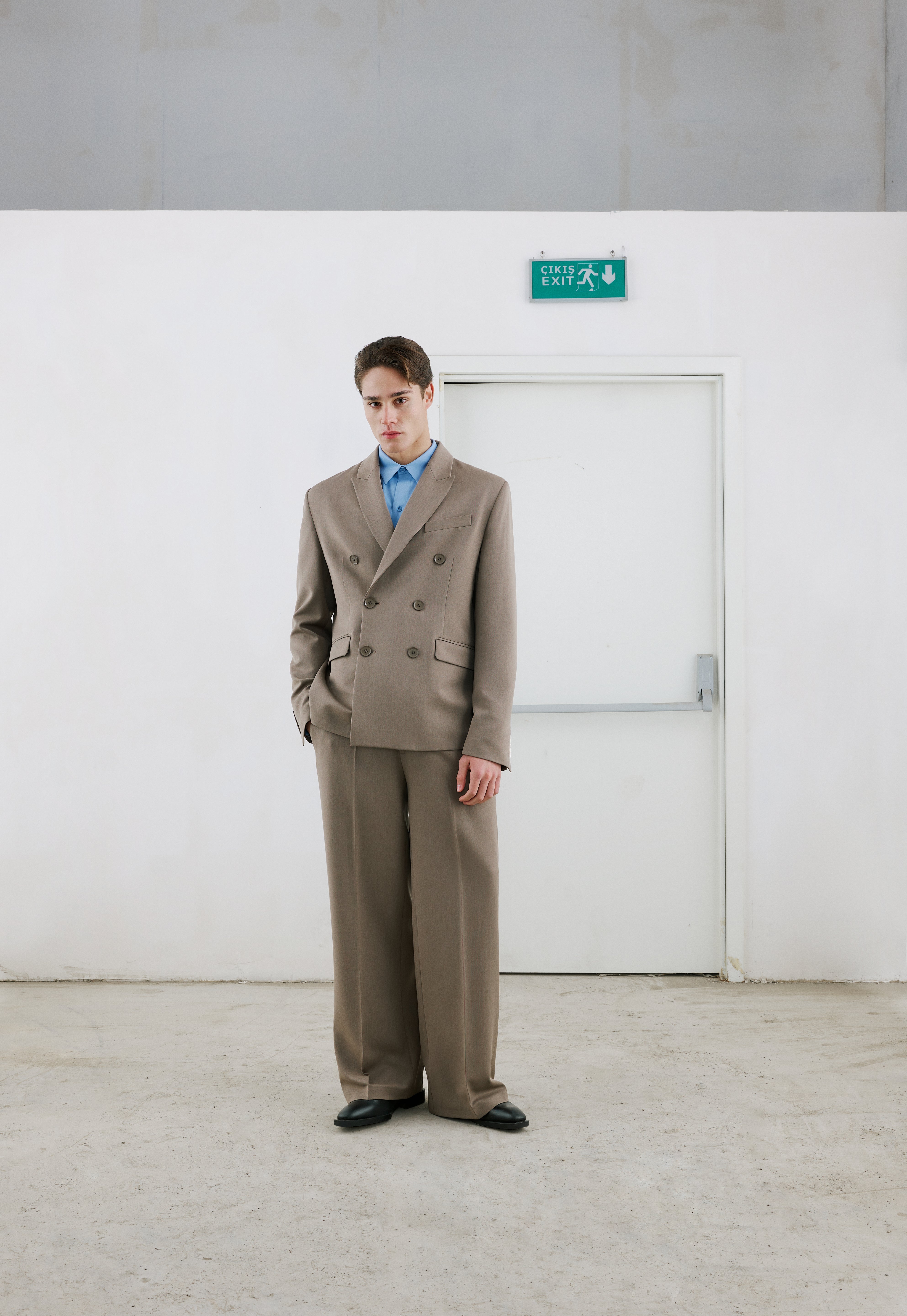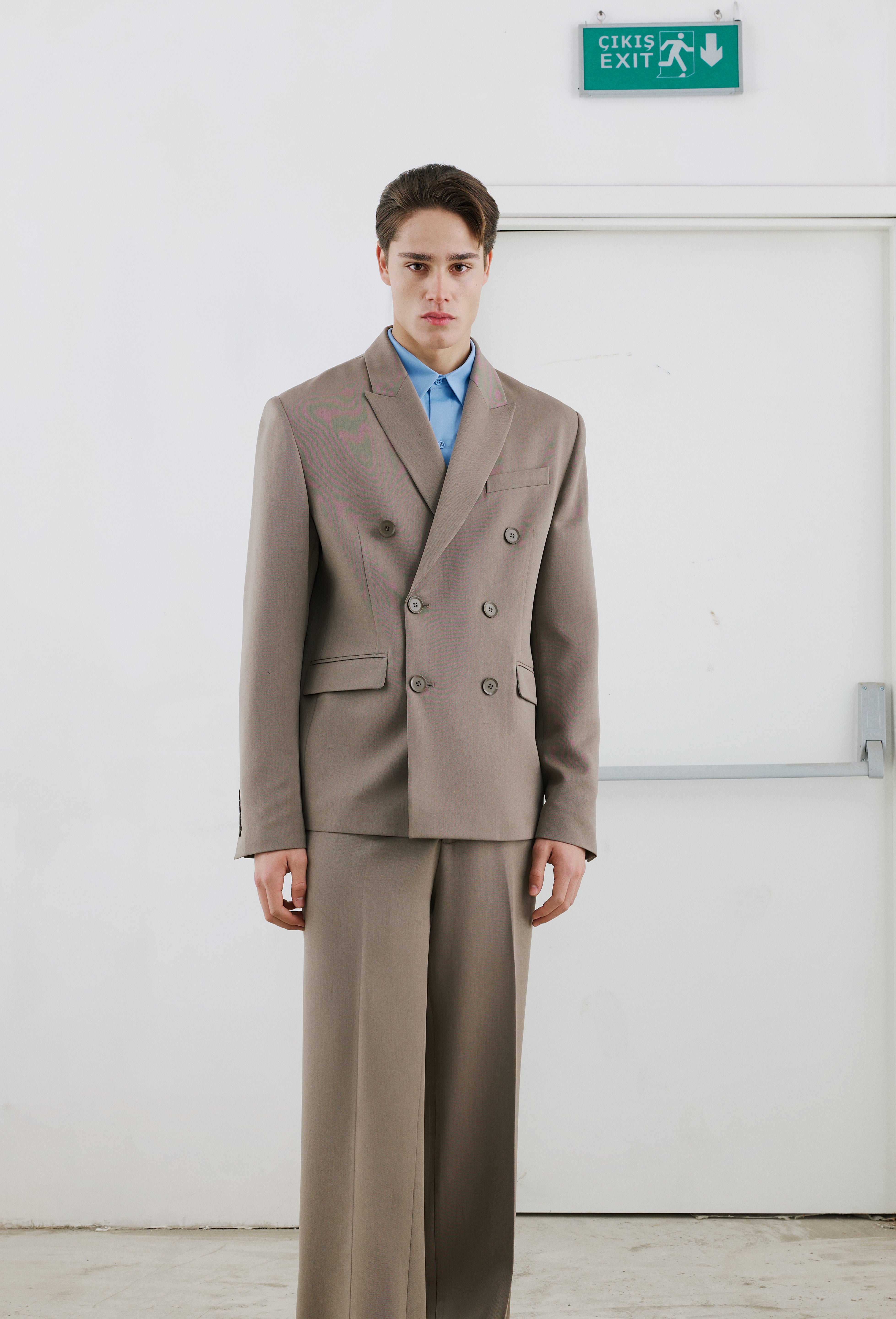 Oversize ceket, çift pileli geniş kesim pantolon.