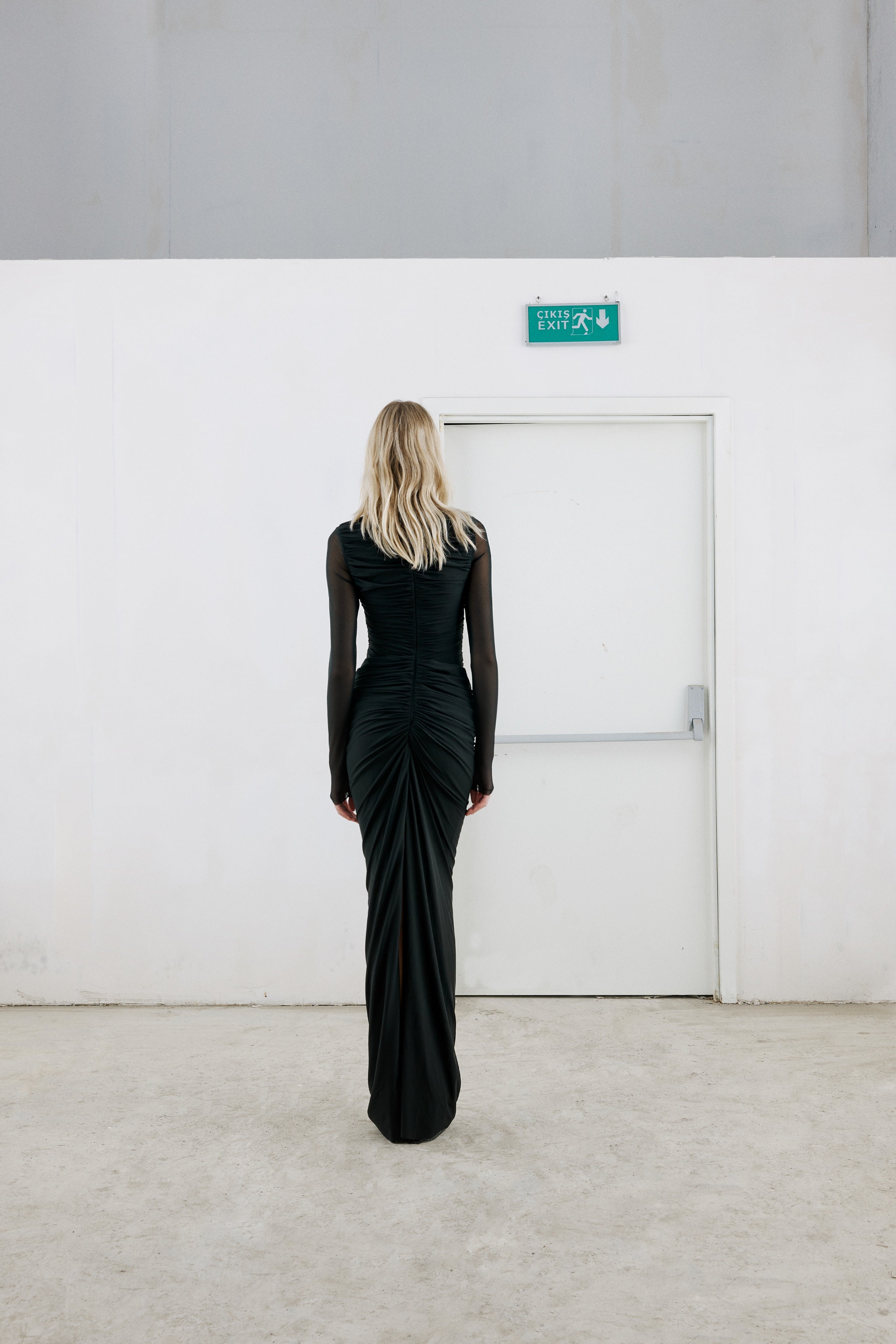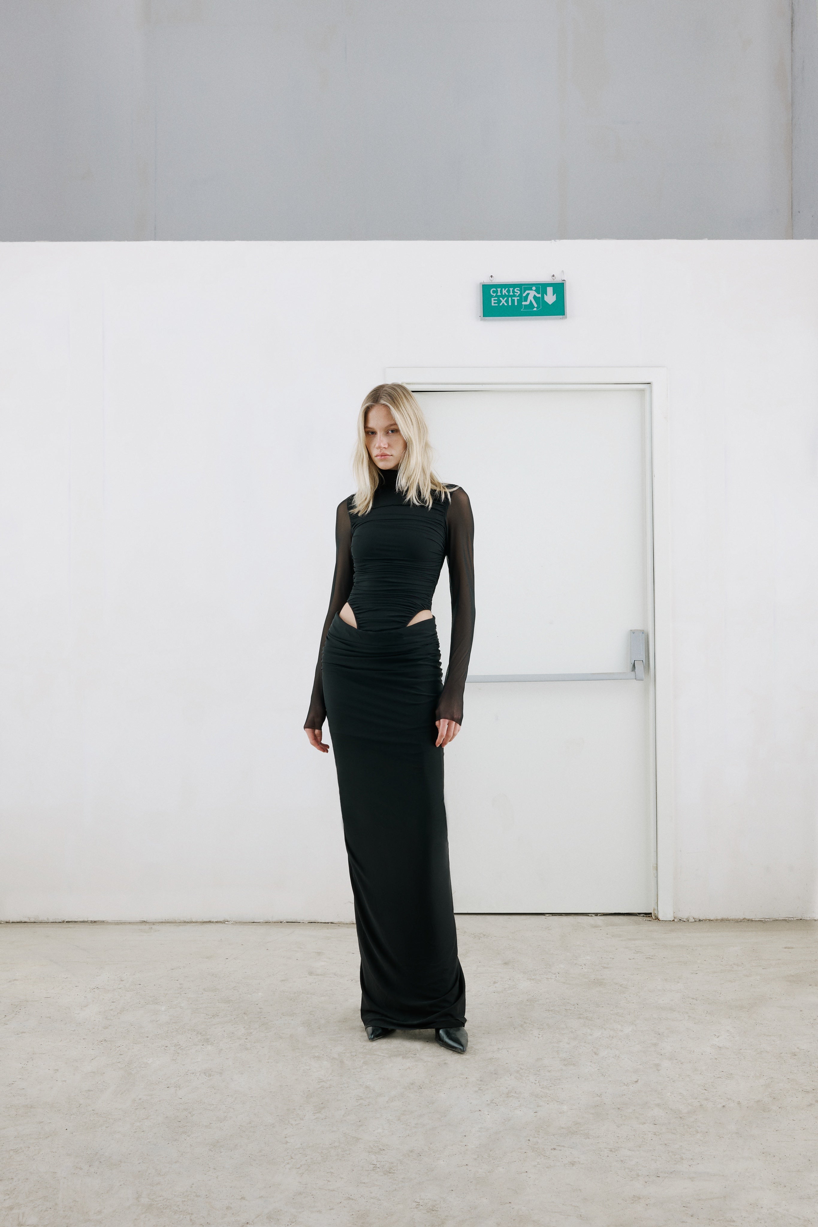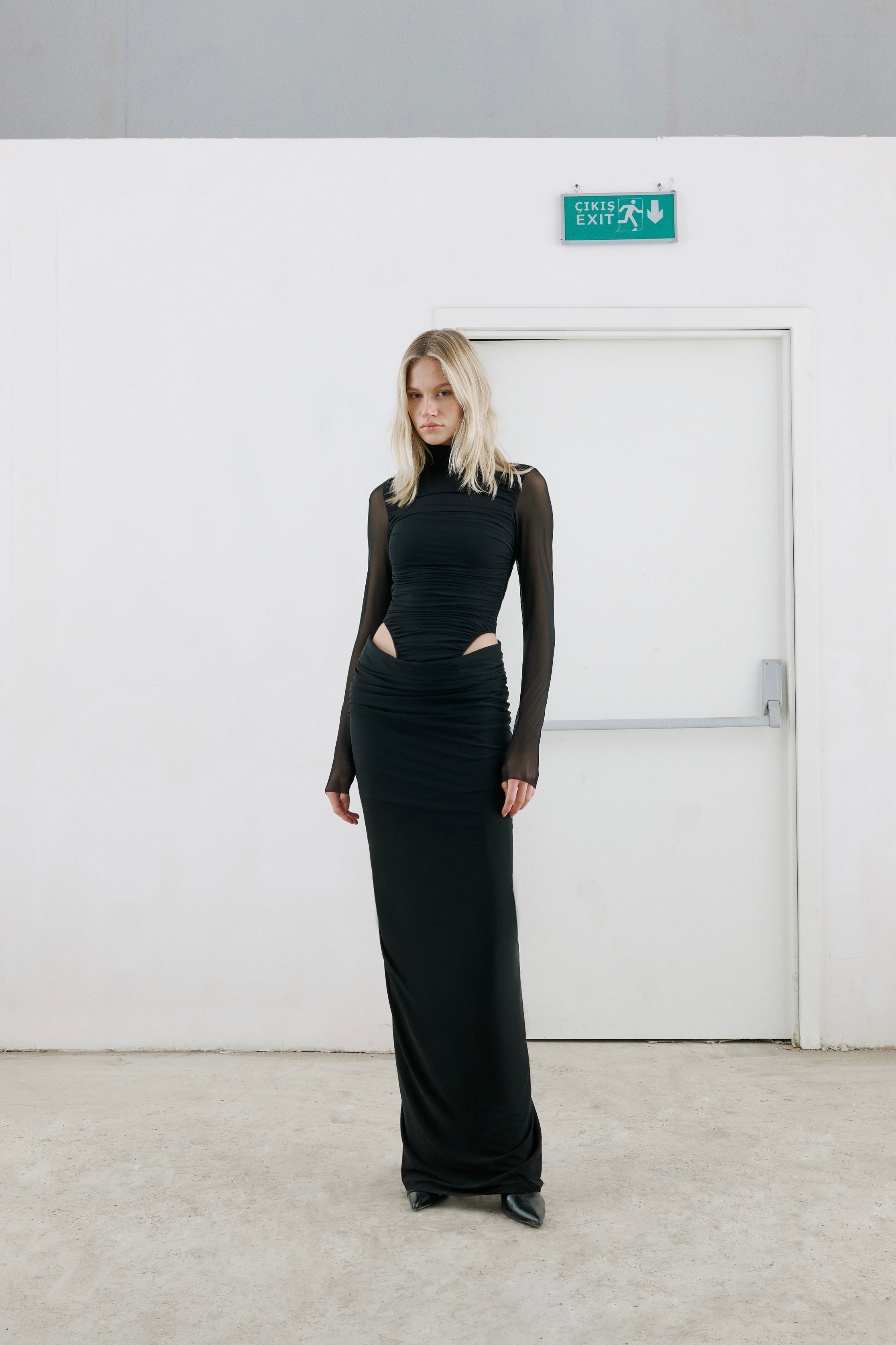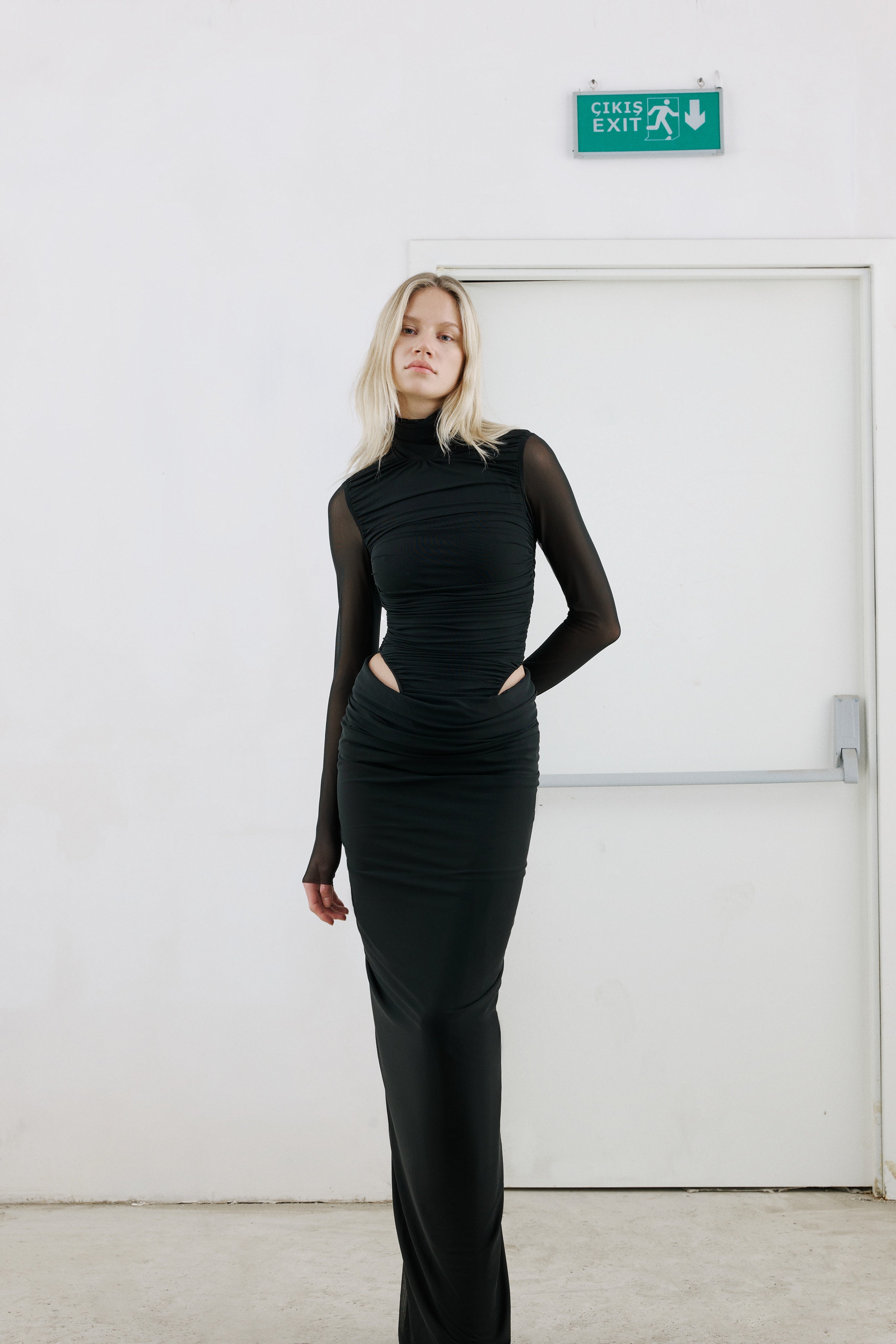 Derin mayo kesim bodysuit, bel dökümlü tül ve drape etek