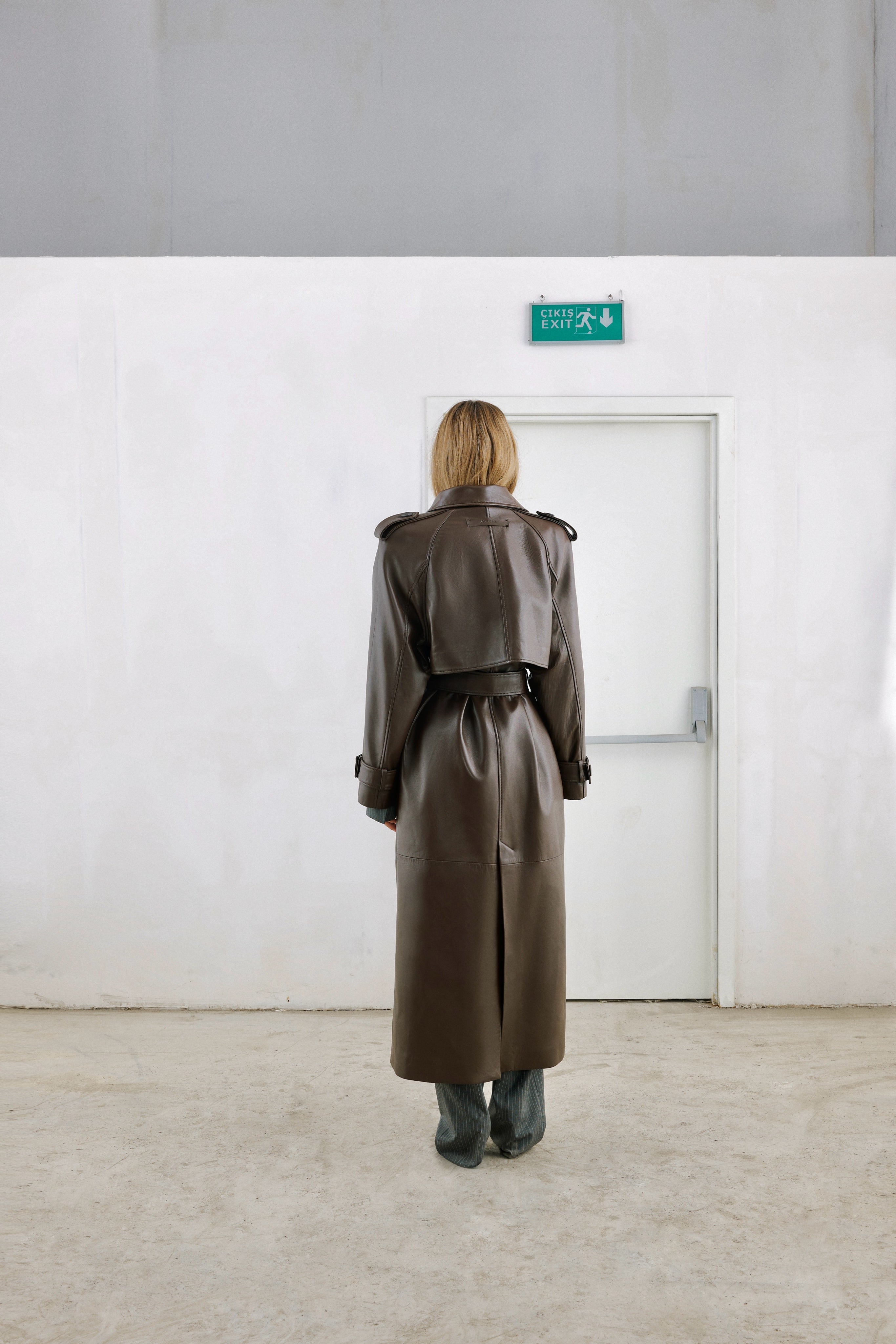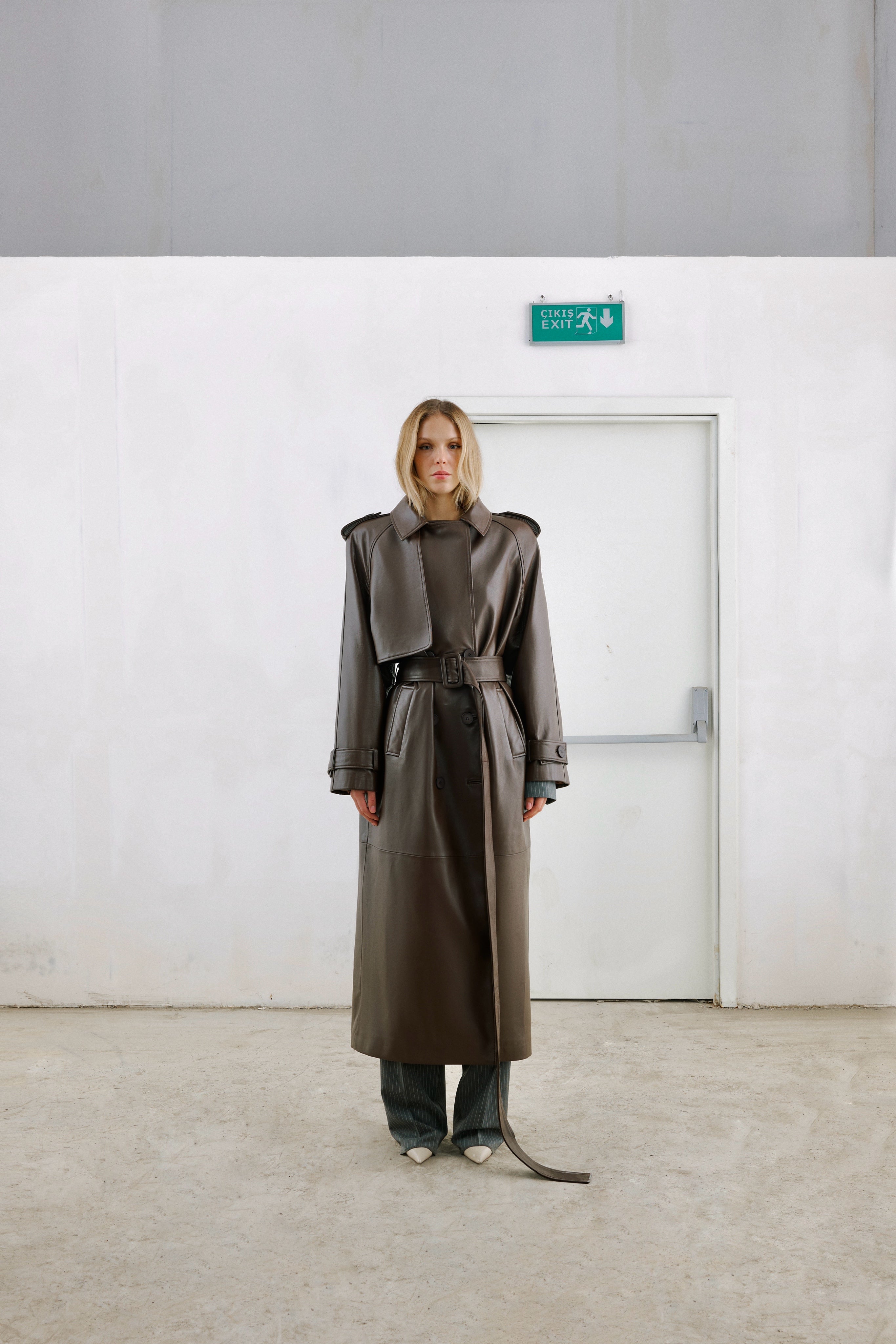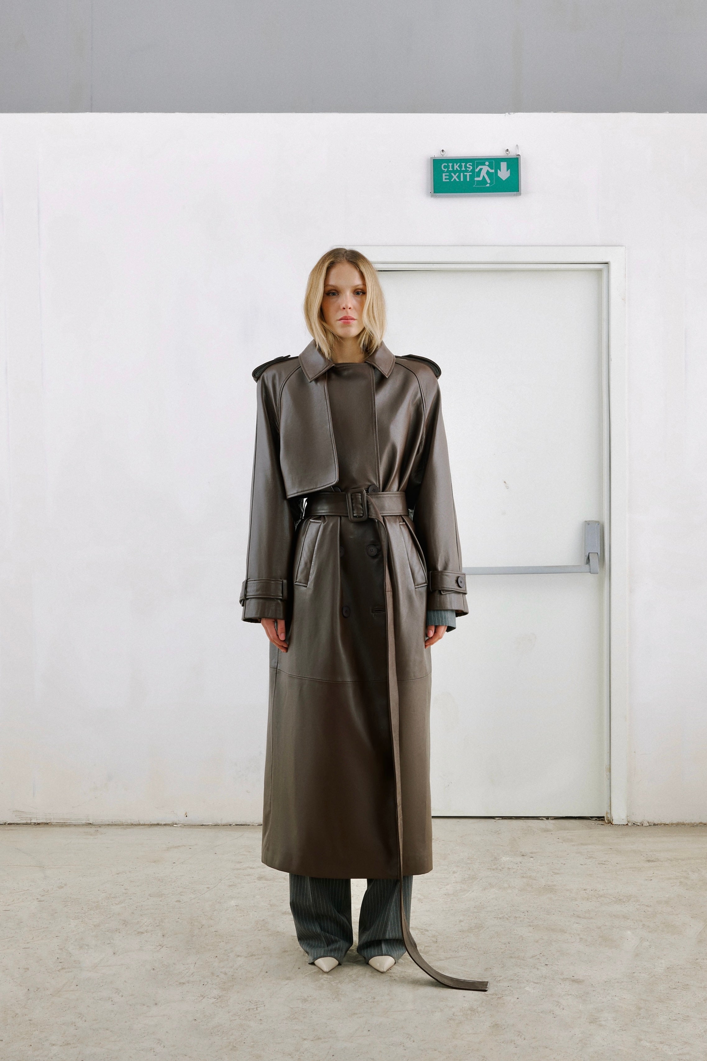 Oversize kesim, dik vatkalı, maxi boy trençkot