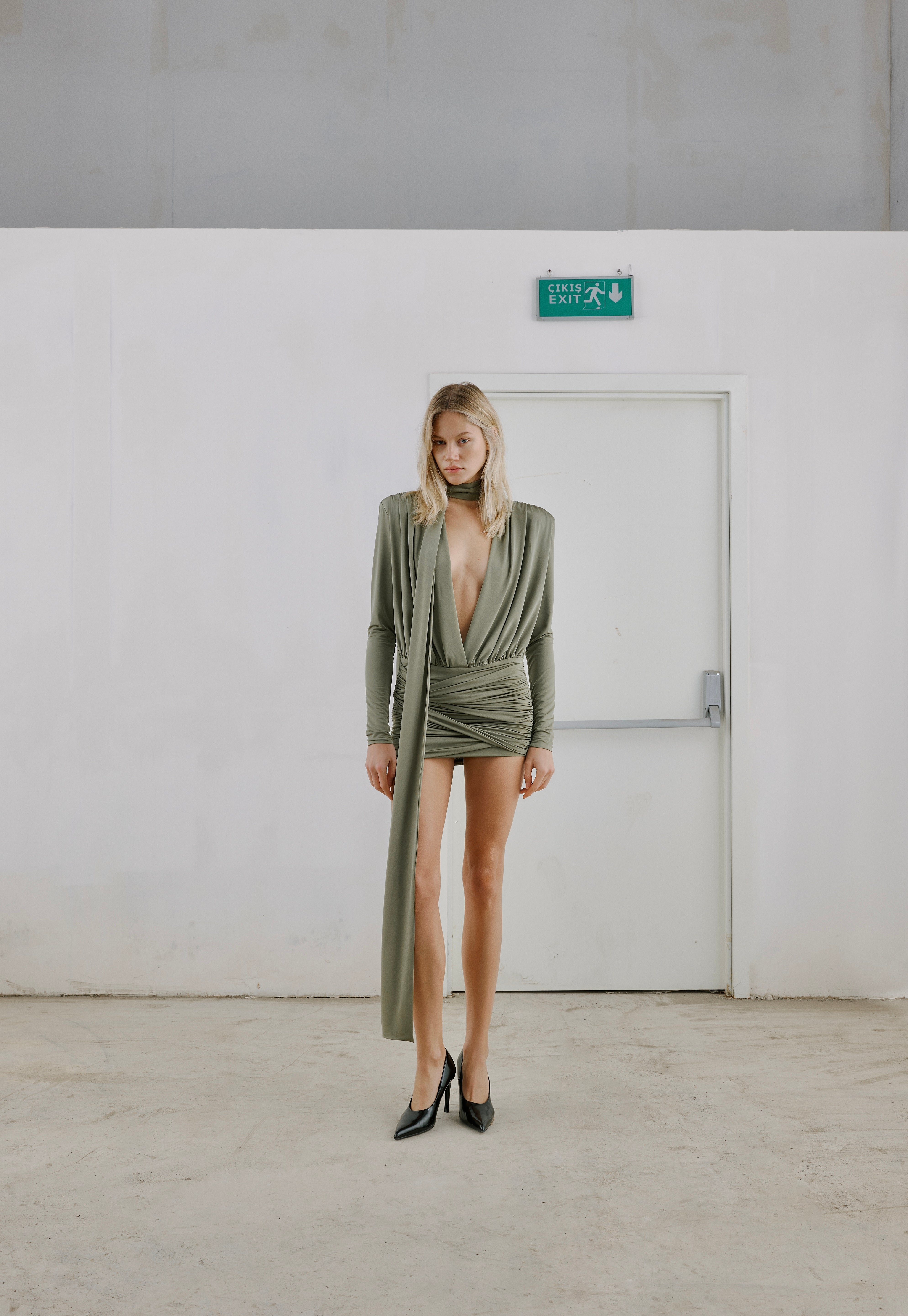 Eteği drape ve düğümlü, boynu şal detaylı mini elbise