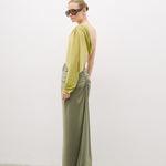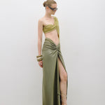 Yırtmaçlı uzun etek ve tek kol detaylı top.