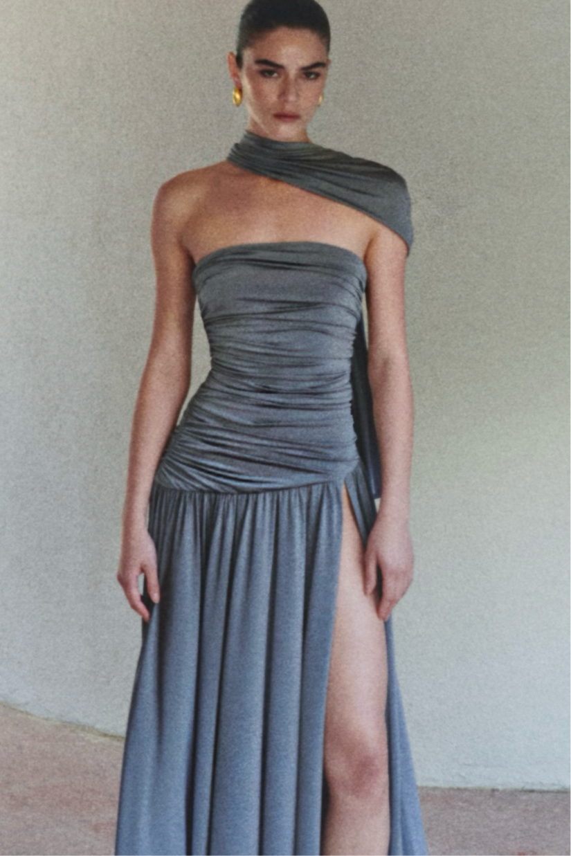 Straplez, büzgü detaylı, volanlı ve yırtmaçlı maxi elbise.