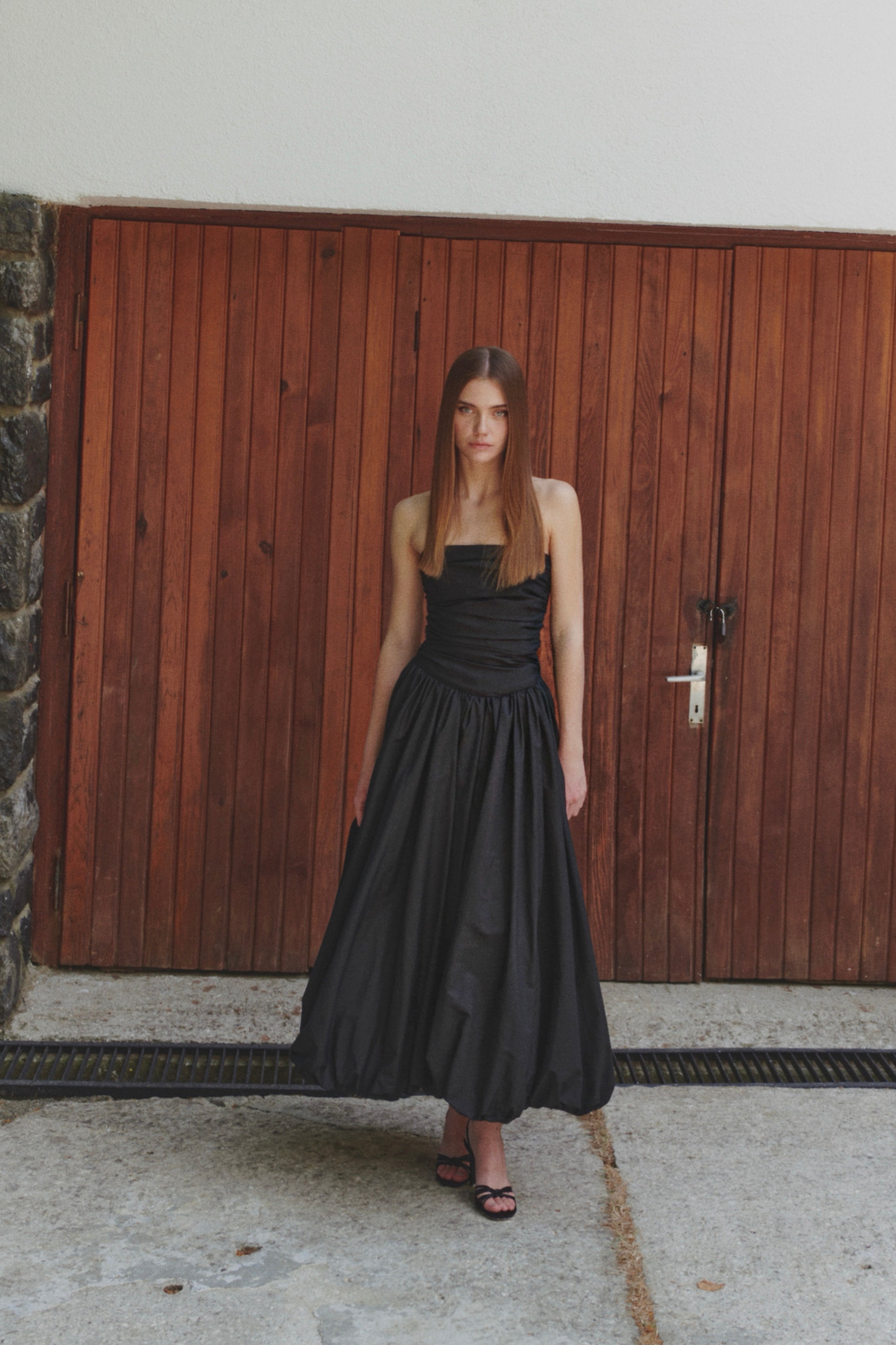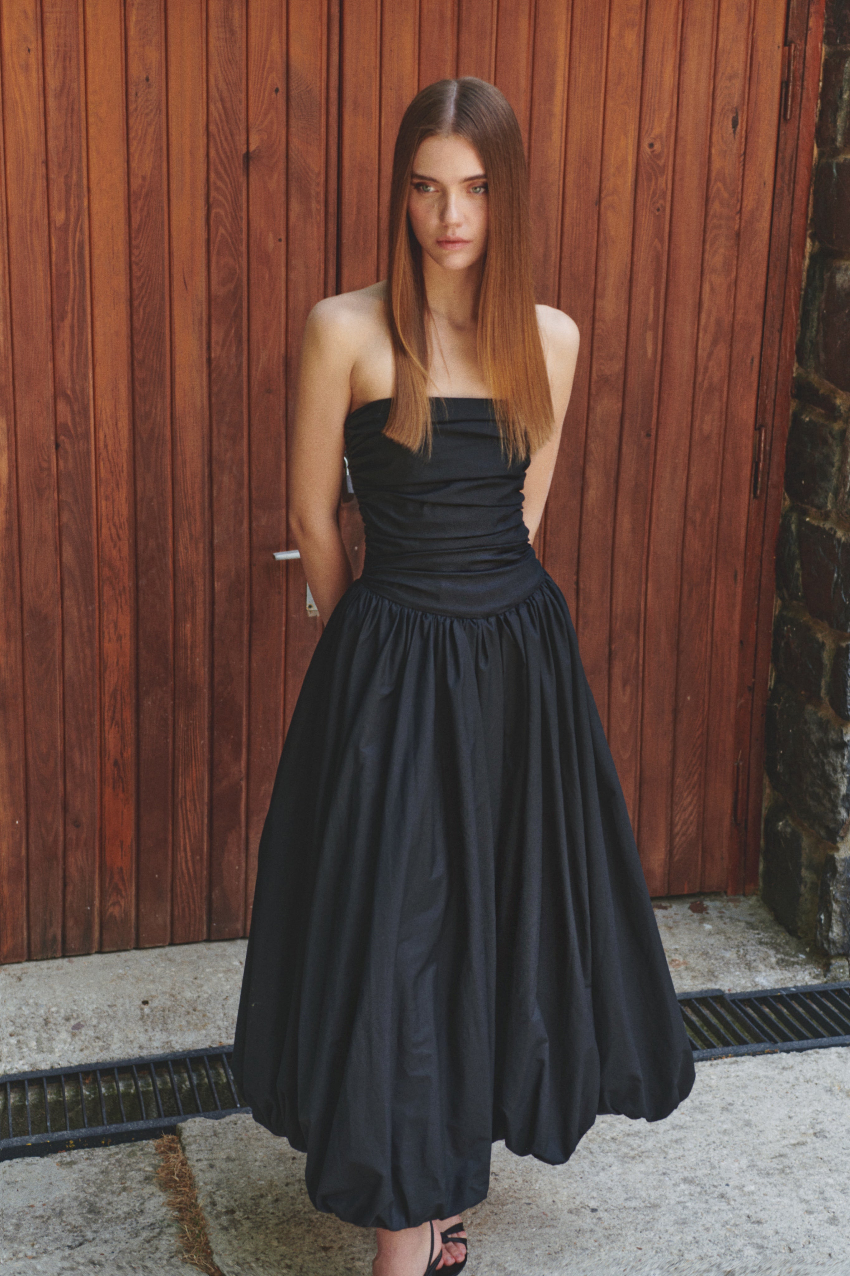 Straplez, büzgü detaylı, balon etekli midi elbise.