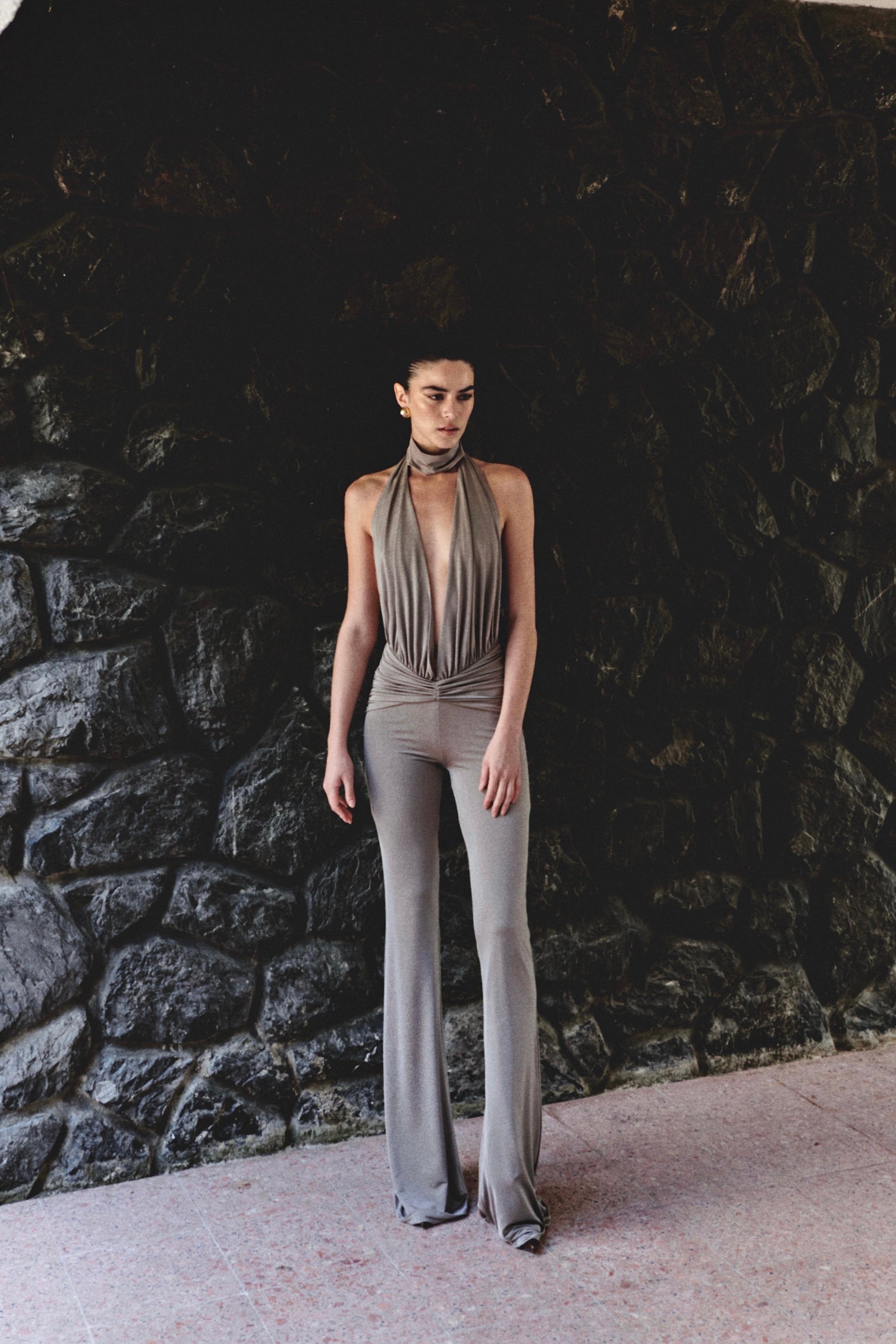 Balıkçı V yakalı, sırt dekolteli ispanyol paçalı tulum.