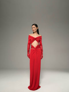 Omuzları açık düğüm detaylı uzun elbise