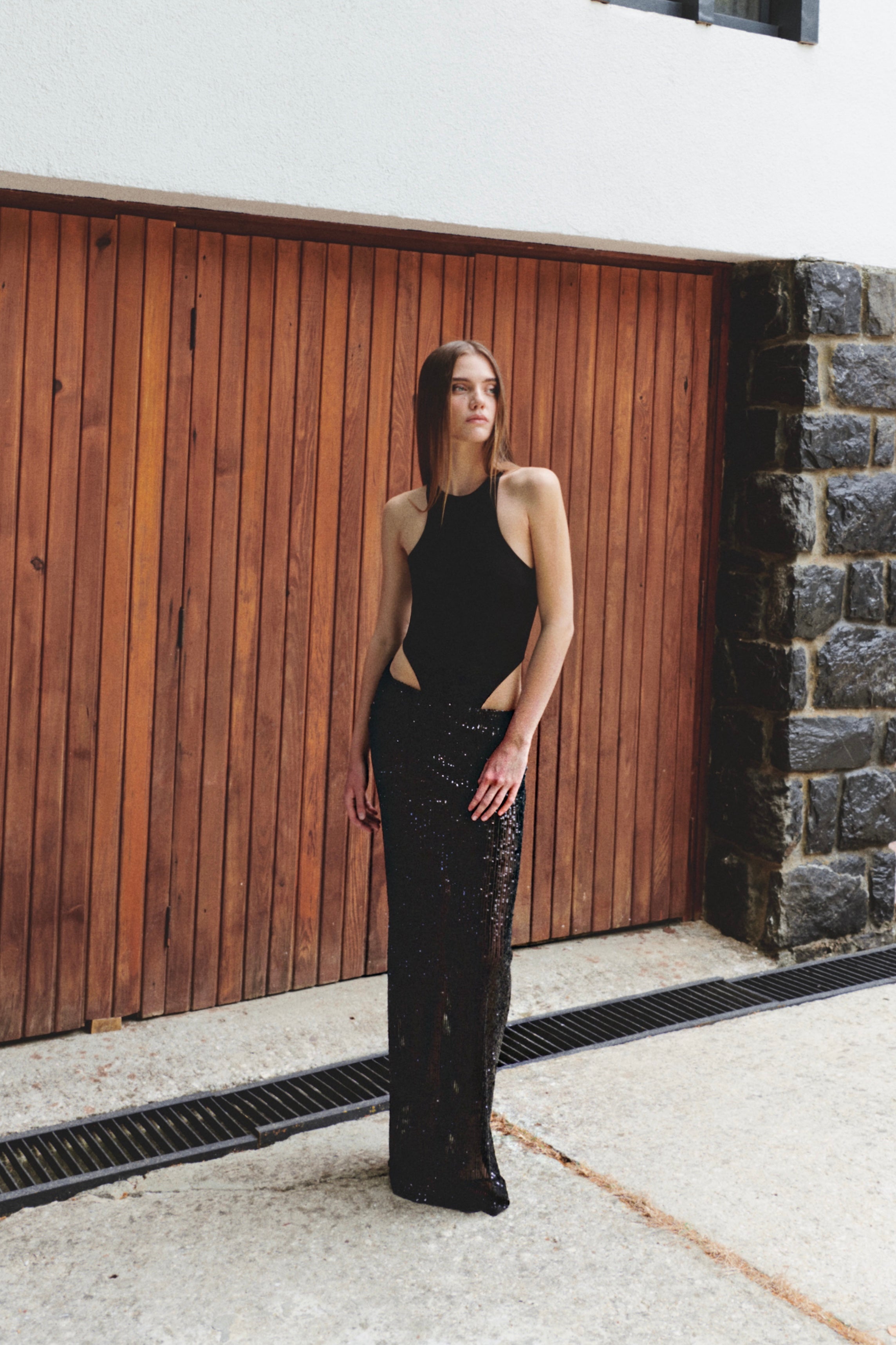 Halter yakalı bodysuit, pile detaylı ince payet transparan maxi etek.