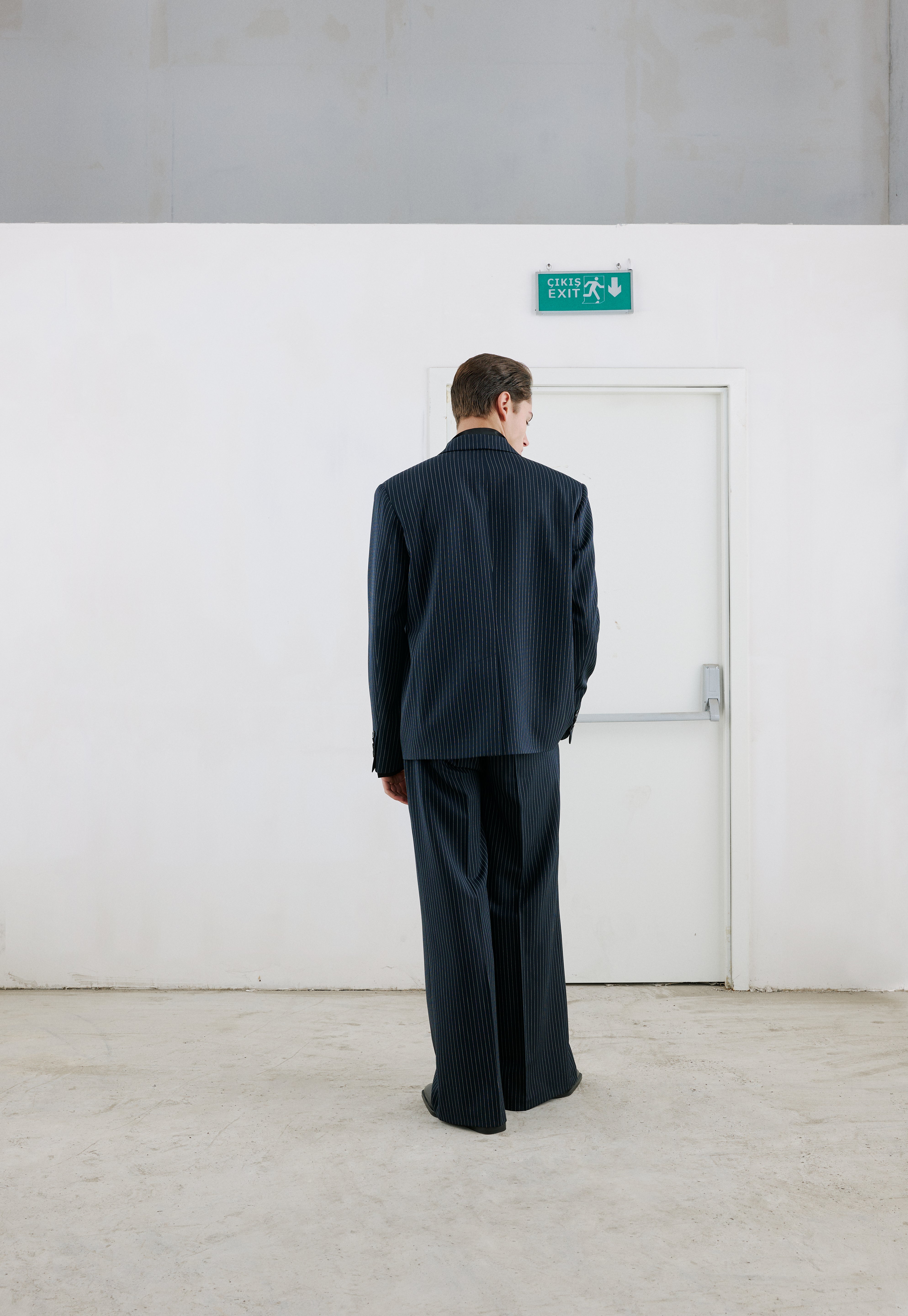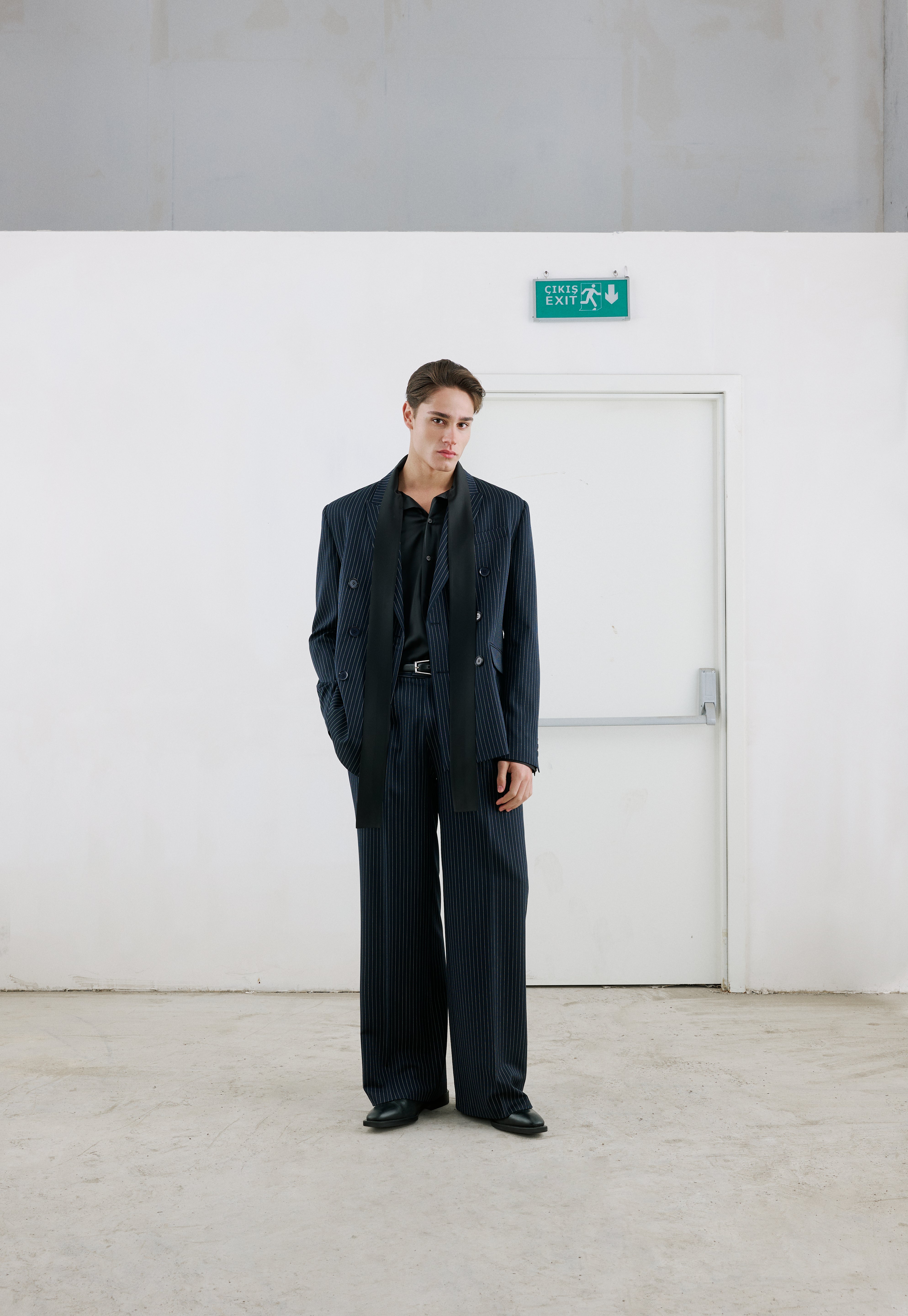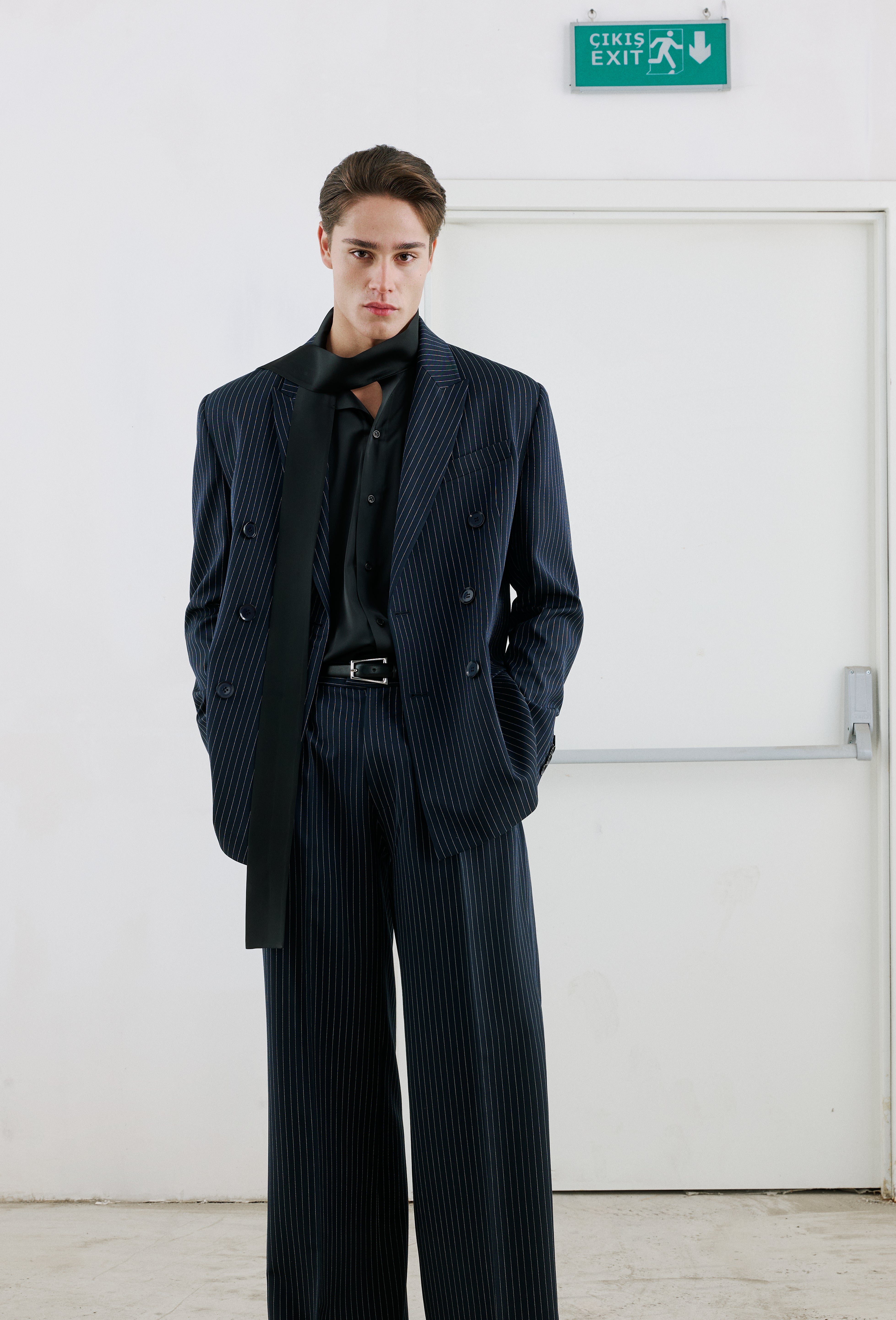 Oversize ceket, çift pileli geniş kesim pantolon.