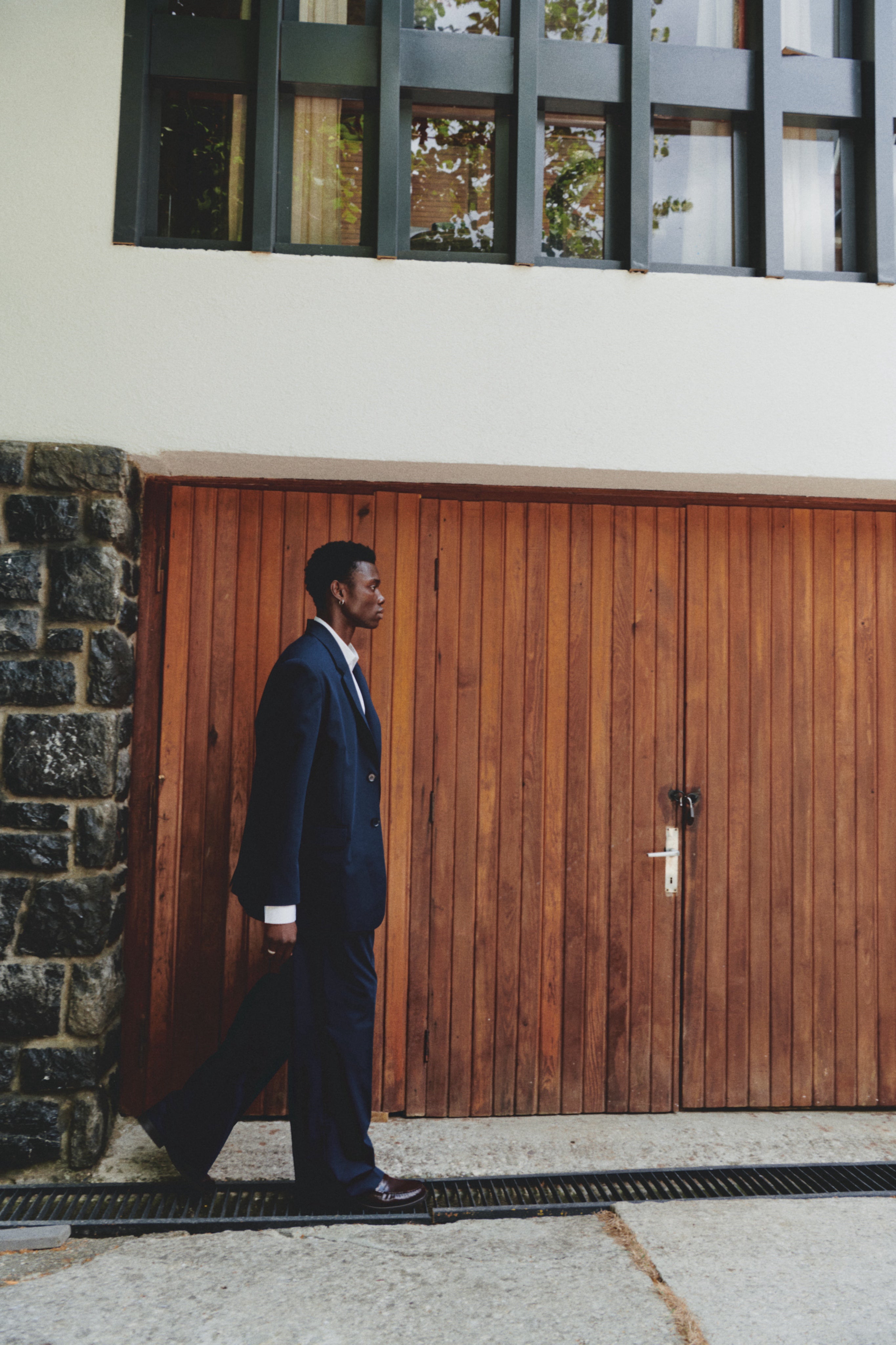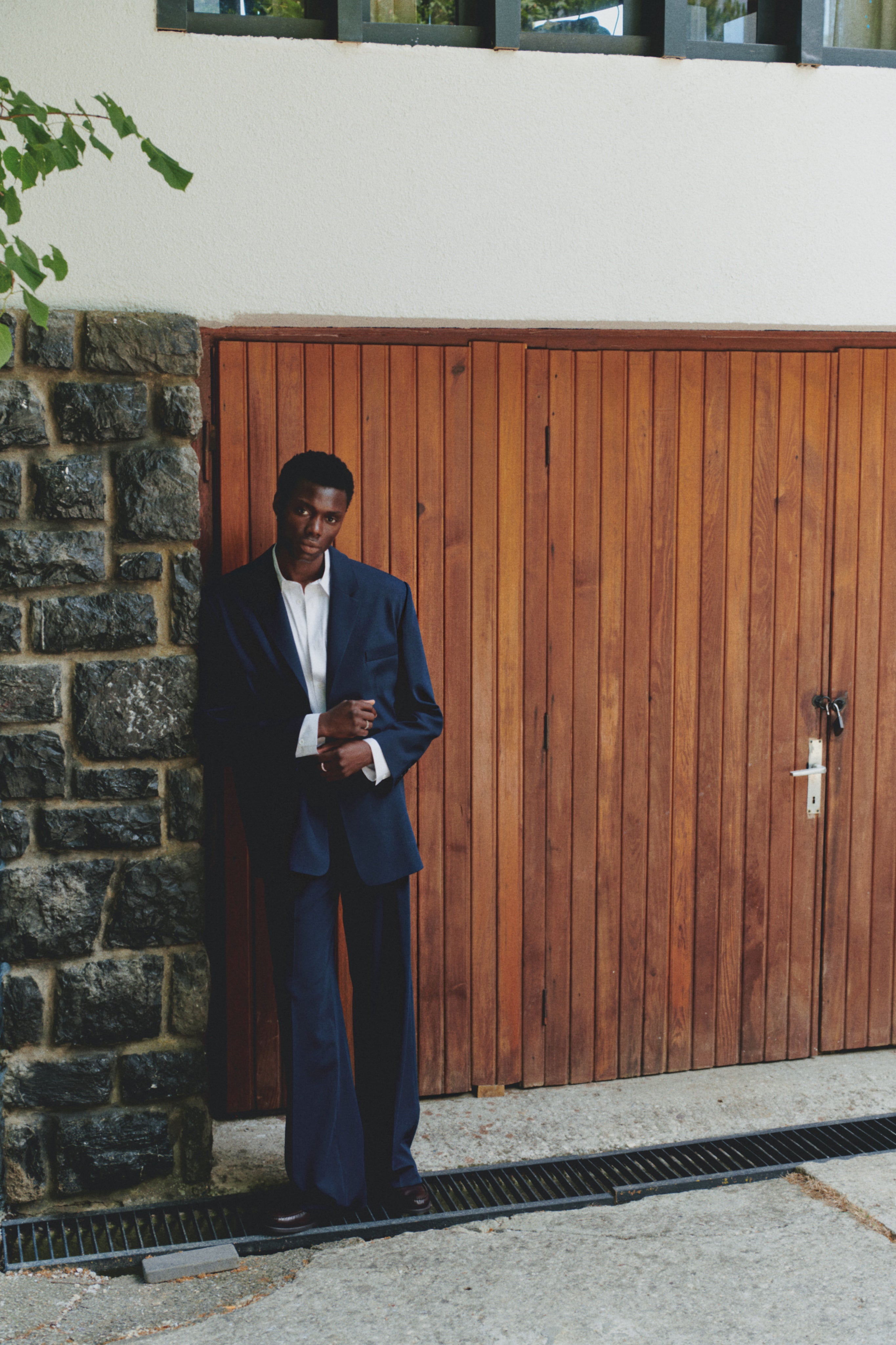 Oversize ceket, çift pileli geniş kesim pantolon.