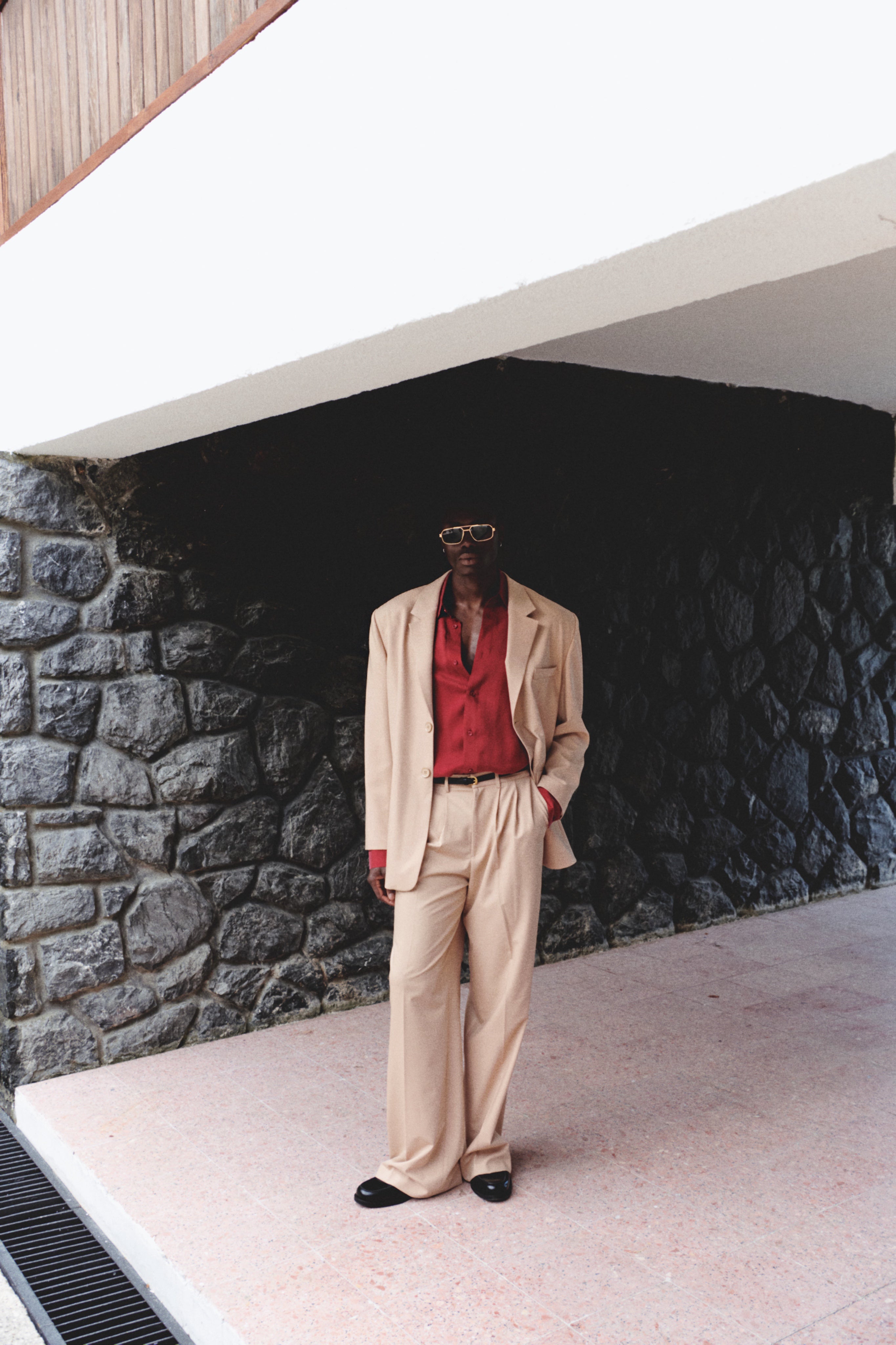 Oversize ceket, çift pileli geniş kesim pantolon.