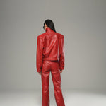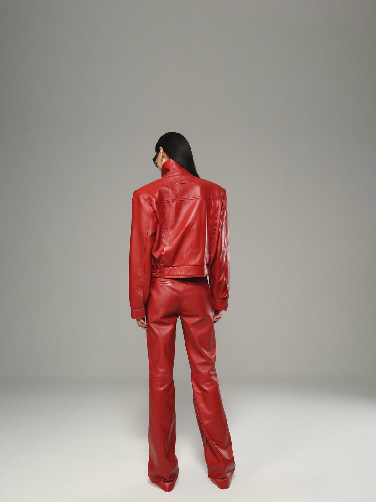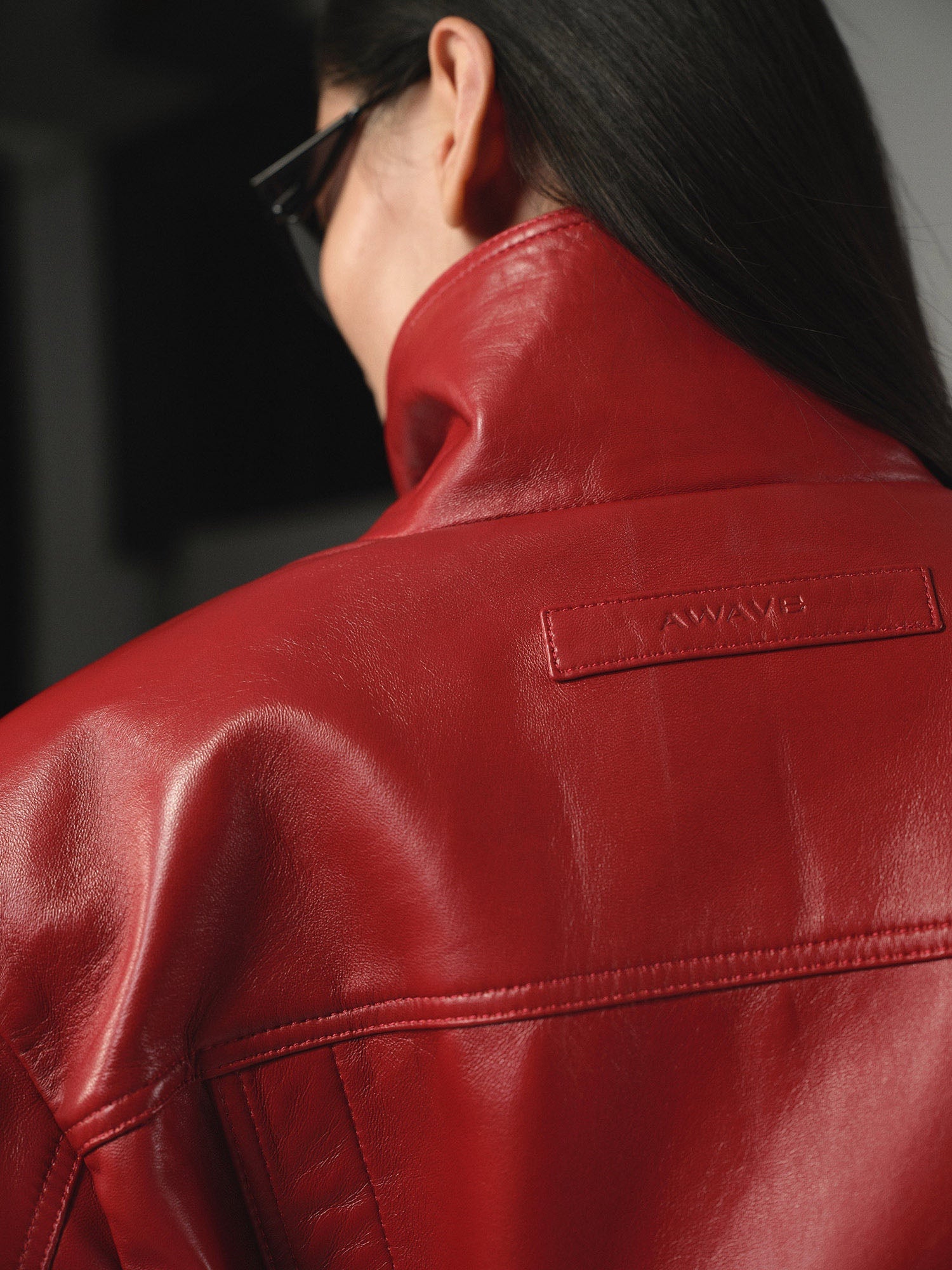 Asimetrik ön kapaması ve dik yakasıyla öne çıkan, kısa silüetli dik yakalı vatkalı deri ceket