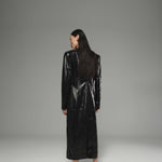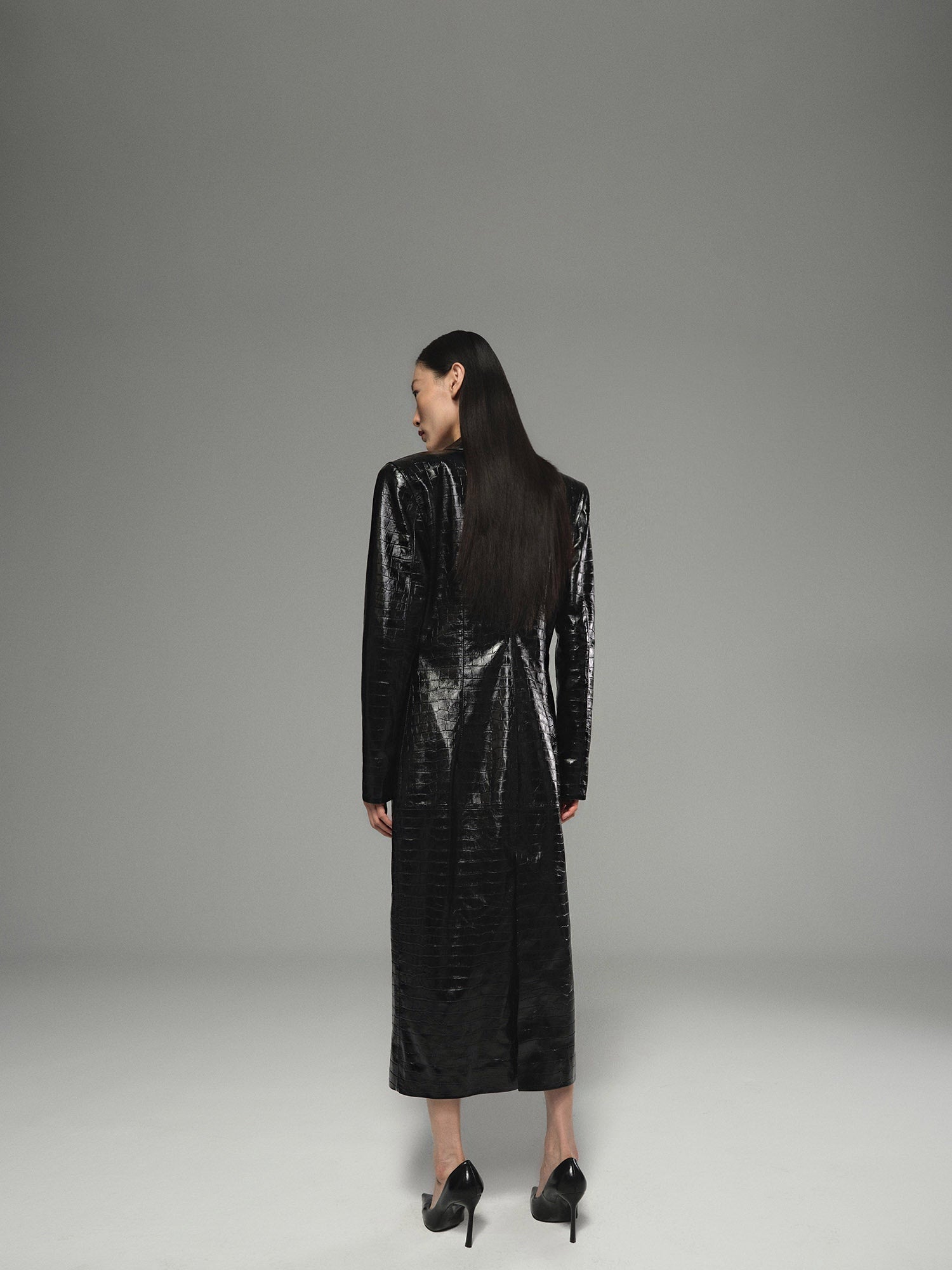 Kroko desenli, bel oturtmalı, uzun deri ceket