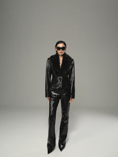 Çıkarılabilir shearling yaka detaylı, kroko desenli, bel oturtmalı ceket