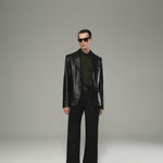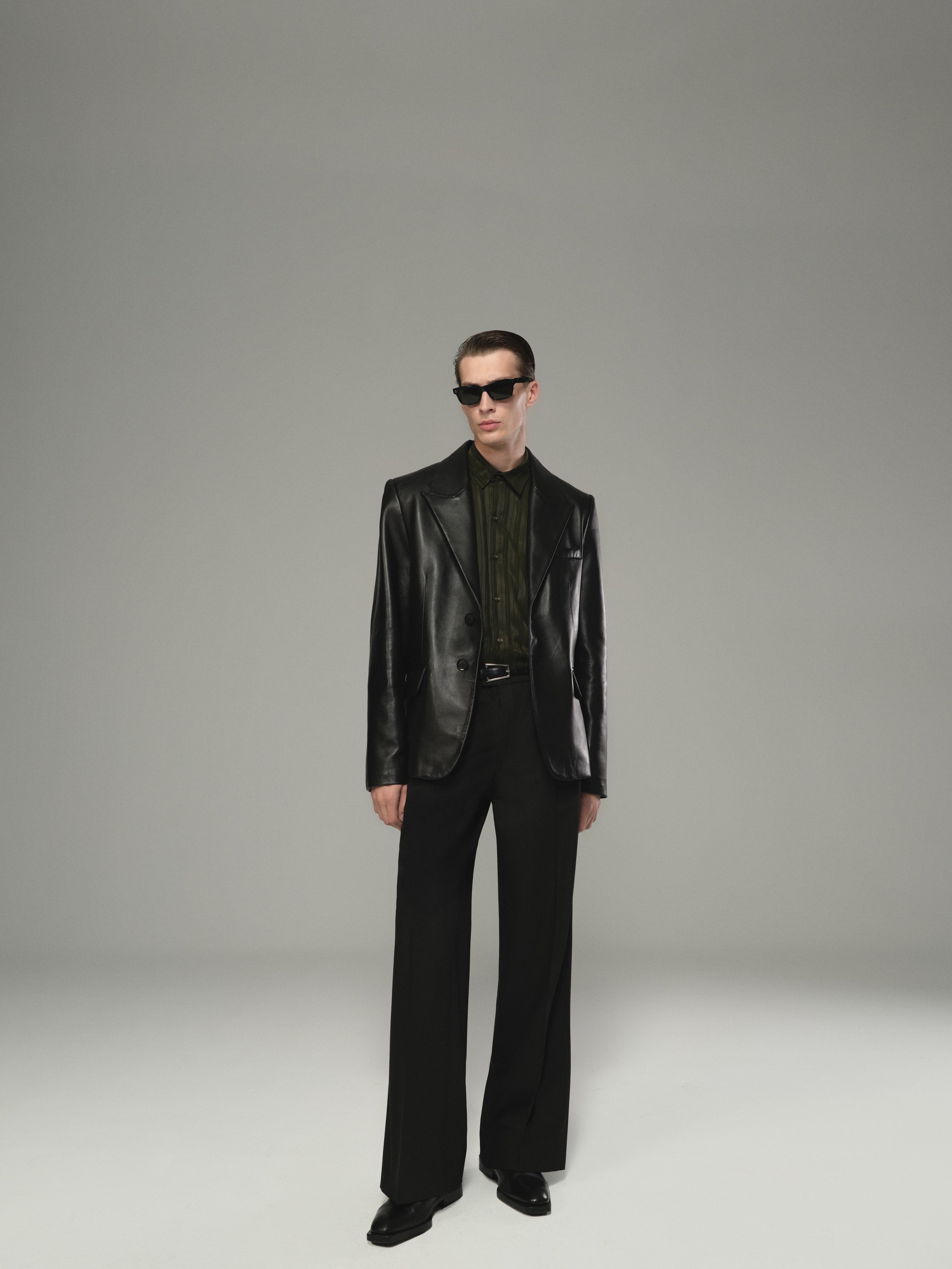 Keskin omuz hattı ve yapılandırılmış formuyla öne çıkan deri blazer.