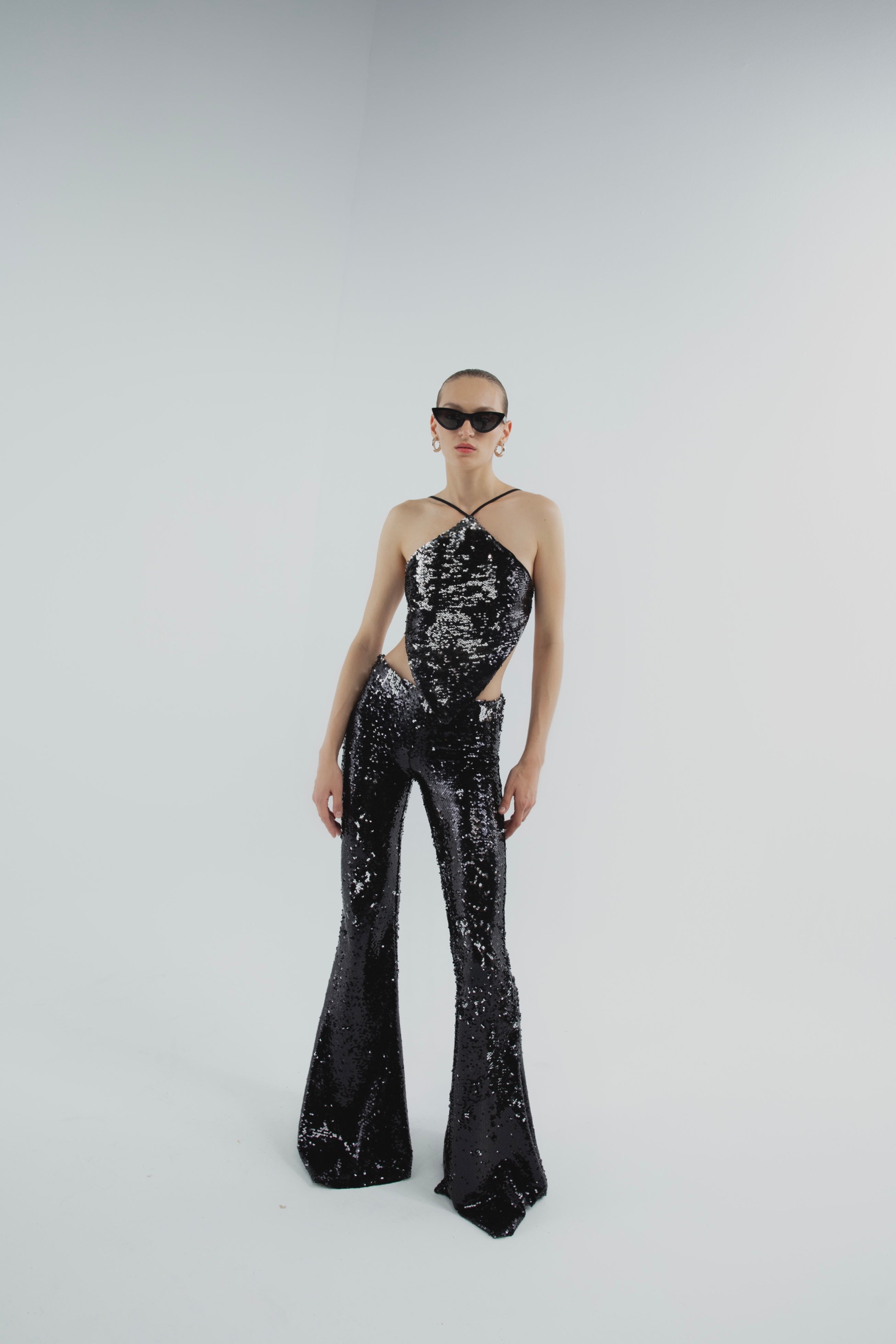 Sırt dekolteli üçgen çift taraflı payet top, flare paça pantolon