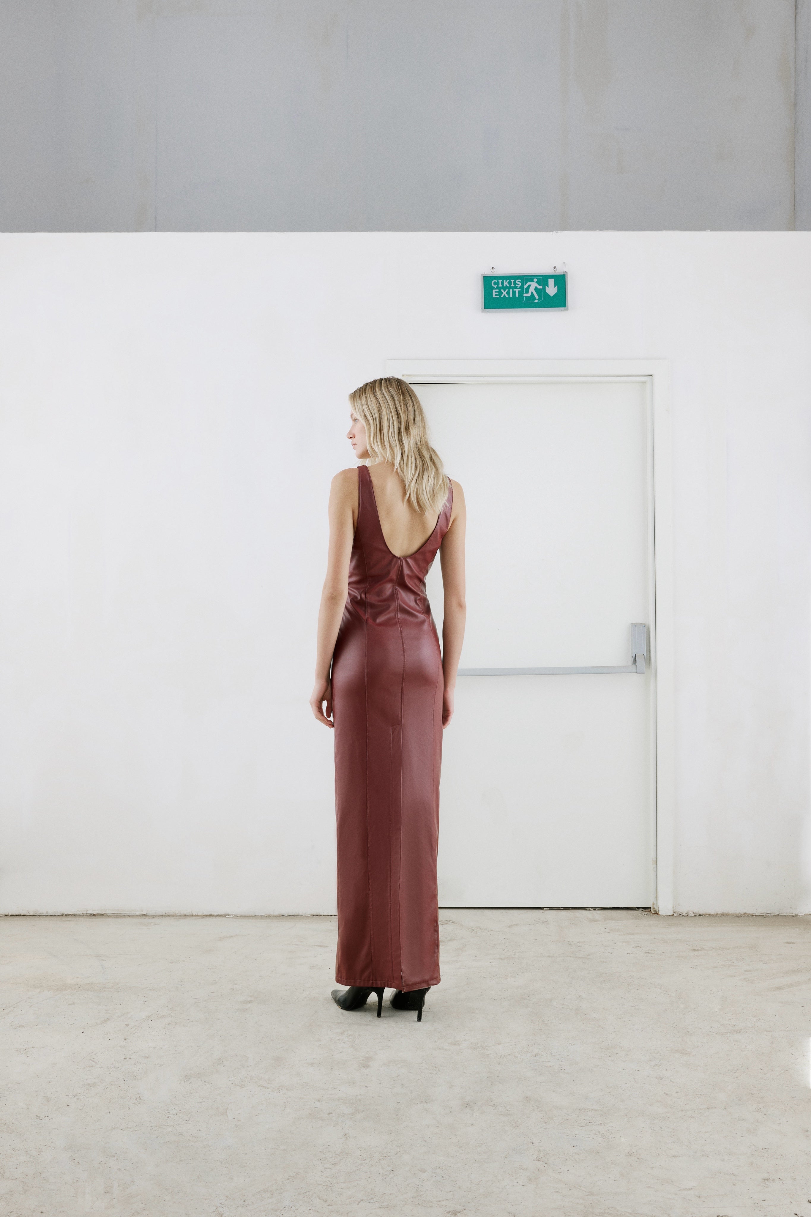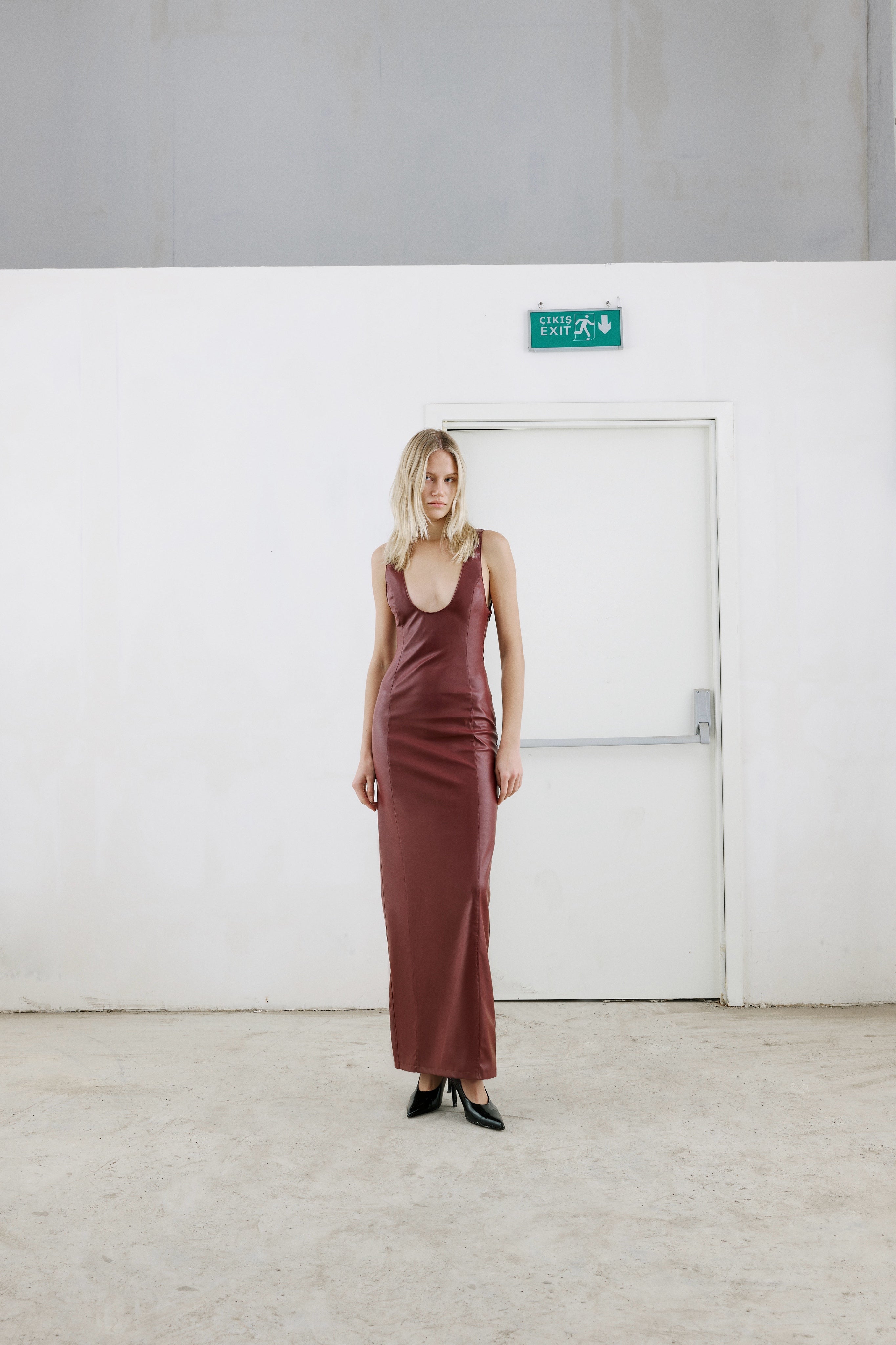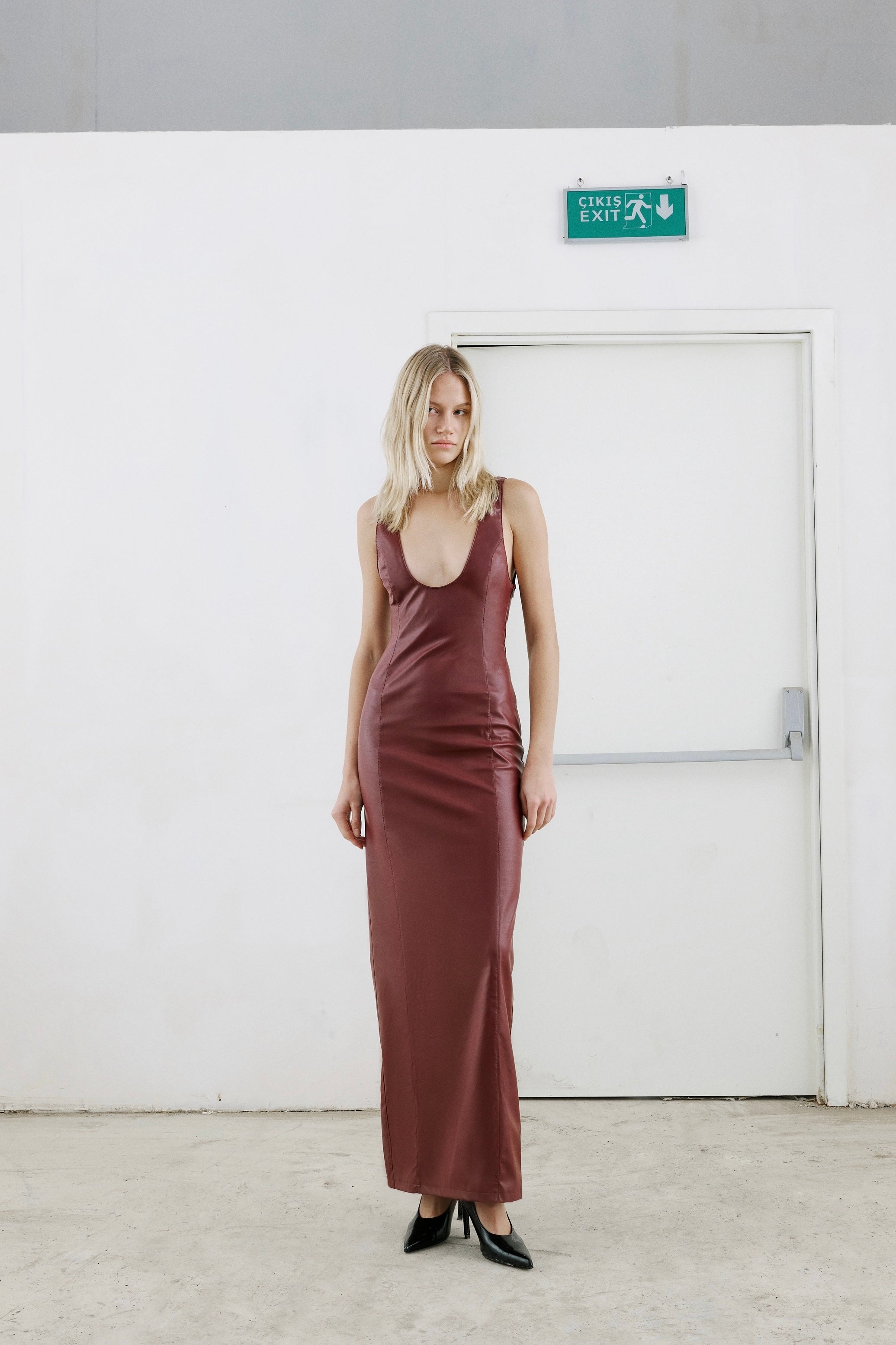 U-neck, sleeveless and fit cut maxi vegan leather dress