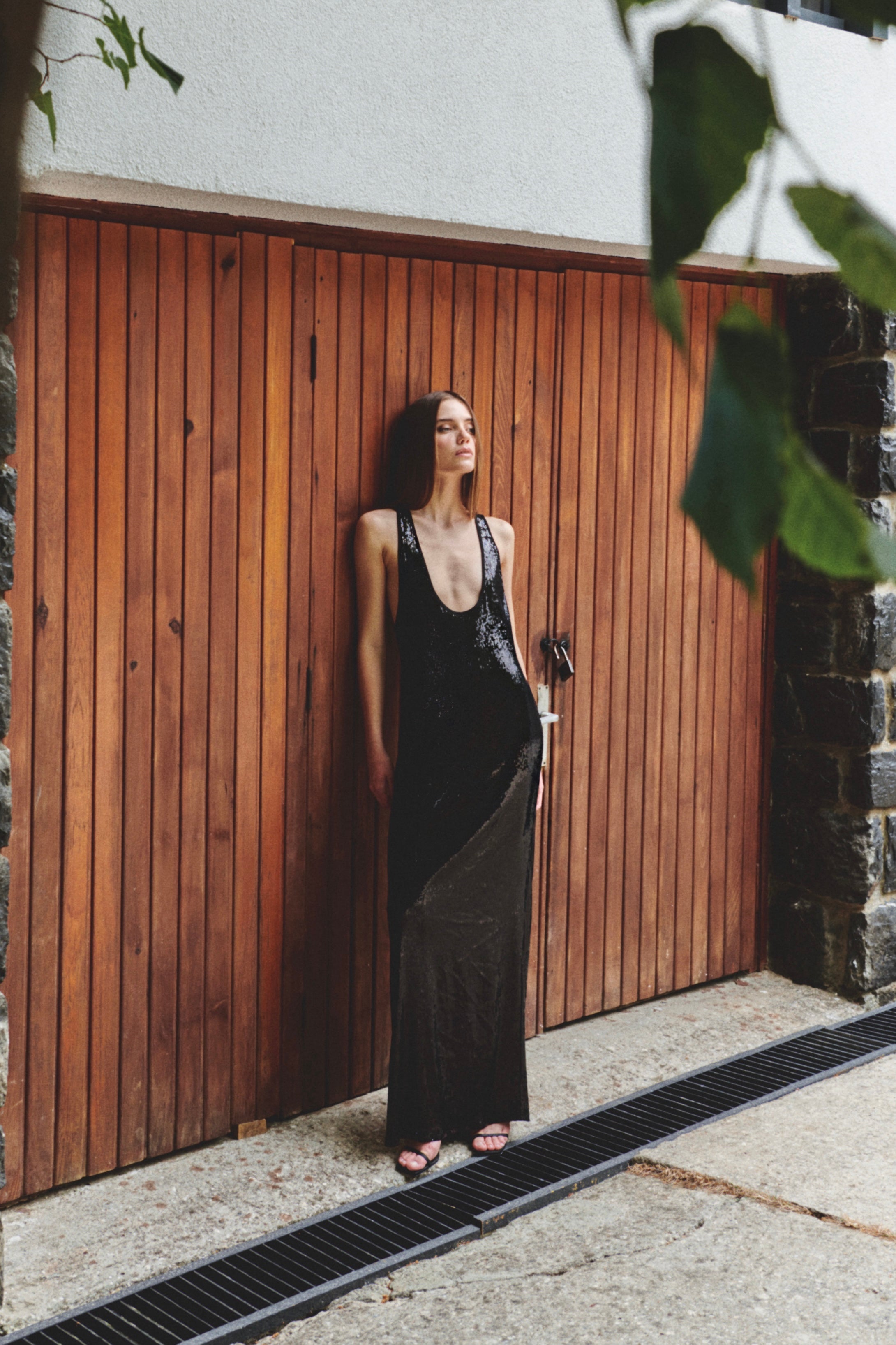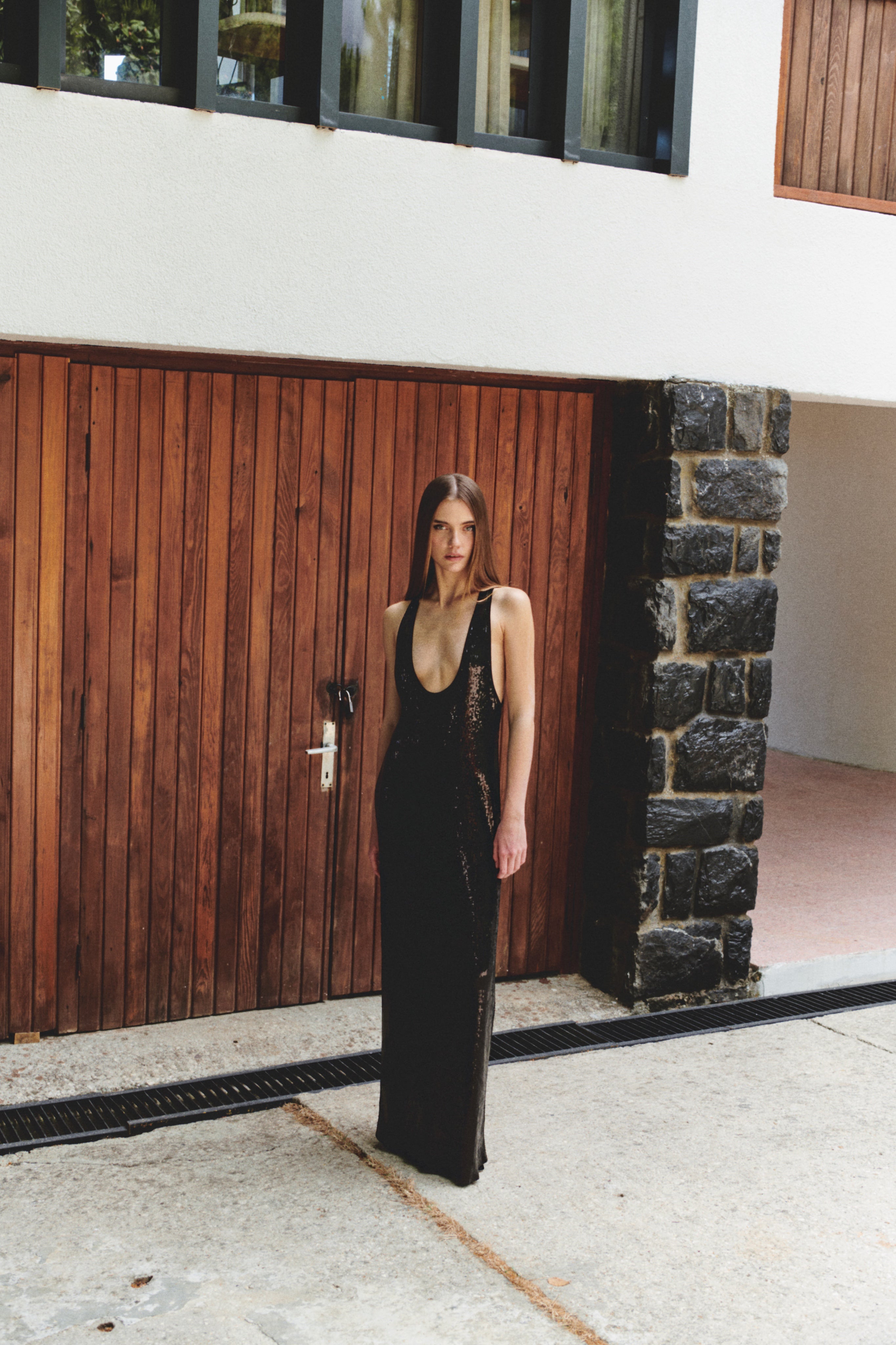 A maxi dress with a halter back and a deep U-neck.