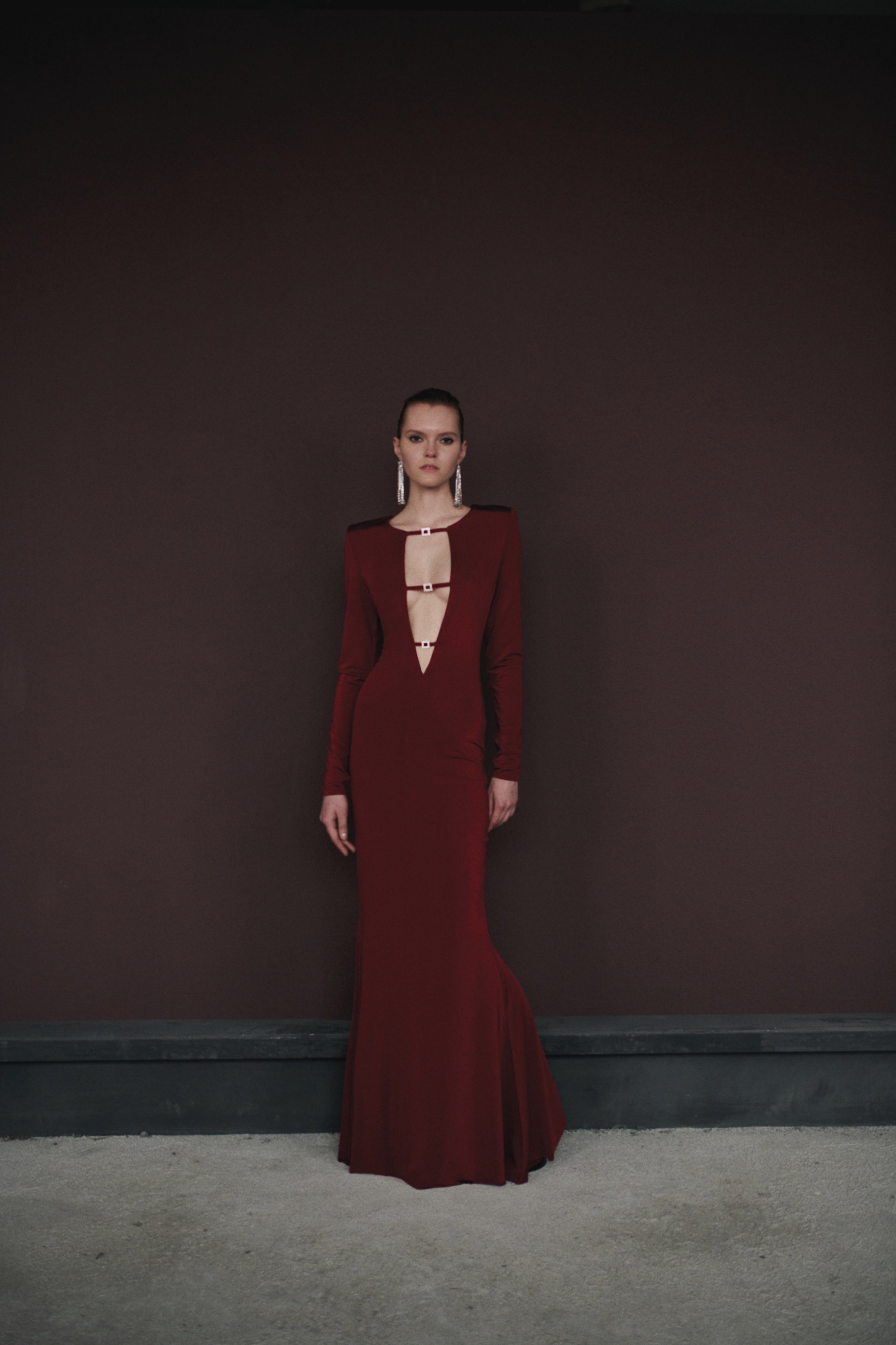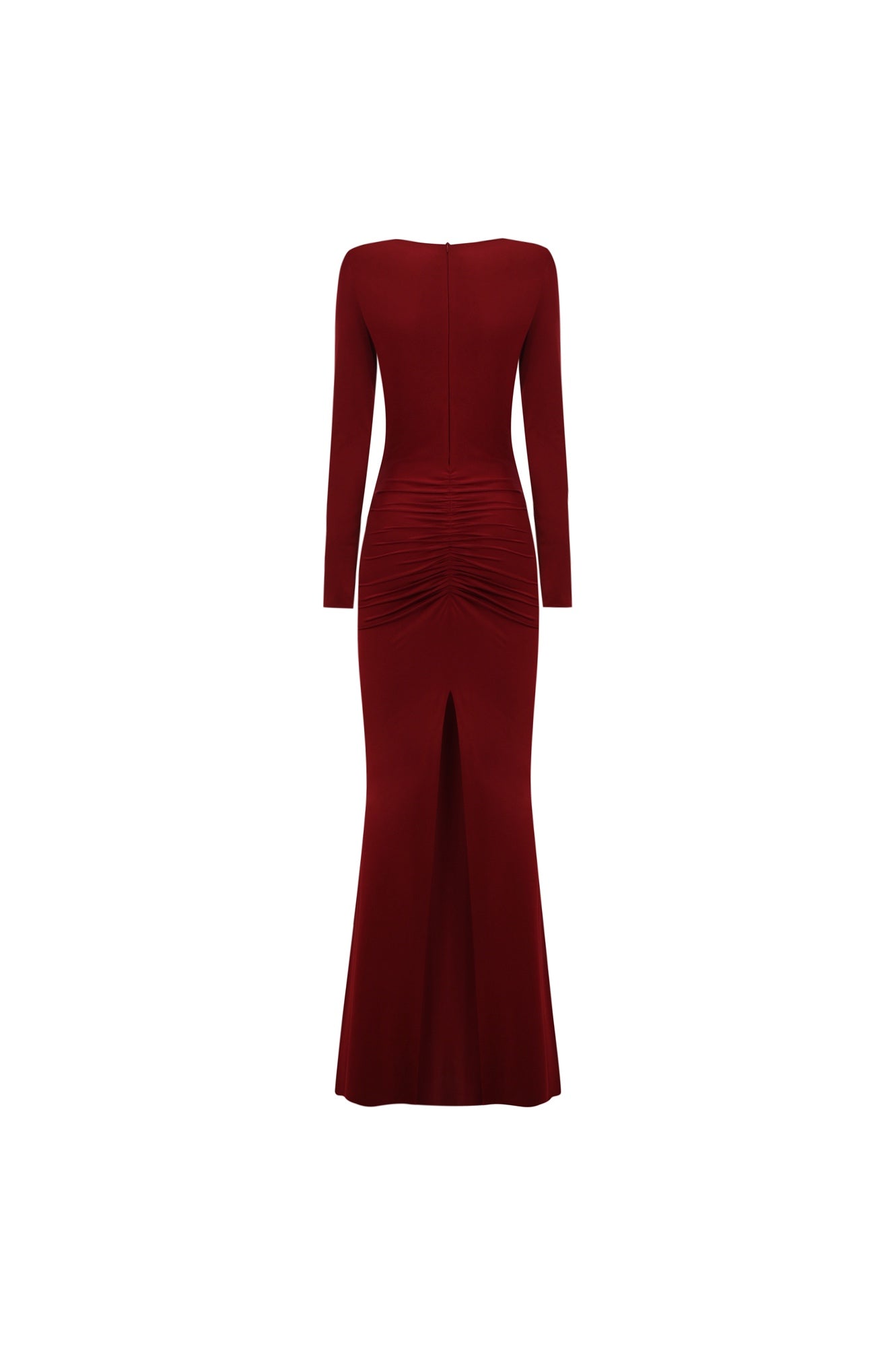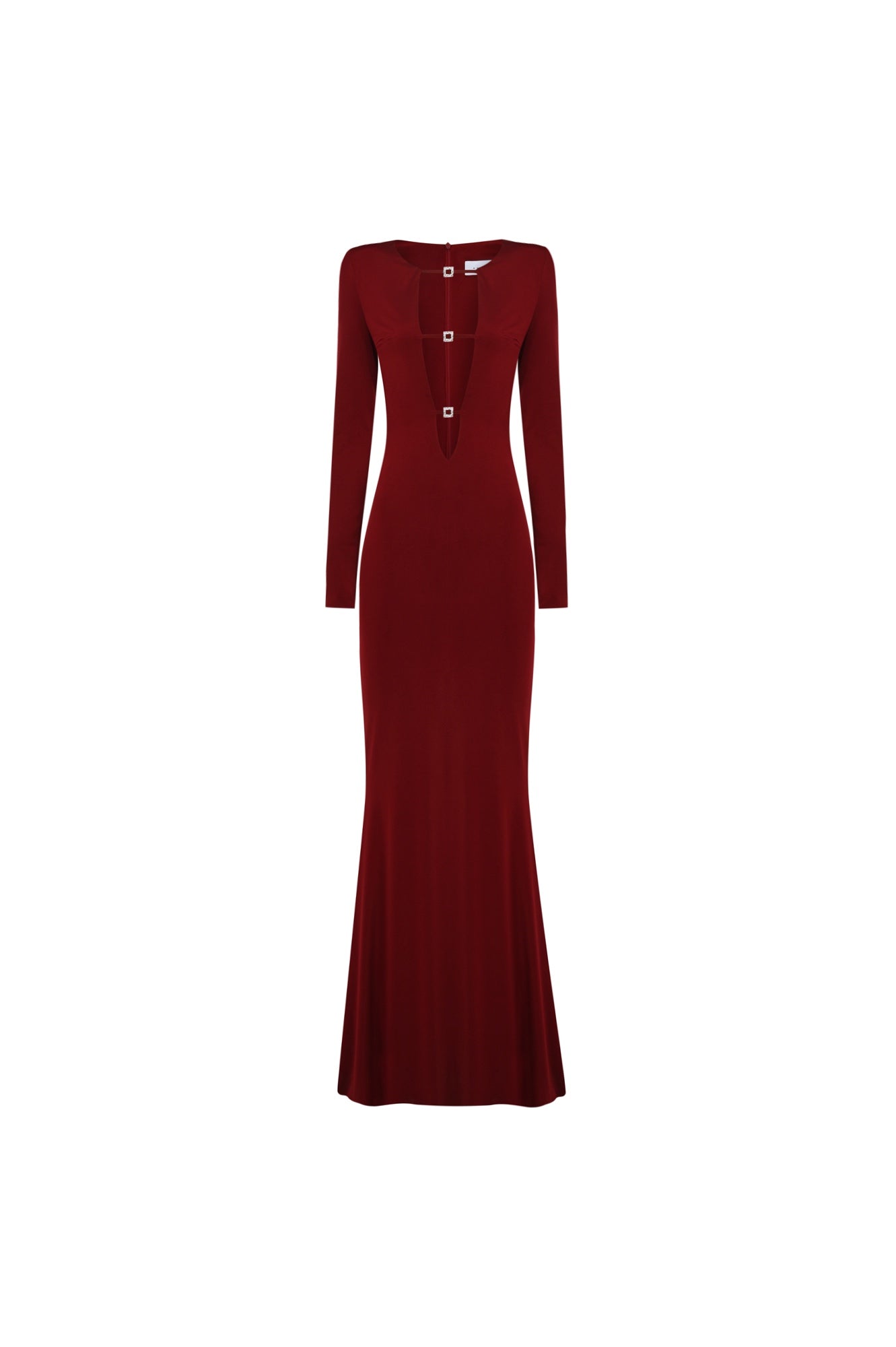 Long sleeve maxi dress with stone accessories with deep V-neck detail.