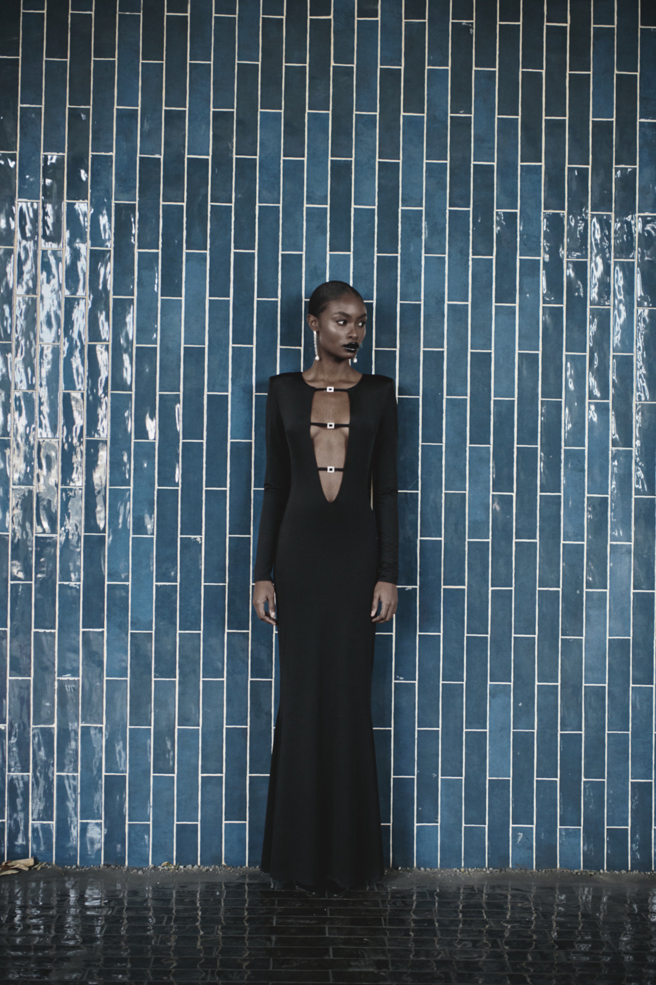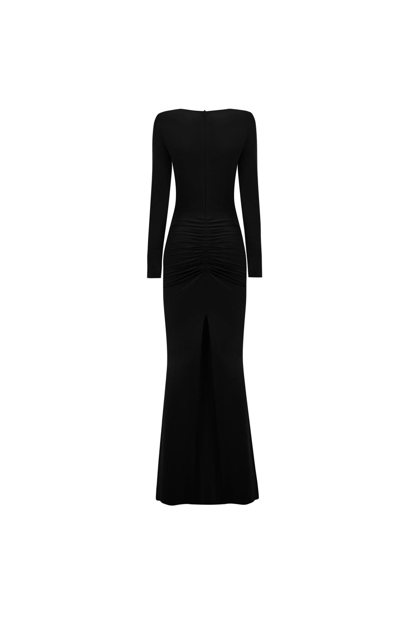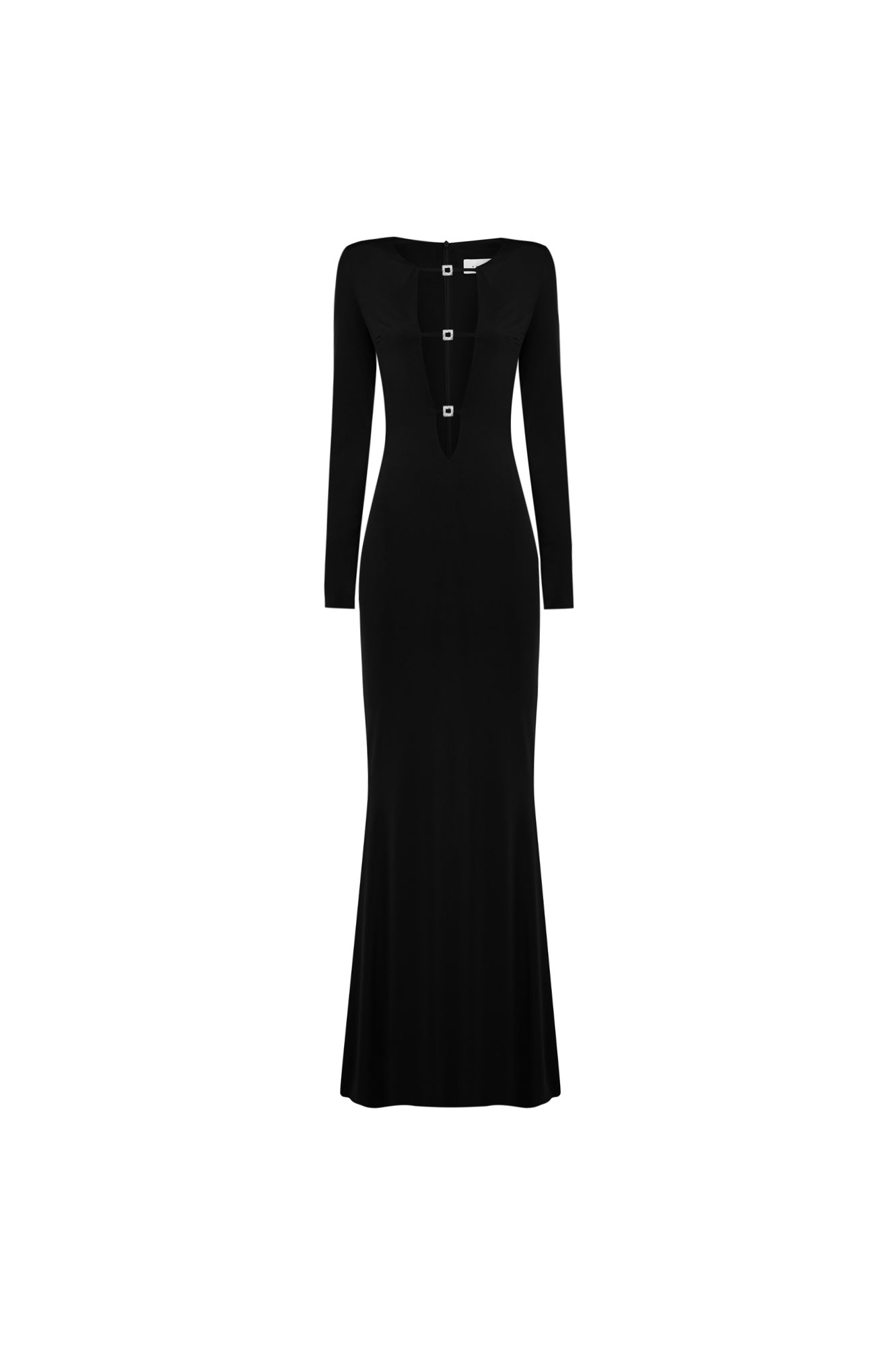 Long sleeve maxi dress with deep V-neck detail and stone accessories.