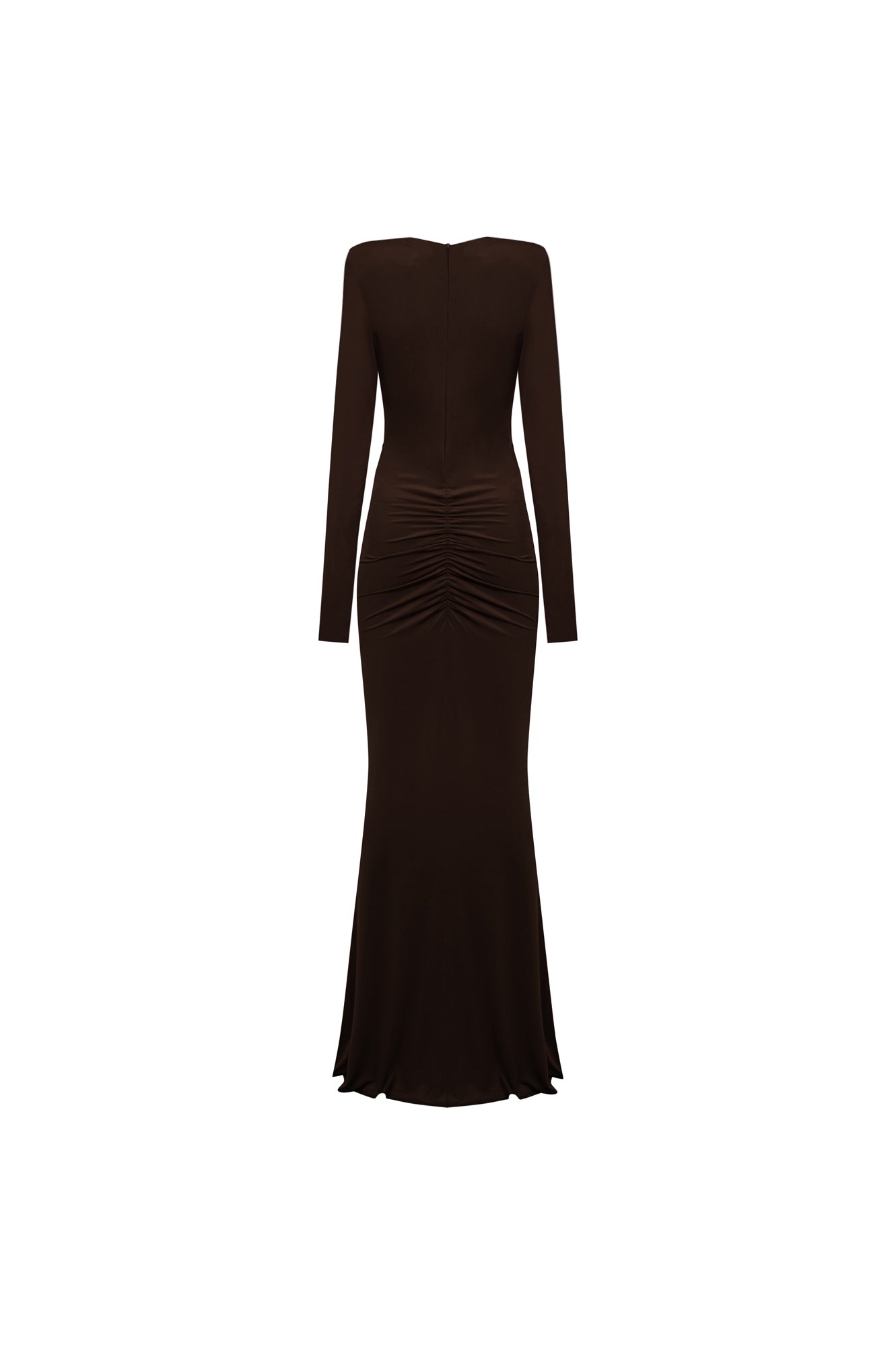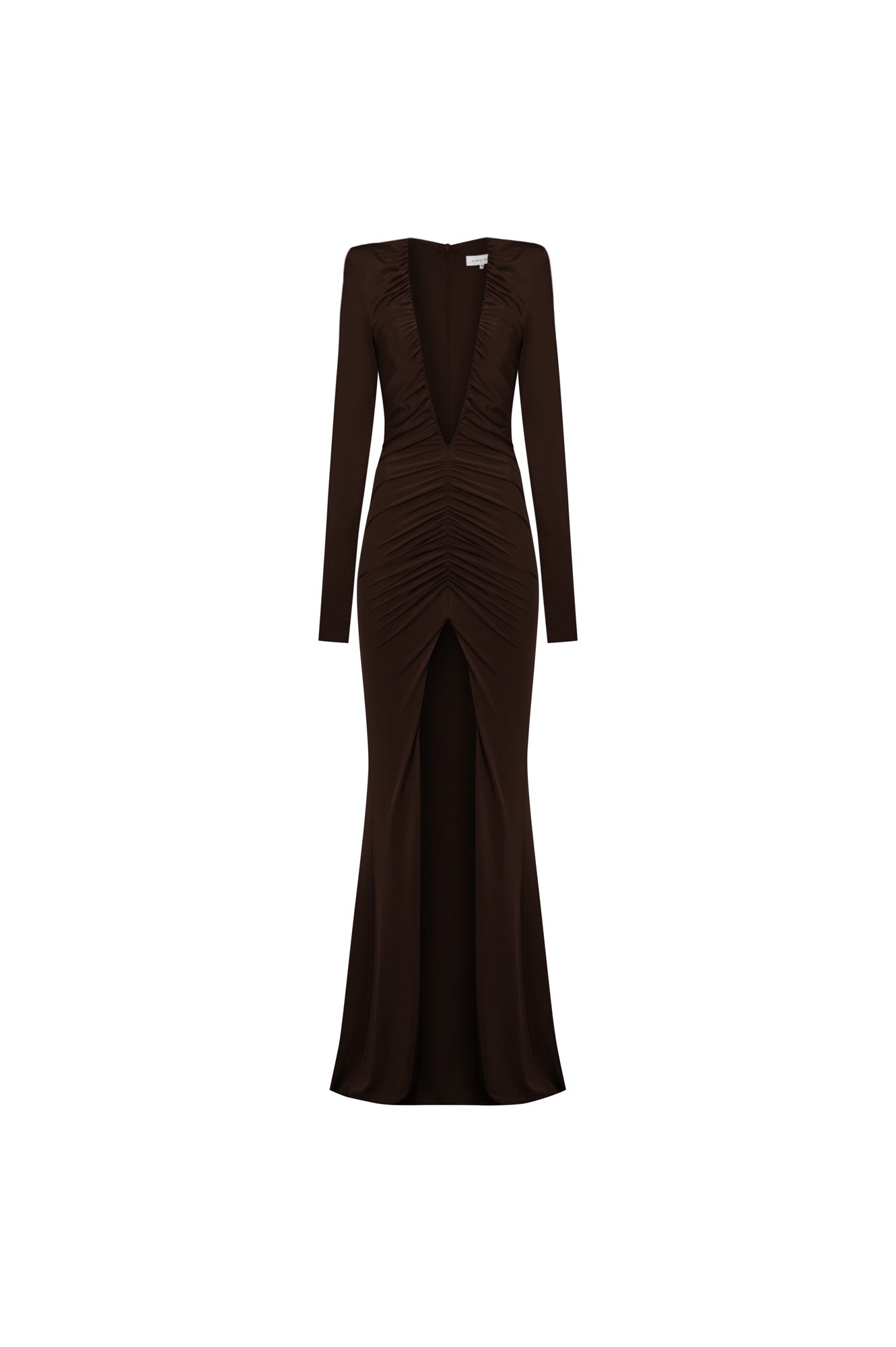 Long sleeve fish with deep V-neck, drawl detailDress.