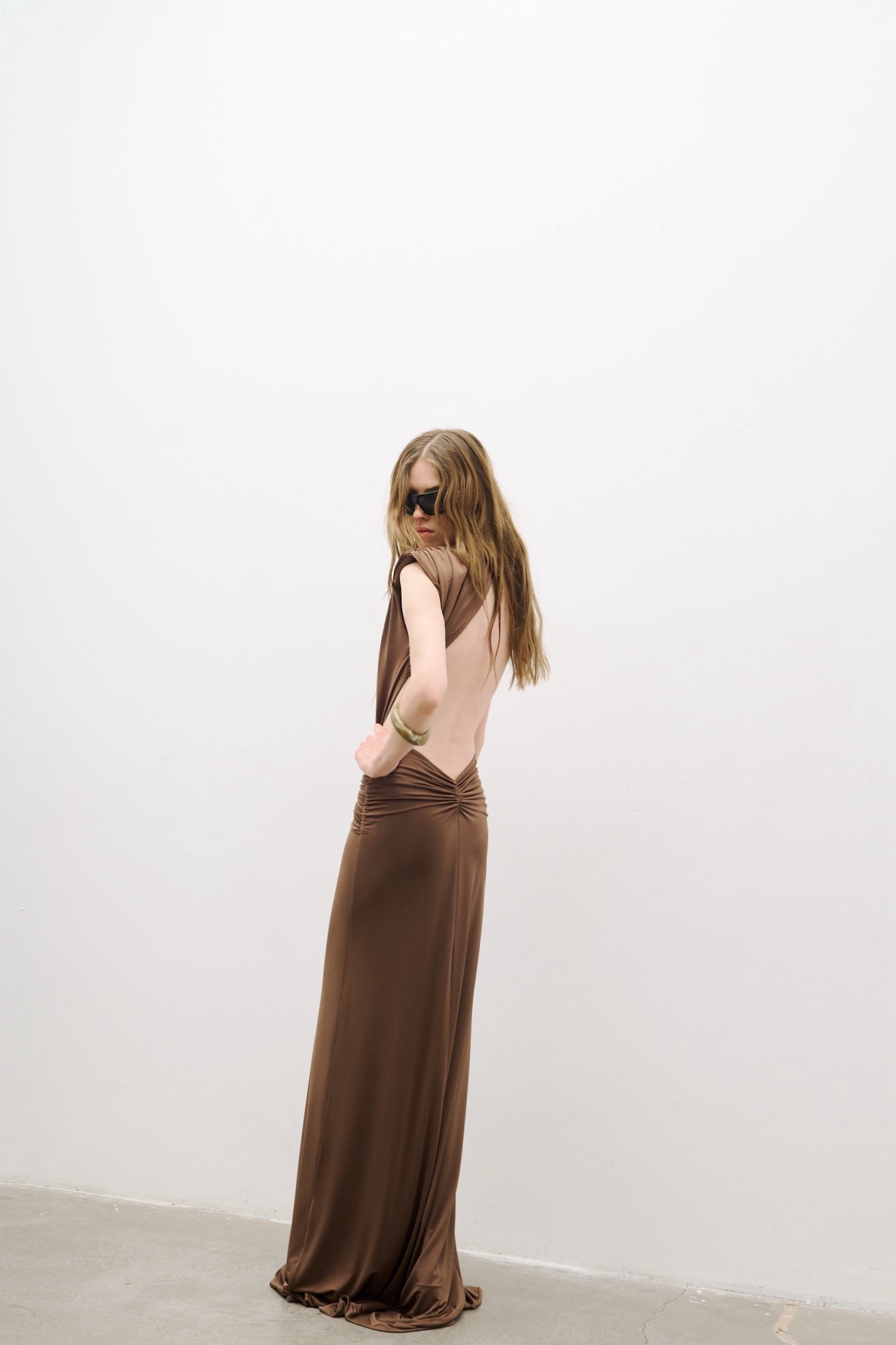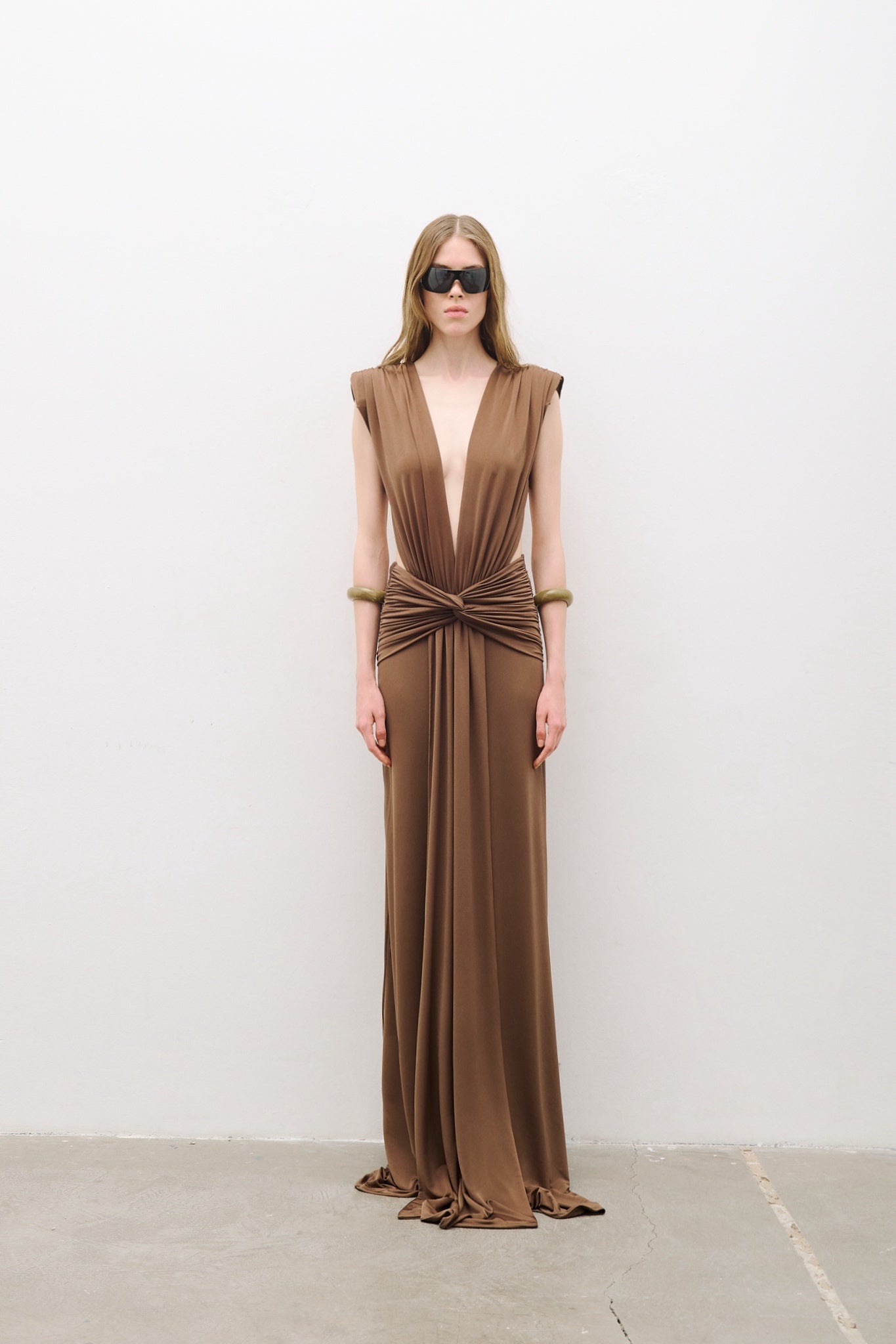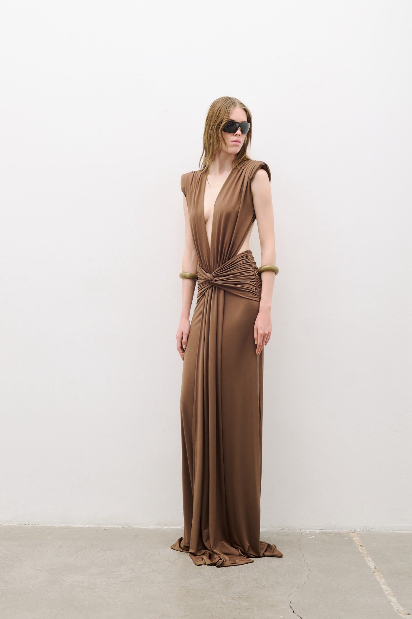 Ön ve arkadan V dekolteli, drape detaylı maxi elbise