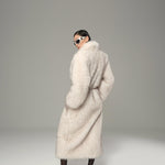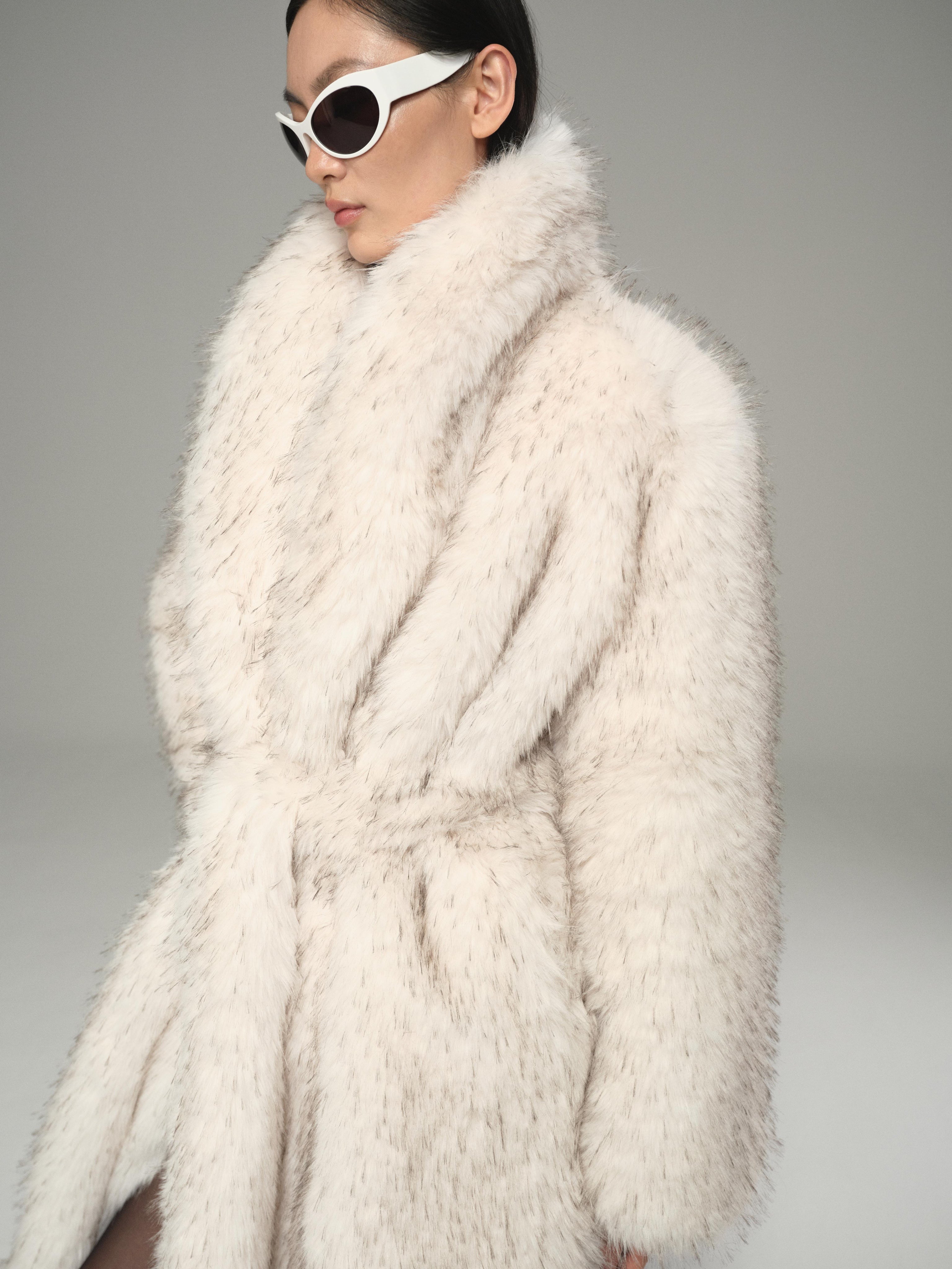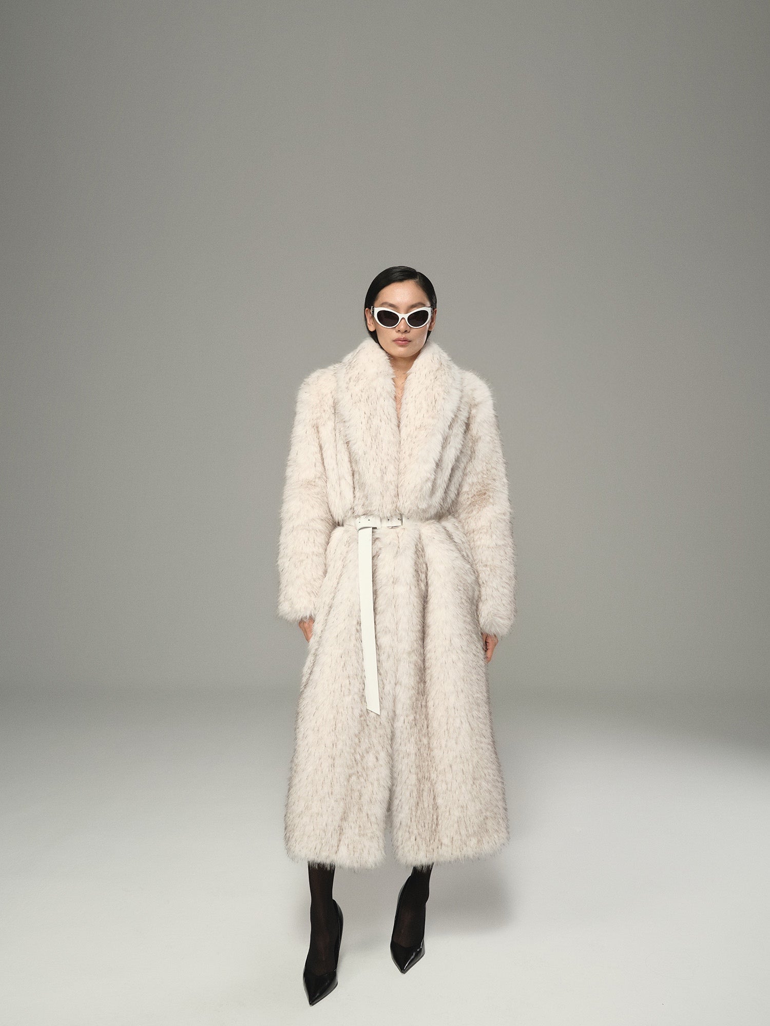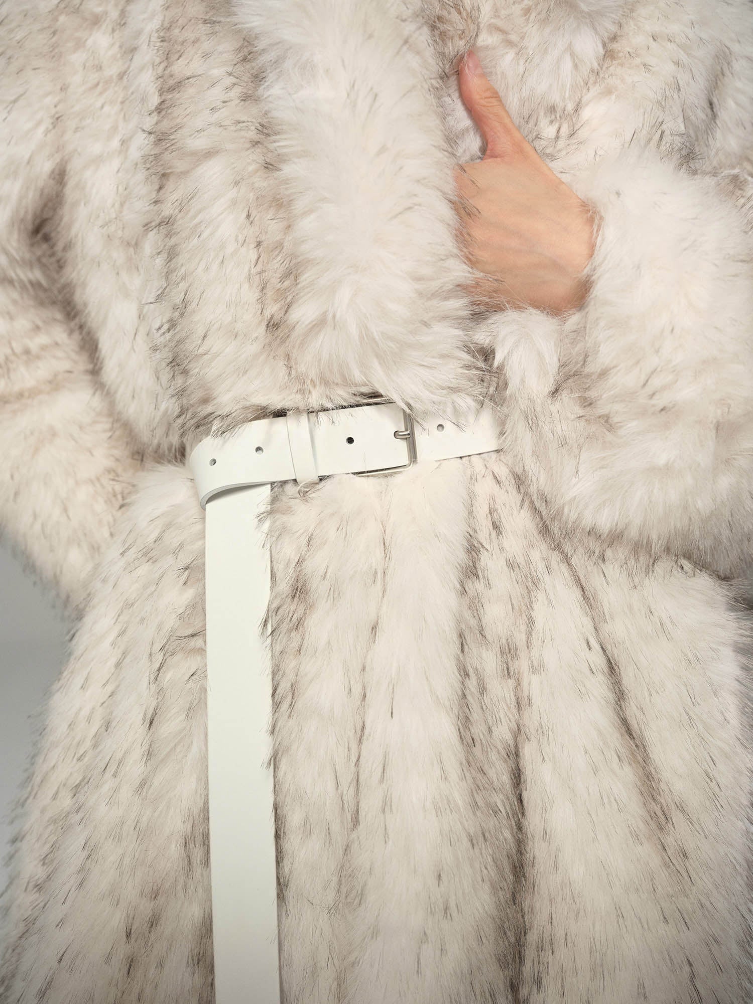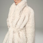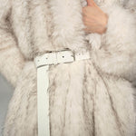 Kemer detaylı, kırçıllı beyaz uzun kürk