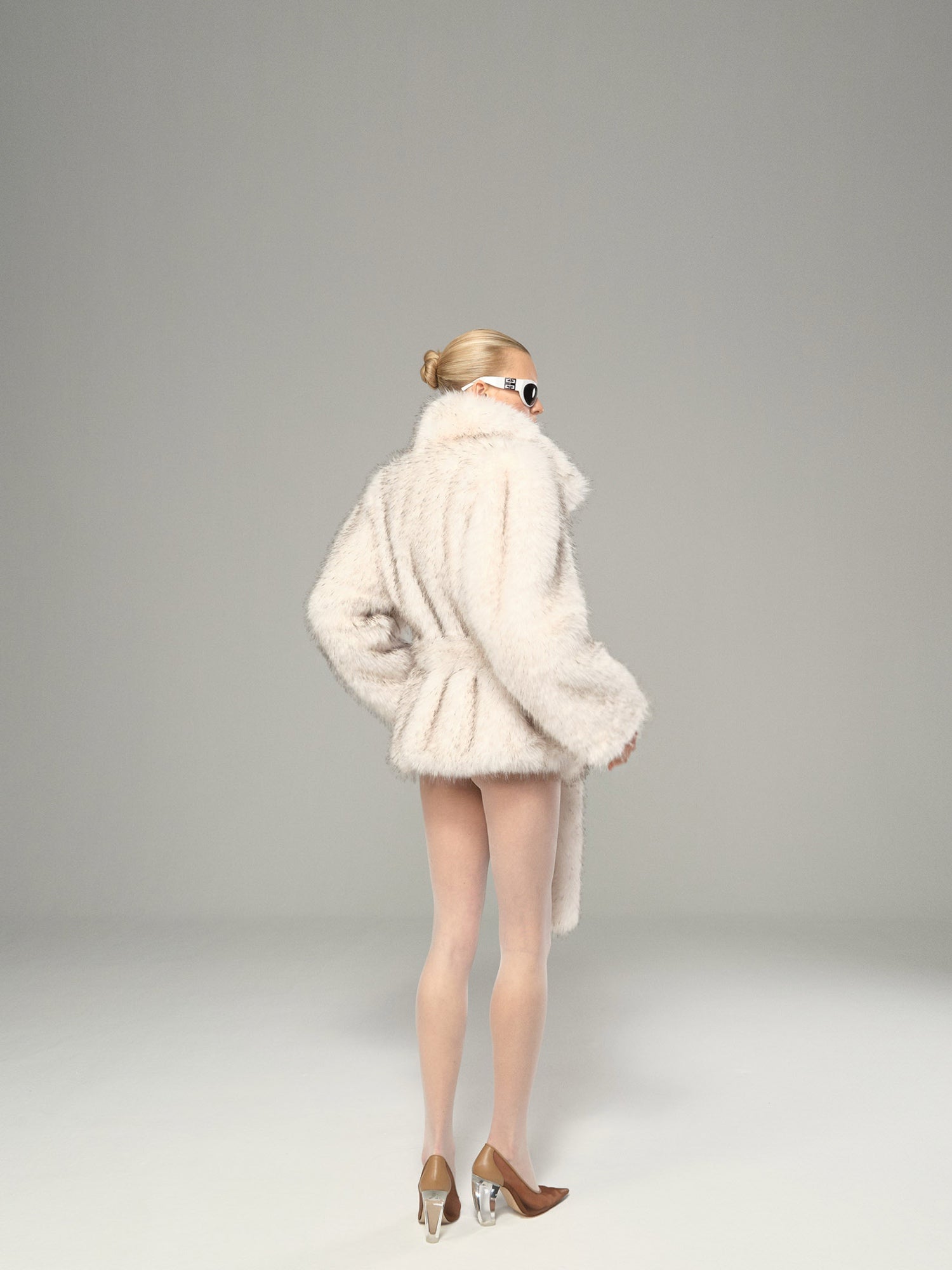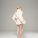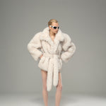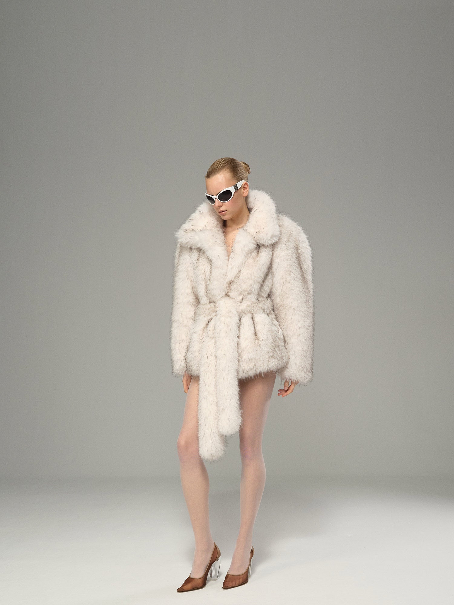 Kırçıllı, kemer detaylı beyaz kısa kürk
