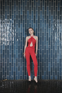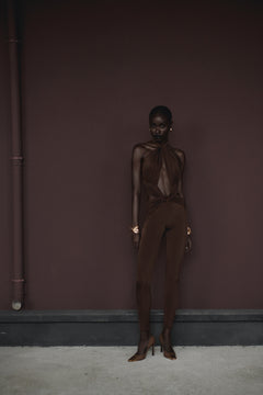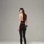 Sırt dekolteli, boyundan bağlamalı ve füzo tayt detaylı tulum